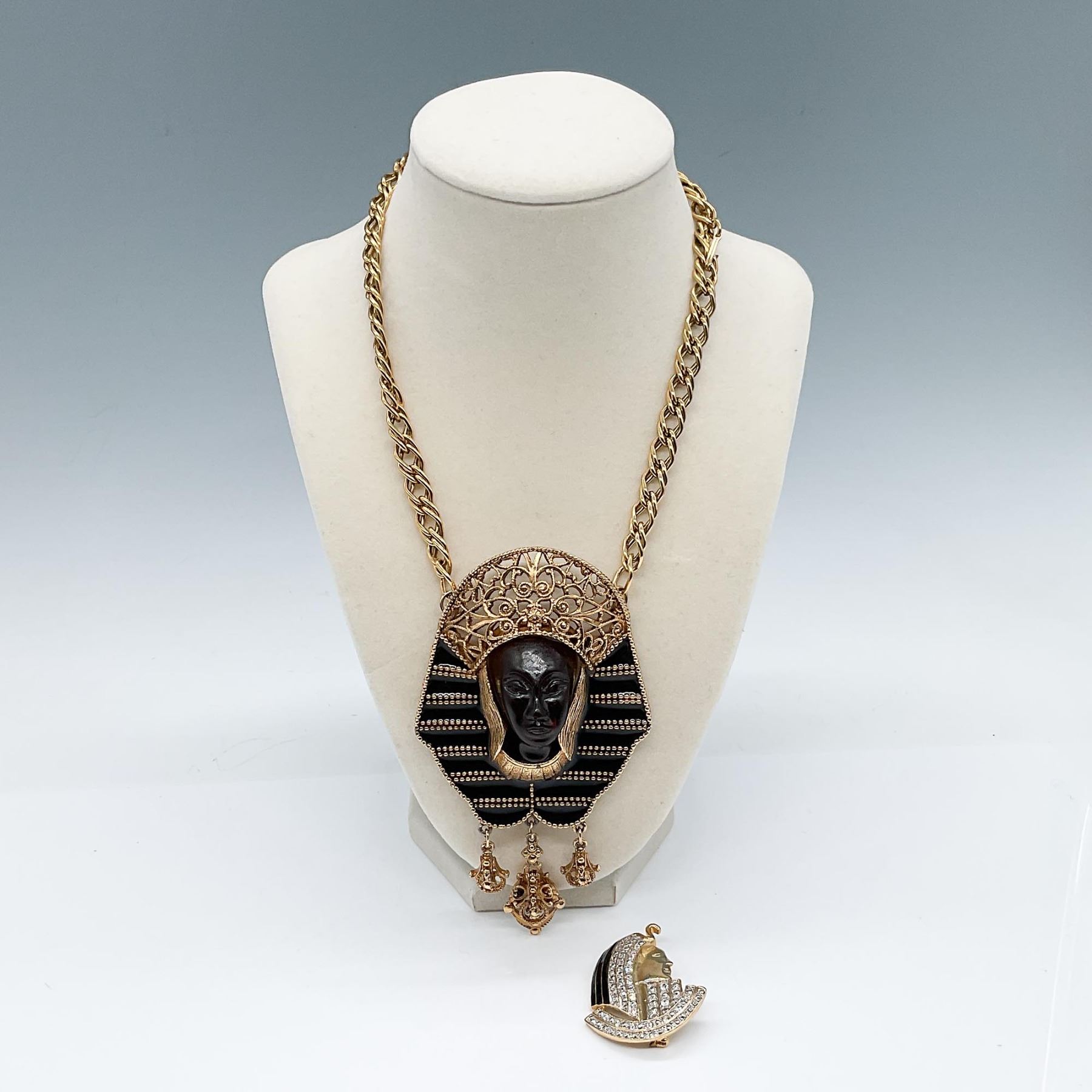 A striking 2pc jewelry lot featuring a Cleopatra-inspired gold-tone necklace and matching pendant. The necklace measures 23.75"L from clasp to clasp, showcasing a substantial chain with ornate detailing. The pendant measures 1.75"H, depicting an intricate design with Egyptian motifs, including a detailed face and elegant gold-tone filigree. Both pieces combine a bold aesthetic with vintage-inspired charm, making them ideal for collectors or enthusiasts of statement jewelry.