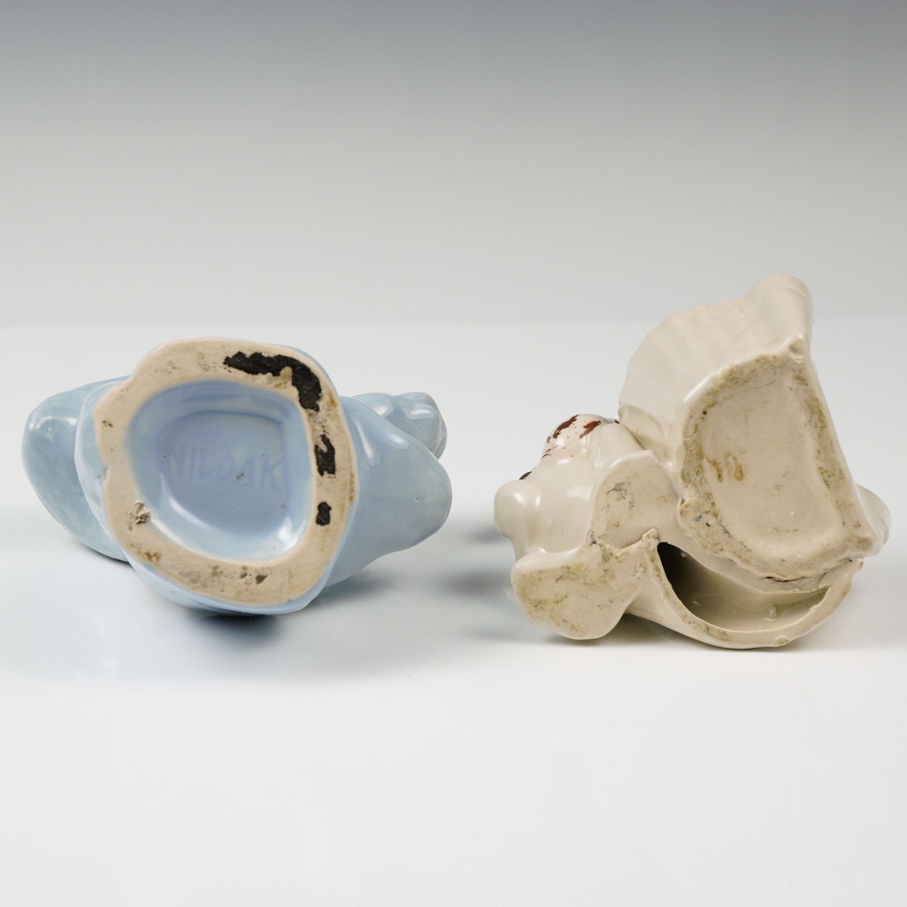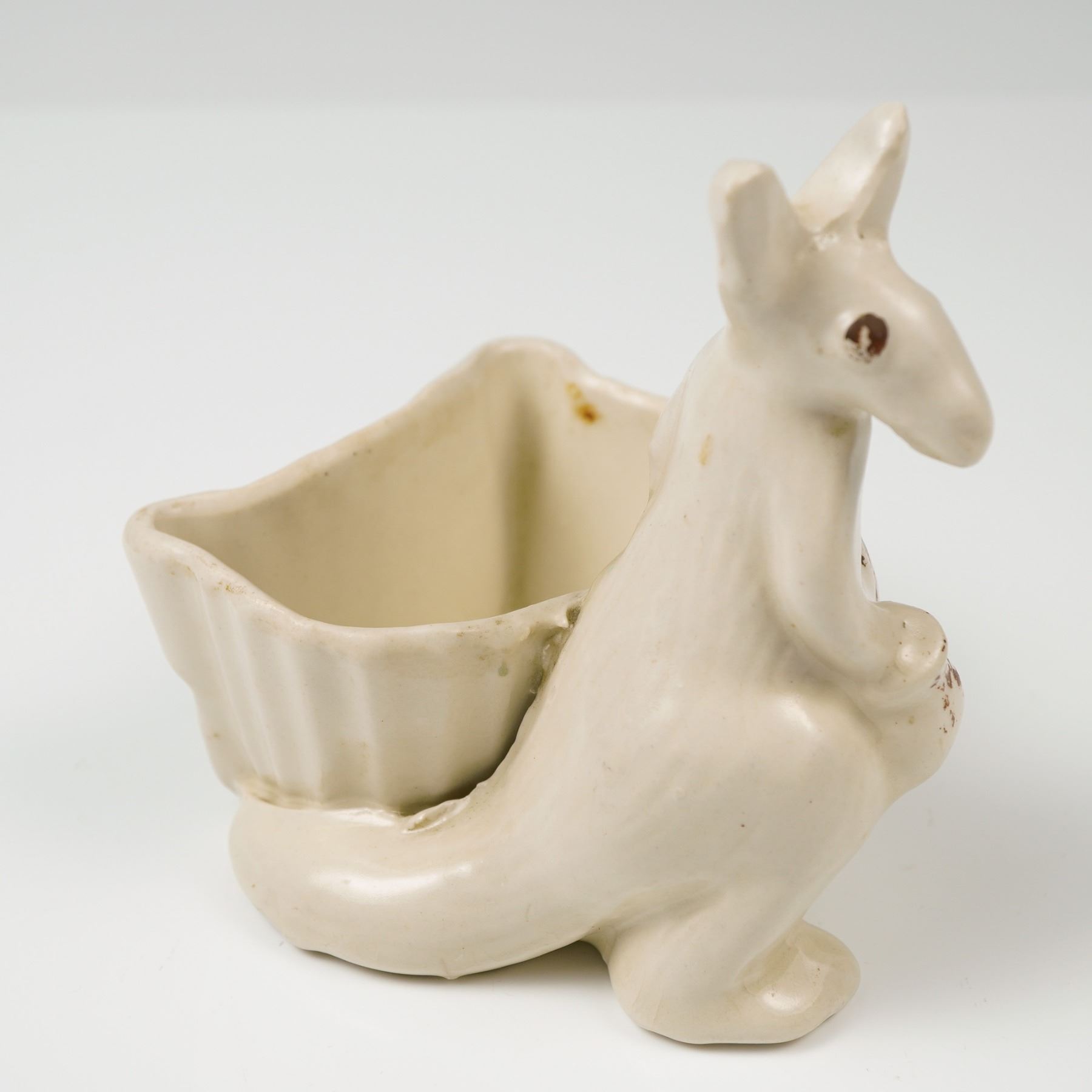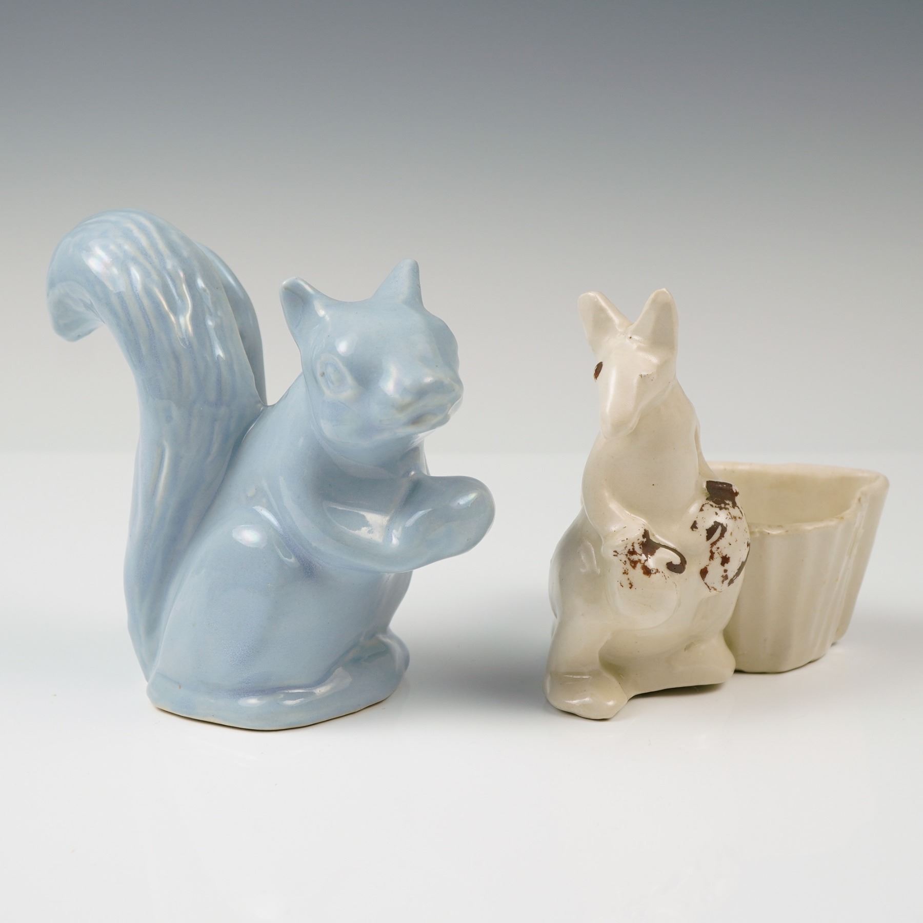 This whimsical pair features a Niloak blue ceramic squirrel with a dramatically arched tail and playful stance, alongside a cream glazed boxing kangaroo with sculpted gloves and upright posture. Both planters have charming silhouettes and stylized details, perfect for adding character to any shelf or windowsill. Niloak backstamp on squirrel. Largest item measures: 6.25"L x 3"W x 6"H.