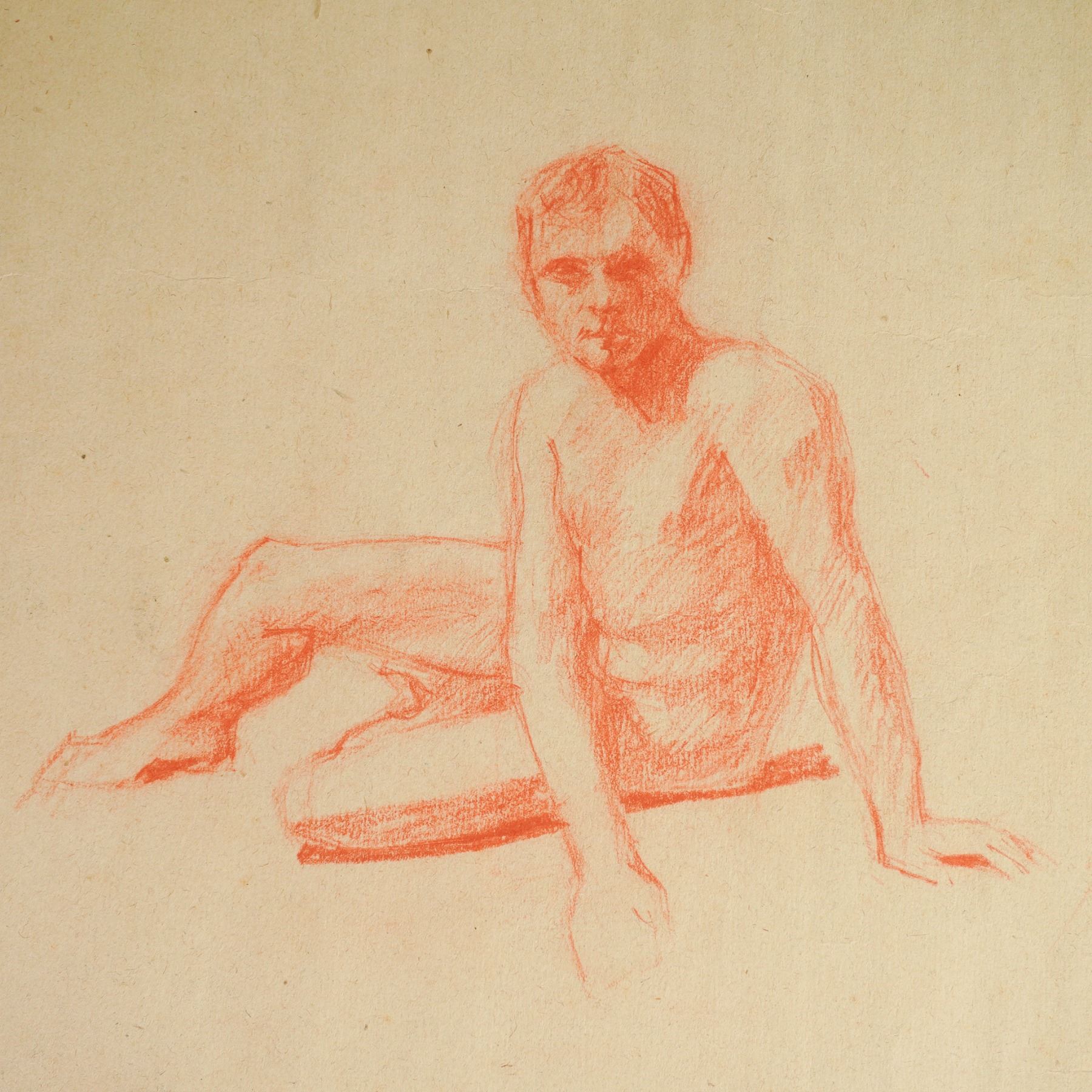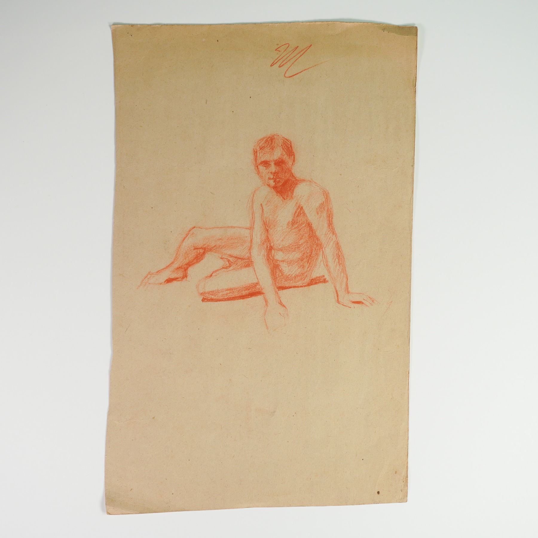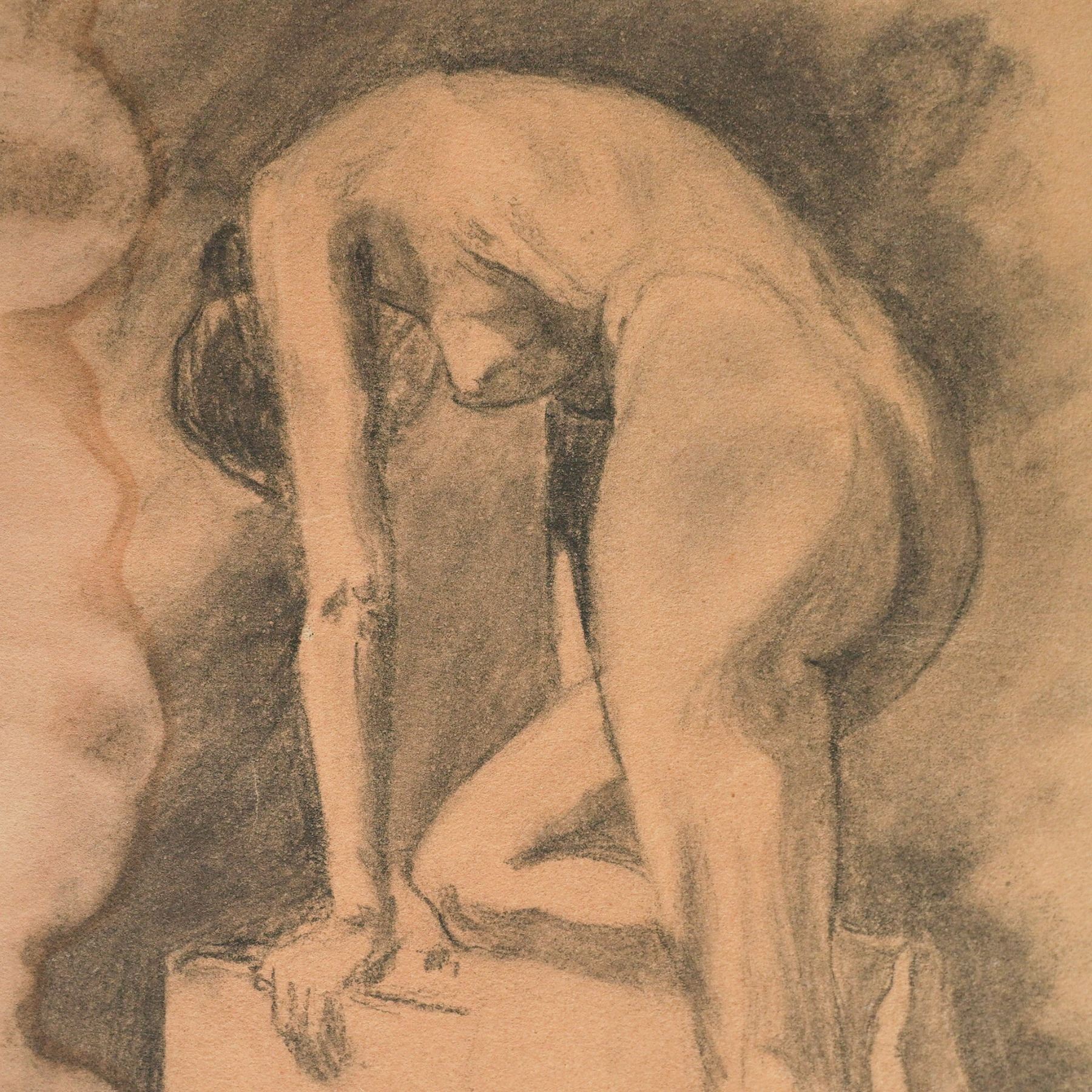 Pair of original nude figure sketches, one executed in burnt red pencil on laid paper, the other in black charcoal on toned paper. The terracotta-toned sketch features a seated male figure with fine anatomical detail. The second sketch presents a female figure in a dramatic pose with bold shadowing and contour work, showing water staining along the left margin. Both works are unframed and on lightweight brown sheets, each showing age and handling wear consistent with older academic or life drawing studies.