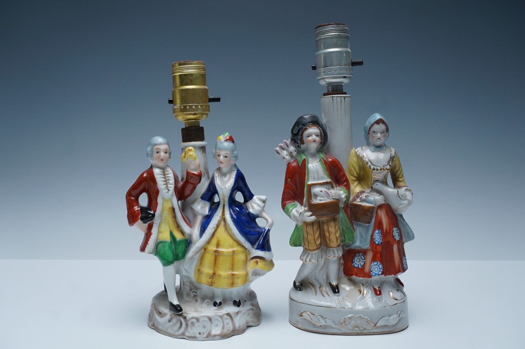 A charming pair of porcelain figural table lamps, marked "Made in Occupied Japan." Each lamp features a detailed hand-painted design depicting elegantly dressed 18th-century-style figures in vibrant attire. The first lamp showcases a courting couple in aristocratic fashion, while the second lamp features a rural scene with a man carrying a basket and a woman holding a lamb. The porcelain bases exhibit rich colors with gilt accents, characteristic of Occupied Japan-era decorative pieces (1945-1952). Both lamps retain their original sockets but do not include shades. Lamps measure 10" and 11"H.