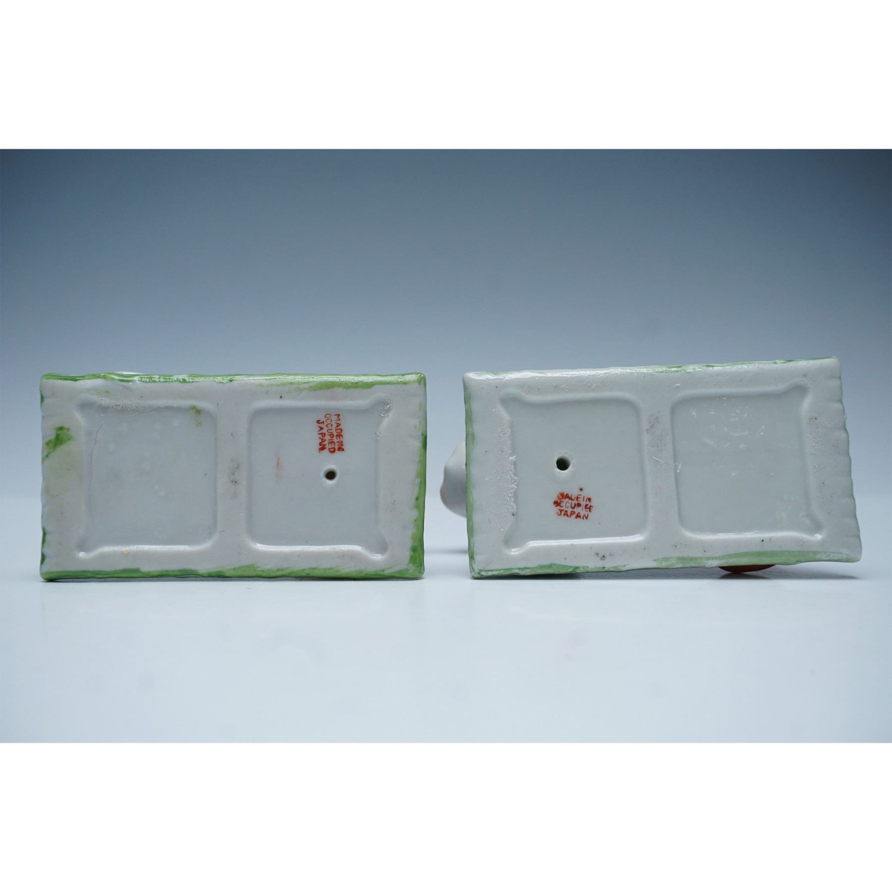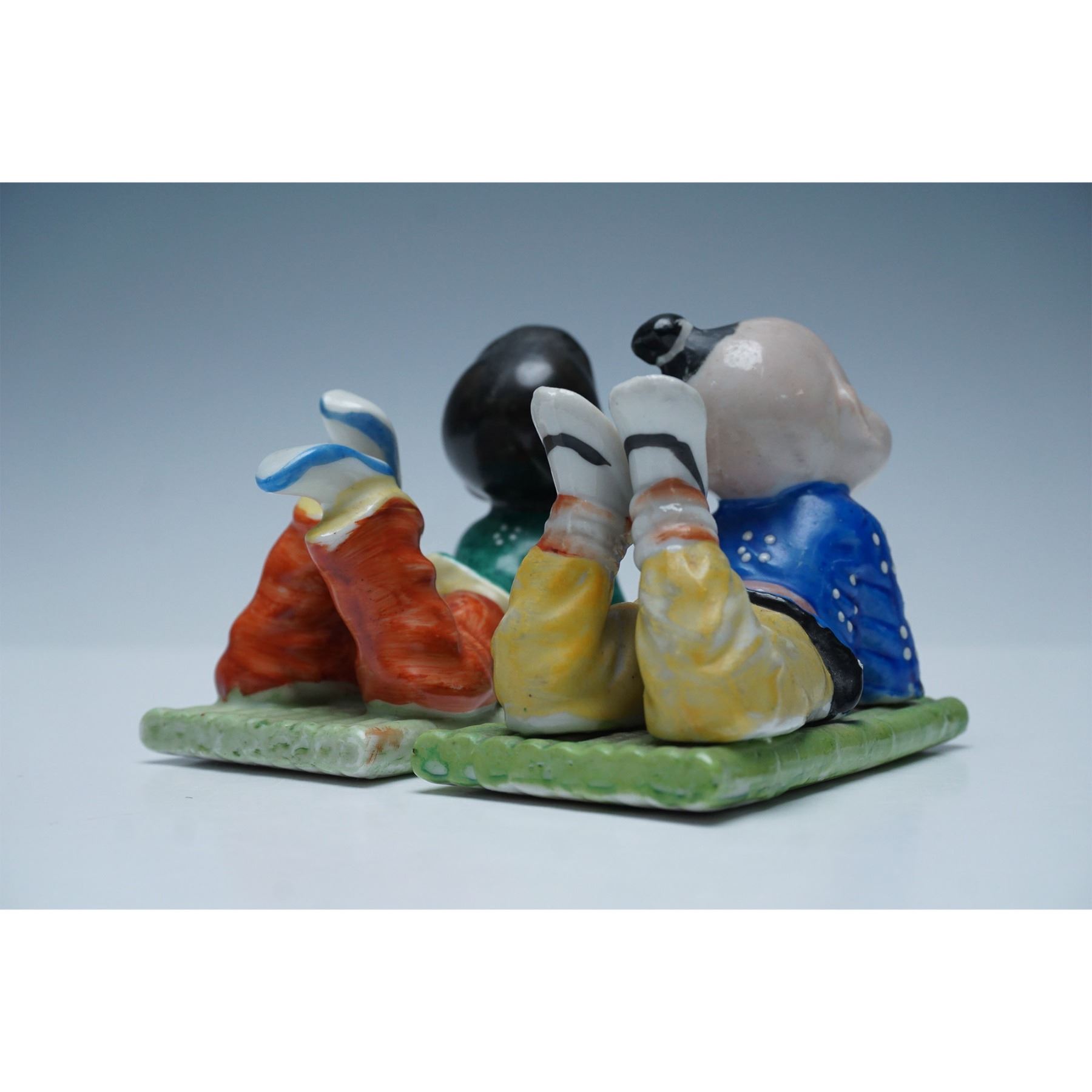 A charming pair of hand-painted porcelain figurines marked "Made in Occupied Japan," depicting a boy and a girl reclining on green mats. These whimsical figures feature expressive faces with rosy cheeks and traditional-style clothing in vibrant blue and green hues with delicate polka dot accents. Produced during the post-World War II Occupied Japan period (1945-1952), these collectible figurines showcase fine craftsmanship and playful design, making them a wonderful addition to any vintage porcelain collection.