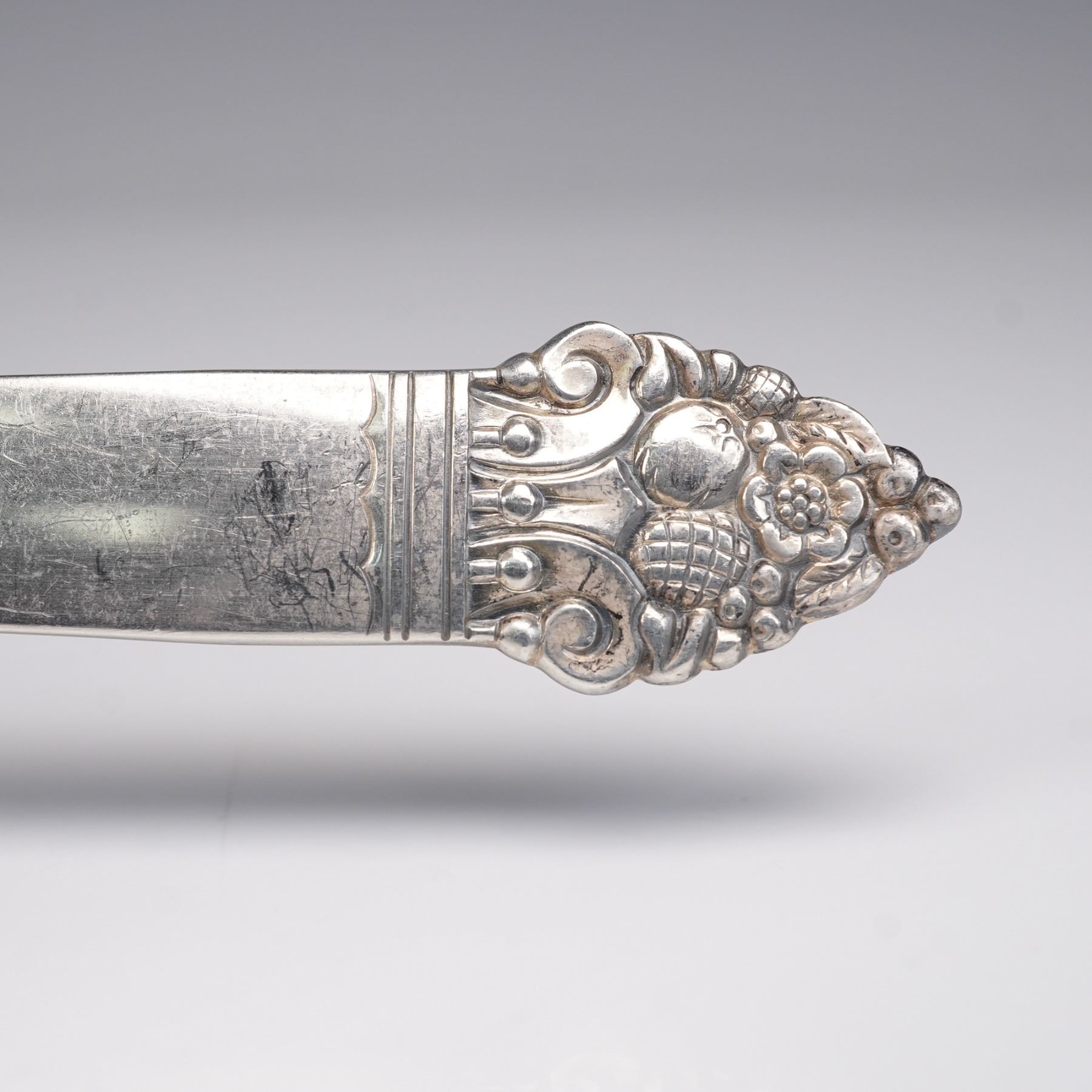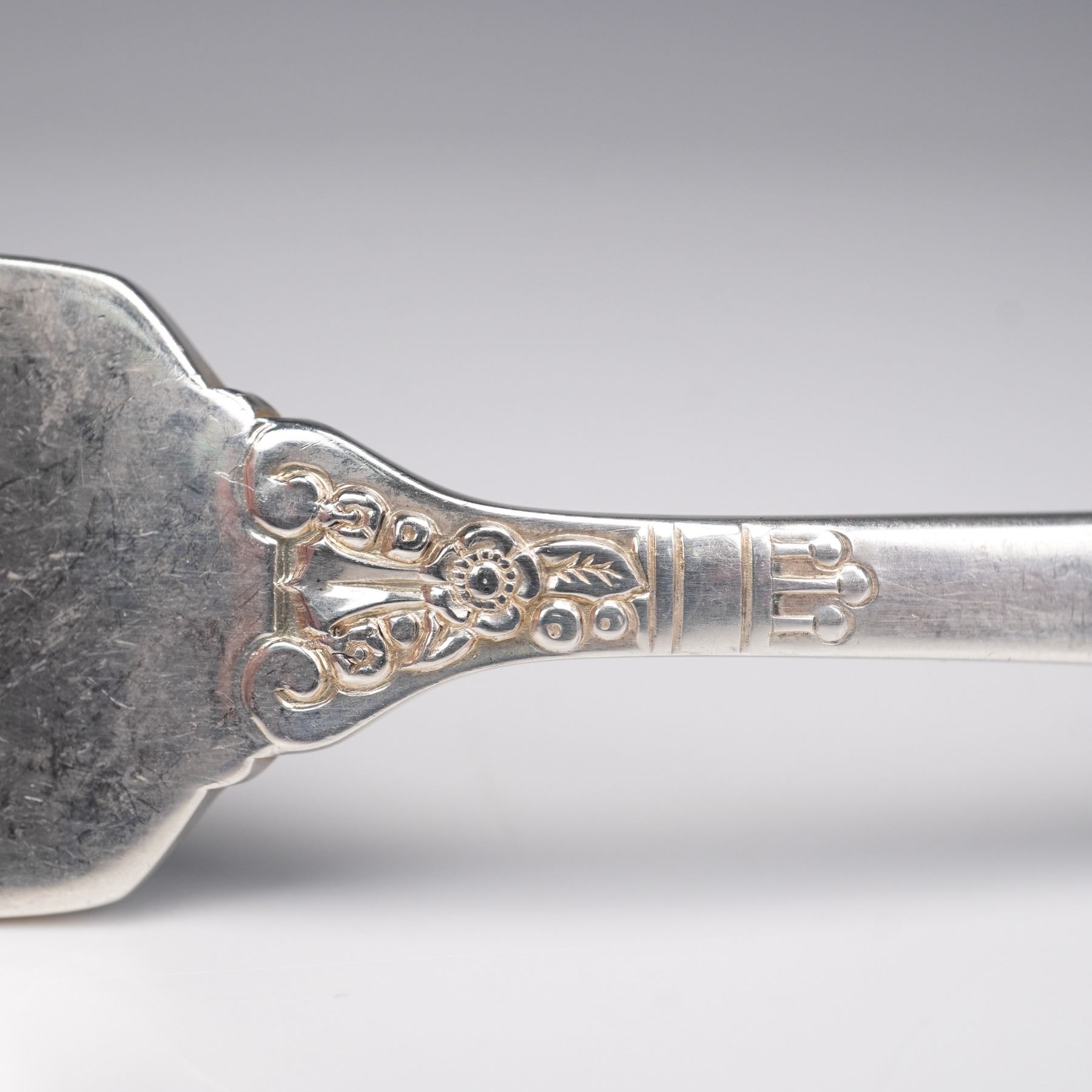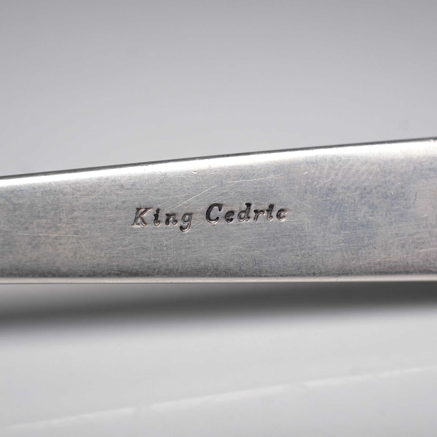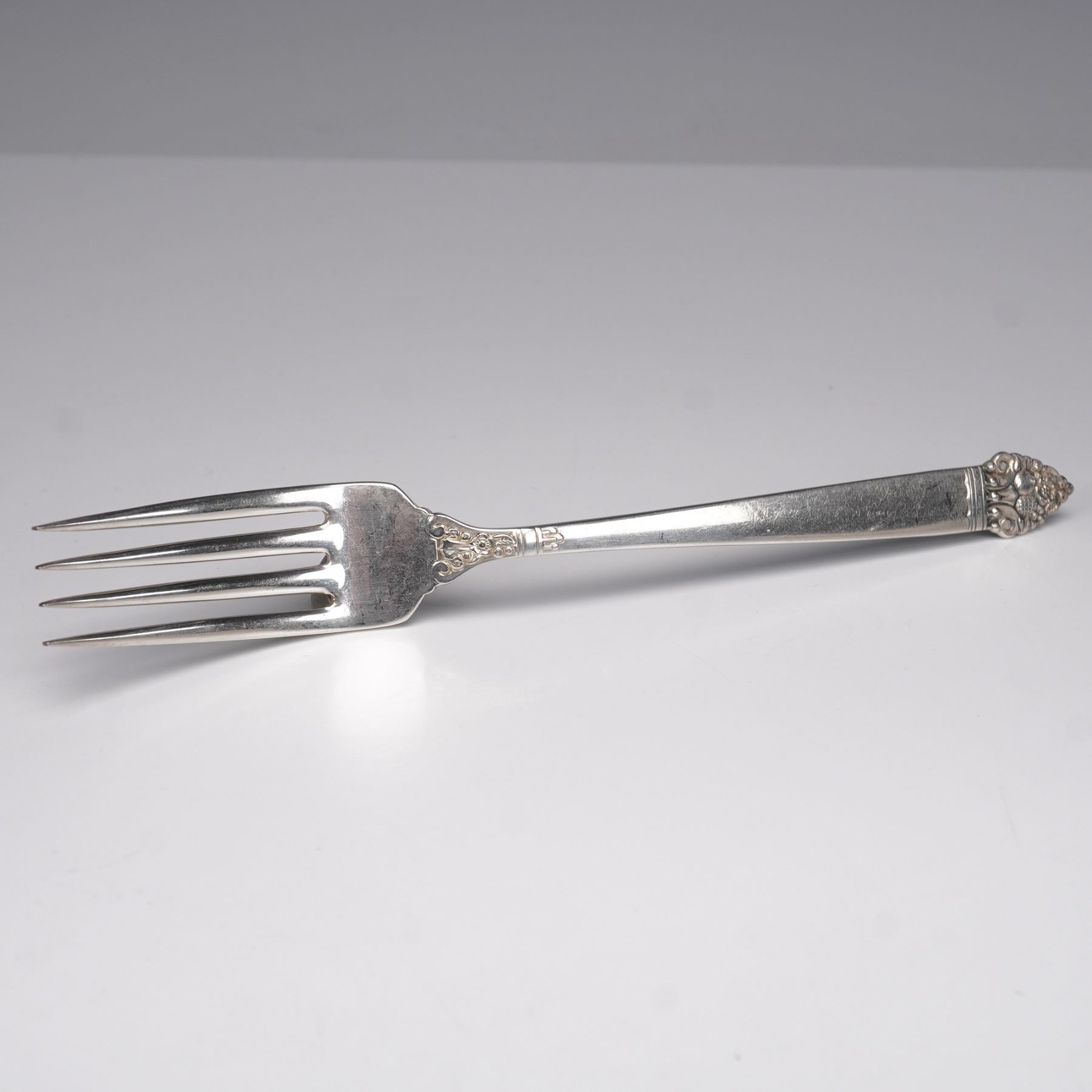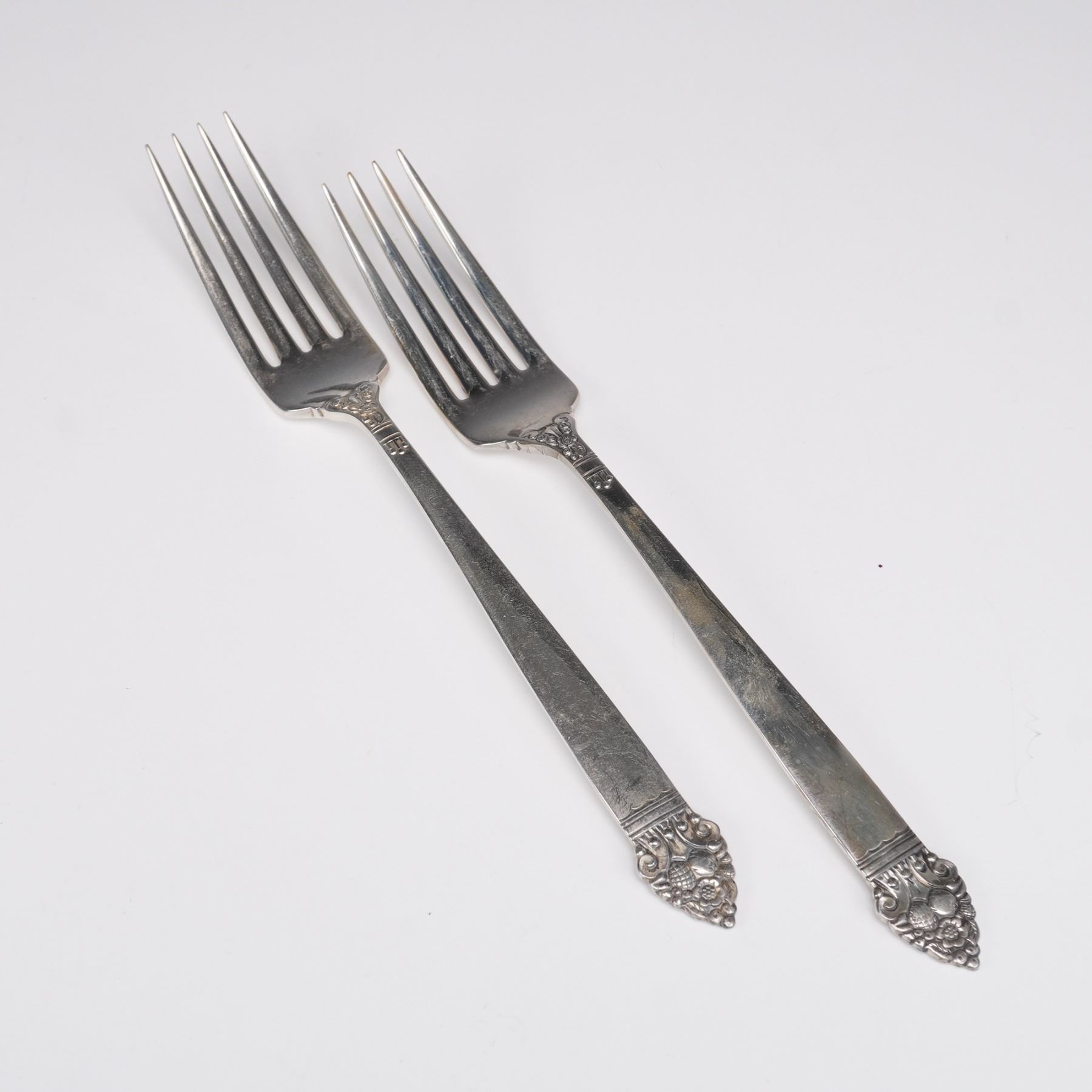 Pair of Oneida sterling silver dinner forks in the King Cedric pattern, featuring ornate floral and fruit motifs in a richly detailed handle design. This classic and elegant pattern was first introduced in 1933 and remains a sought-after collectible for fine dining and silver enthusiasts. Total weight 2.916 troy oz.