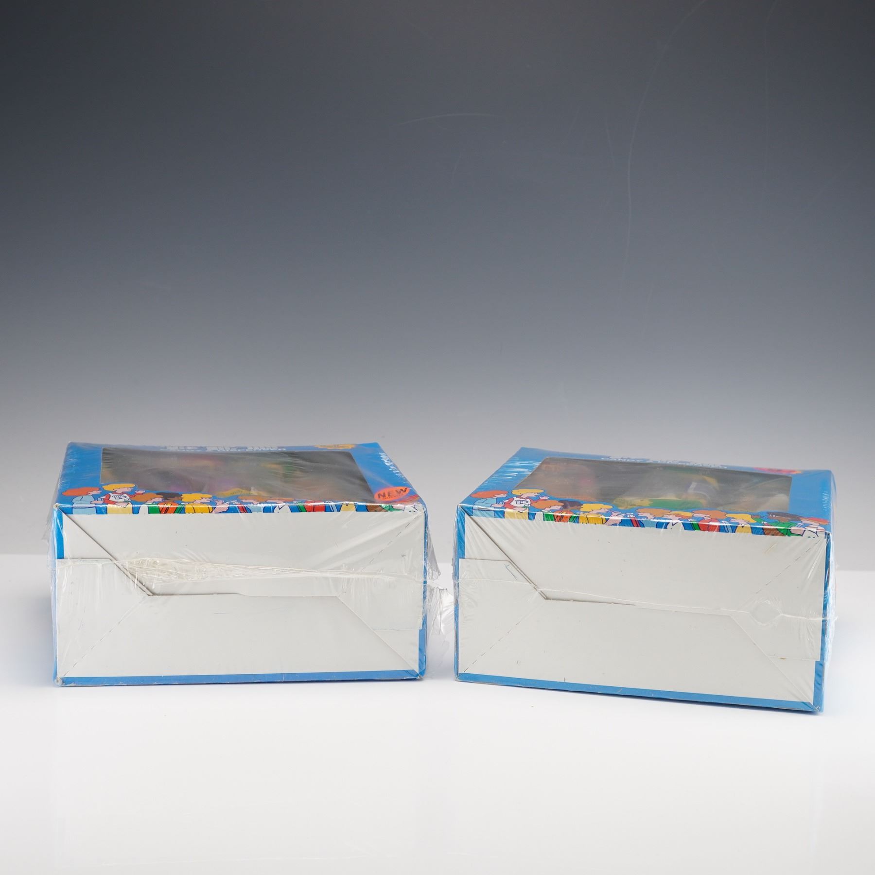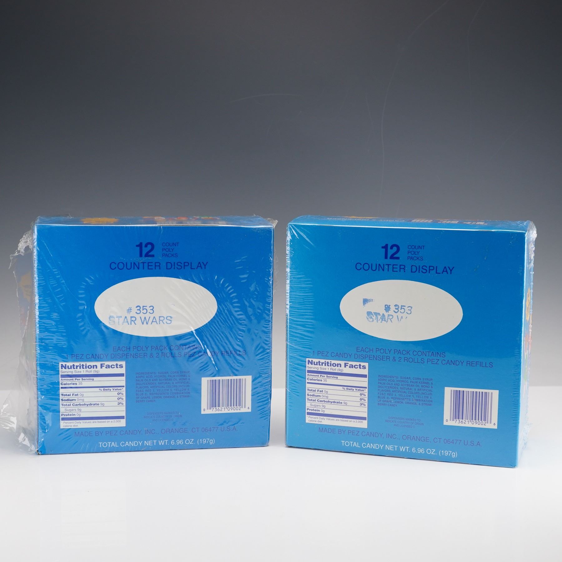 This listing features a set of two PEZ counter display packs, each containing 12 poly packs. Each poly pack includes one PEZ candy dispenser and two rolls of PEZ candy. These items are sealed and remain in their original packaging. The dispensers are themed around Star Wars characters, offering a nostalgic collectible experience for fans of the iconic series. Both display boxes are packaged in plastic wrap for preservation. The total candy weight is 6.96 oz (197.9 g) per box.