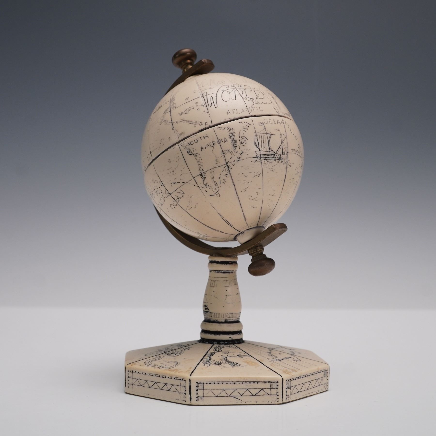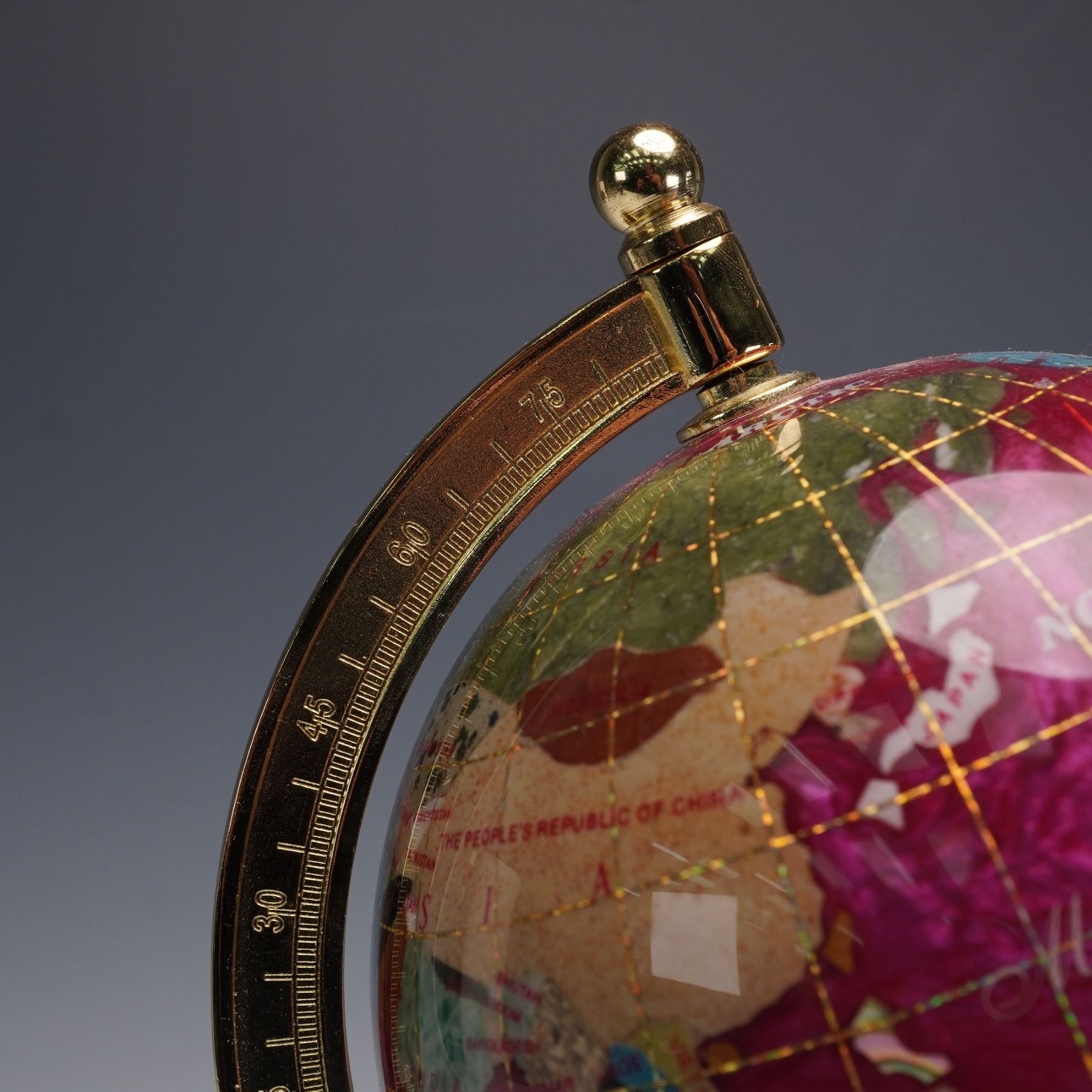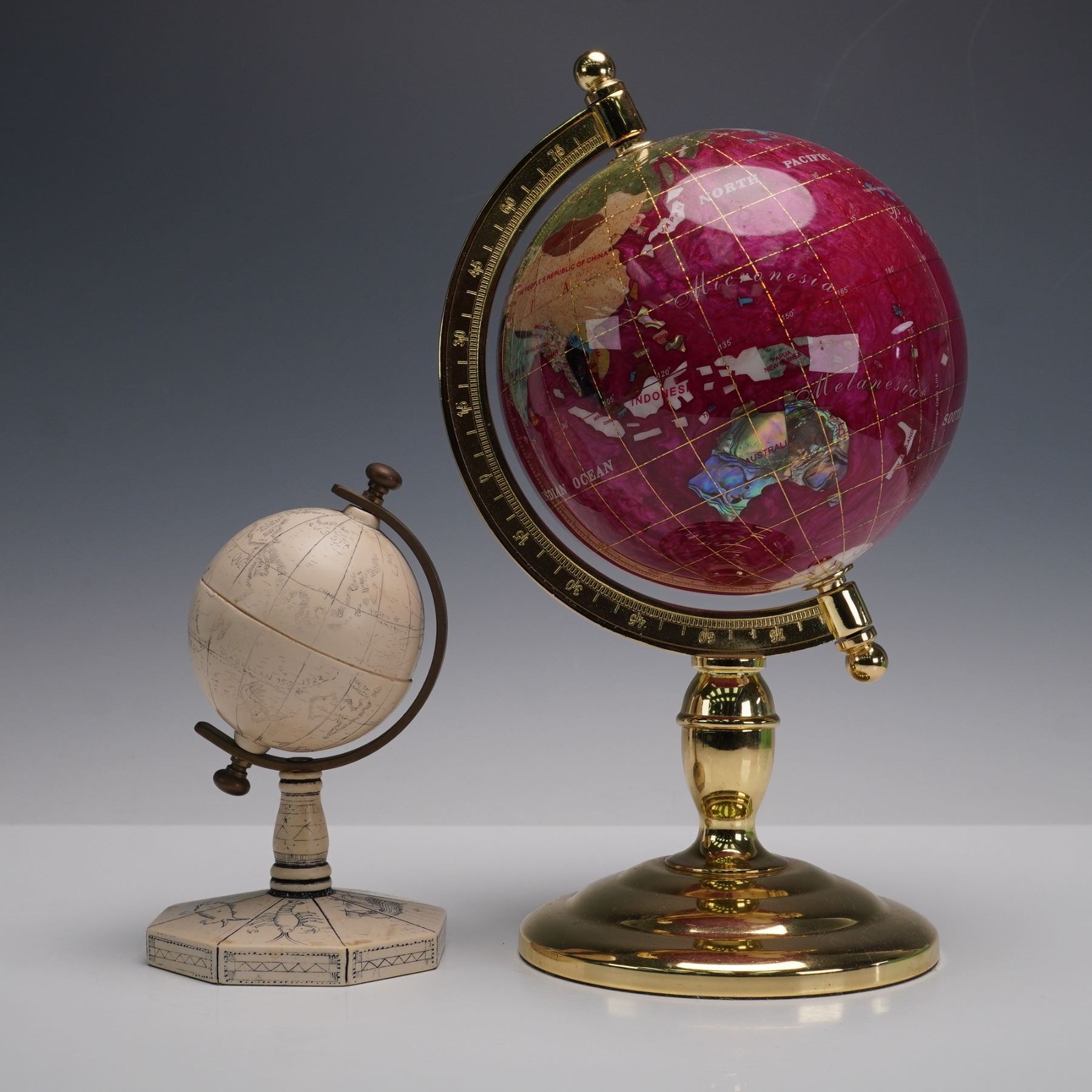 A two-piece lot featuring a vintage-style Comoy's miniature globe, marked "Made in England," with an ivory-toned body, etched cartographic details, and mounted on an octagonal base with engraved designs. Accompanying it is a larger contemporary gemstone inlaid globe, richly detailed with colorful stone sections representing countries, set with gilt latitude lines and mounted on a polished brass stand. Together, this pair presents a striking contrast of old-world charm and modern decorative craftsmanship, ideal for study, office, or library display.