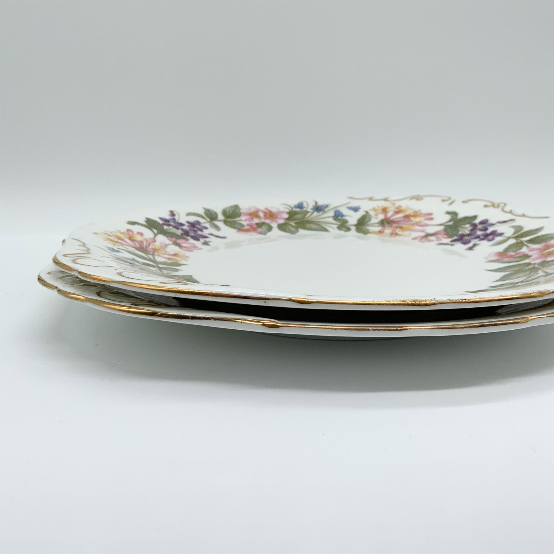 A pair of Paragon dinner plates in the charming Country Lane pattern. Made in England, these plates feature a delicate floral motif with vibrant wildflowers and an elegant gold-trimmed edge. The scalloped design adds sophistication, making them ideal for dining or display. Each plate measures 10.5 in diameter. The backstamp reads Paragon, Country Lane, and Made in England, confirming their authenticity and origin. A lovely addition to any fine dinnerware collection.