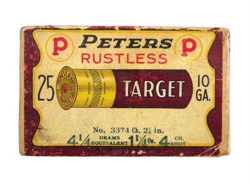 Two Piece Peters Shot Shell Box for 10 gauge target paper shot shells, empty. Very good condition, complete.