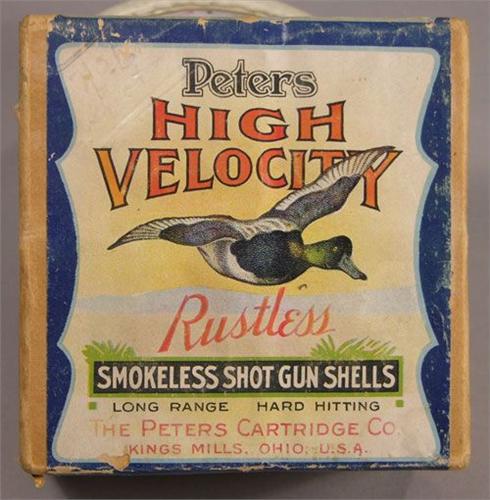 Two Piece Peters Shot Shell Box for 12 gauge high velocity rustless shells, empty. Very good condition, complete.