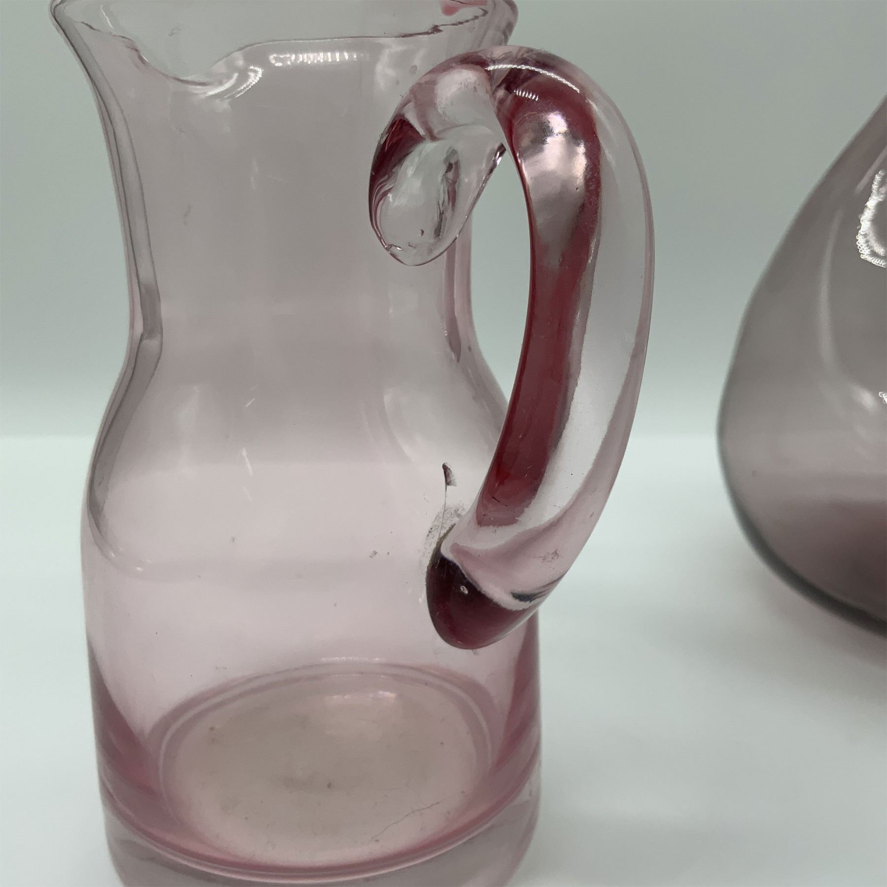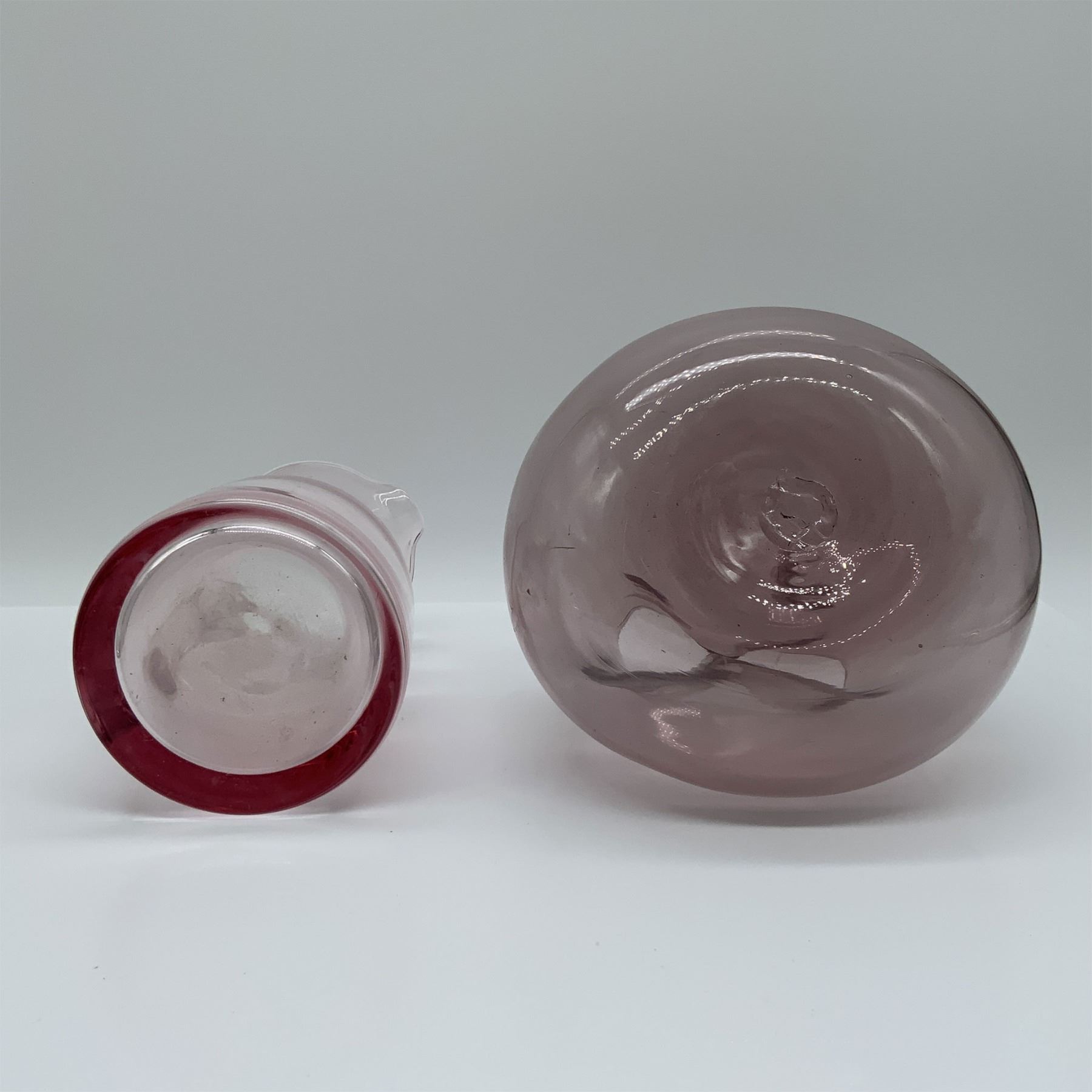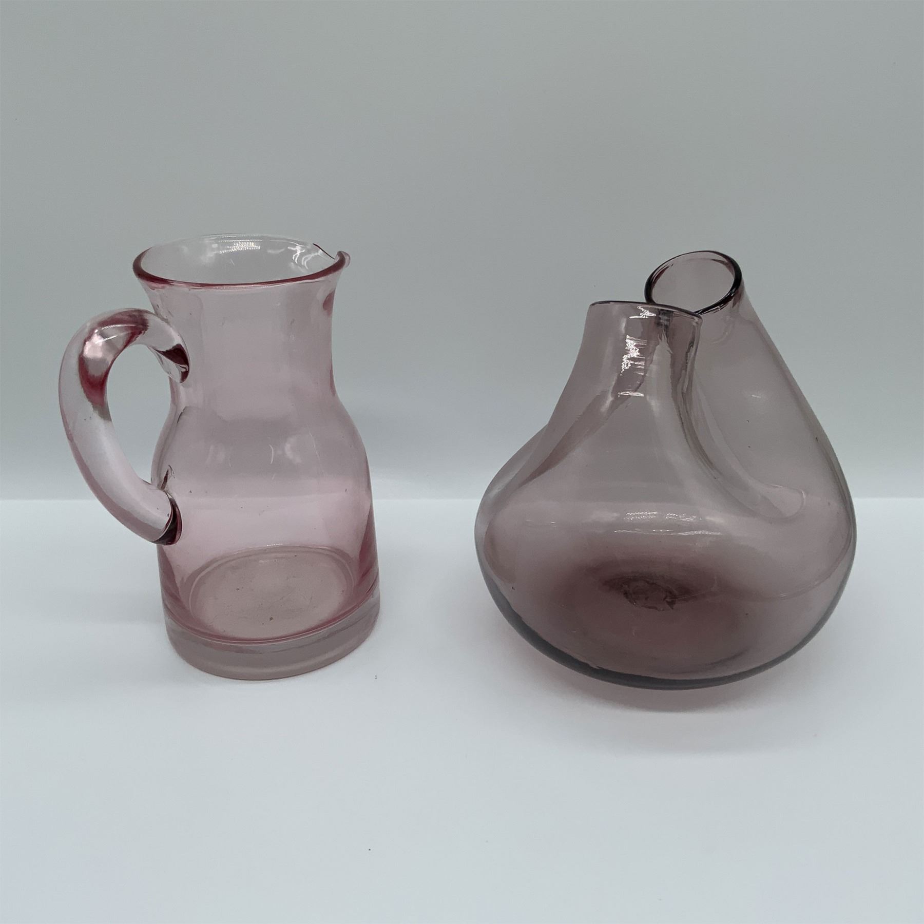 A charming set of two hand-blown pink glass items, featuring a pitcher and a vase. The pitcher showcases a delicate curved handle and a lightly flared spout, complemented by subtle color variations inherent in hand-blown glass. The vase presents an organic, asymmetrical shape with a rounded body and a graceful neck, highlighting the artisan's craftsmanship. Both pieces exhibit pontil marks on their bases, further emphasizing their hand-made nature. The tallest item, the pitcher, measures 5.75â€H.