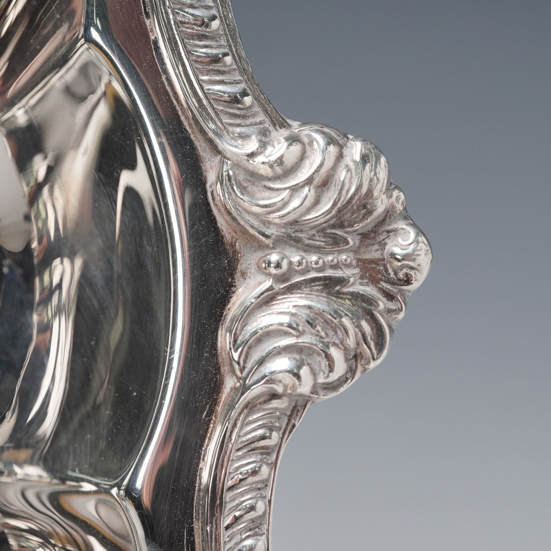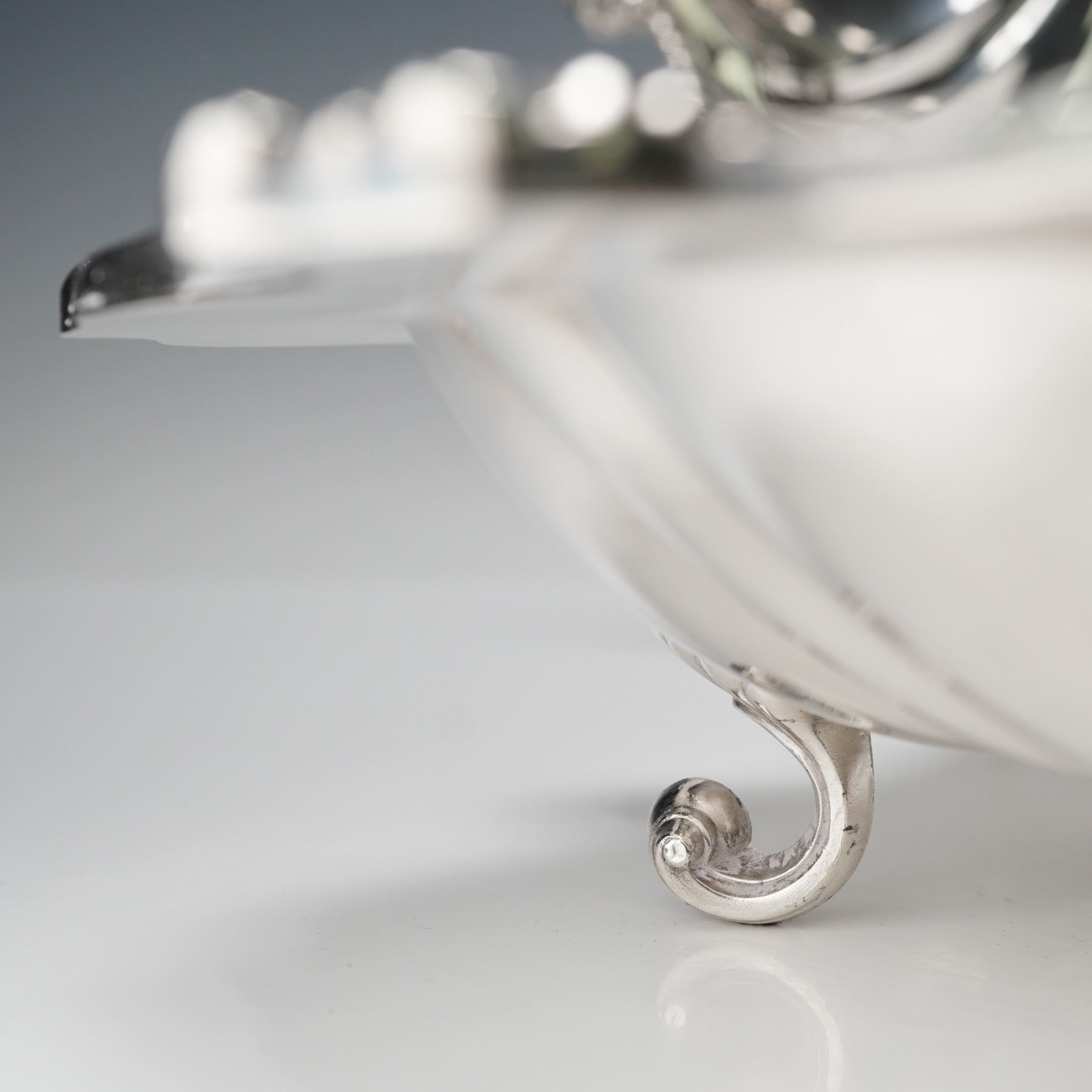 Group of two silverplated footed bowls by Poole Silver Company in the Old English pattern. Each features a scalloped shell form with ornate scroll and floral rim, resting on curled feet. Marked on underside POOLE, OLD ENGLISH, and numbered 5013.