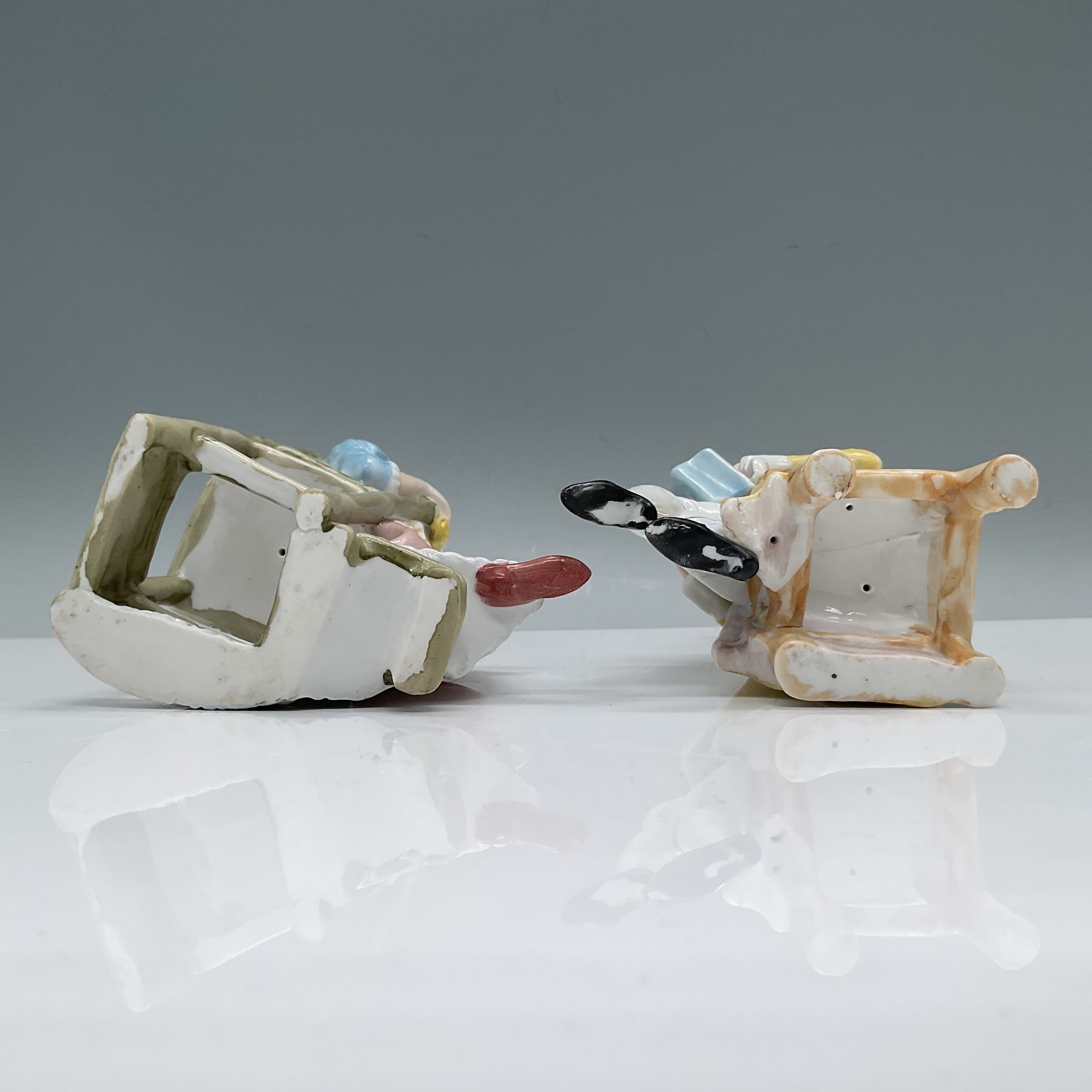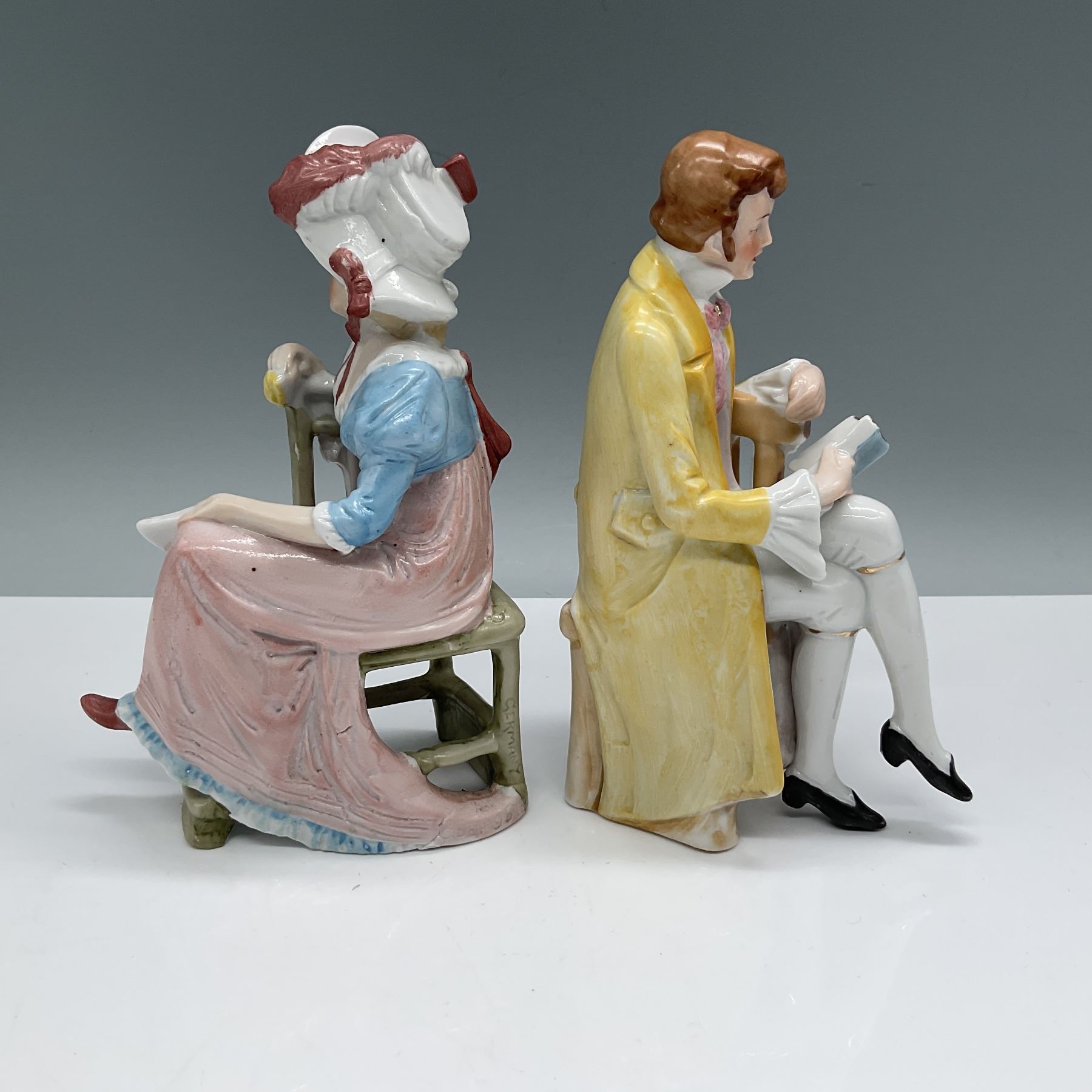 A charming two-piece porcelain figurine set depicting a Regency-era couple seated in wooden-style chairs. The woman wears a pastel pink and blue gown with a bonnet, holding a fan, while the gentleman is dressed in a yellow coat with white breeches, engrossed in a book with gold accents. The figures showcase intricate detailing and hand-painted features, evoking a refined 19th-century aesthetic. No visible maker's mark. Largest piece measures 6"H.