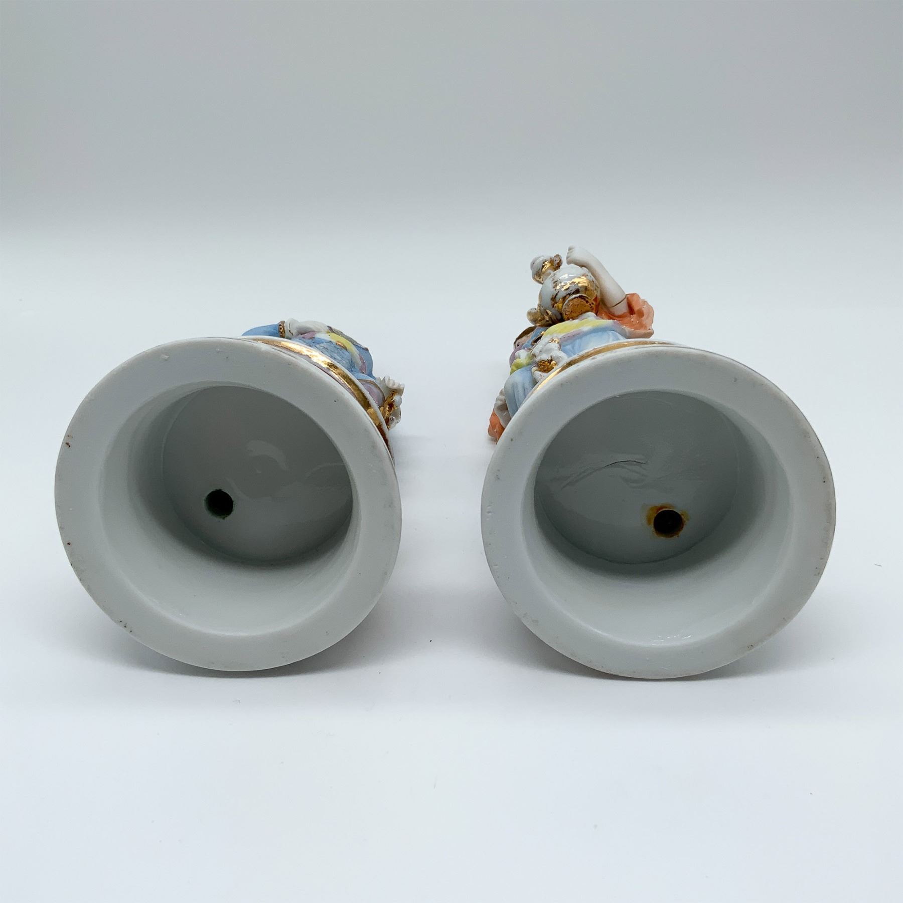 A finely crafted pair of porcelain figurines, each featuring intricate hand-painted details with vibrant pastel hues and gilded accents. One figurine depicts a male figure adorned in traditional middle eastern attire, standing confidently with a dagger at his side. The other portrays a female figure carrying an ornate golden ewer, accompanied by a basket. Both figures are positioned on round bases with decorative motifs, each measuring 7.75 inches in height. Their bases include open holes which can be used as lamps. Estimated value reflects their craftsmanship and detailed artistry.