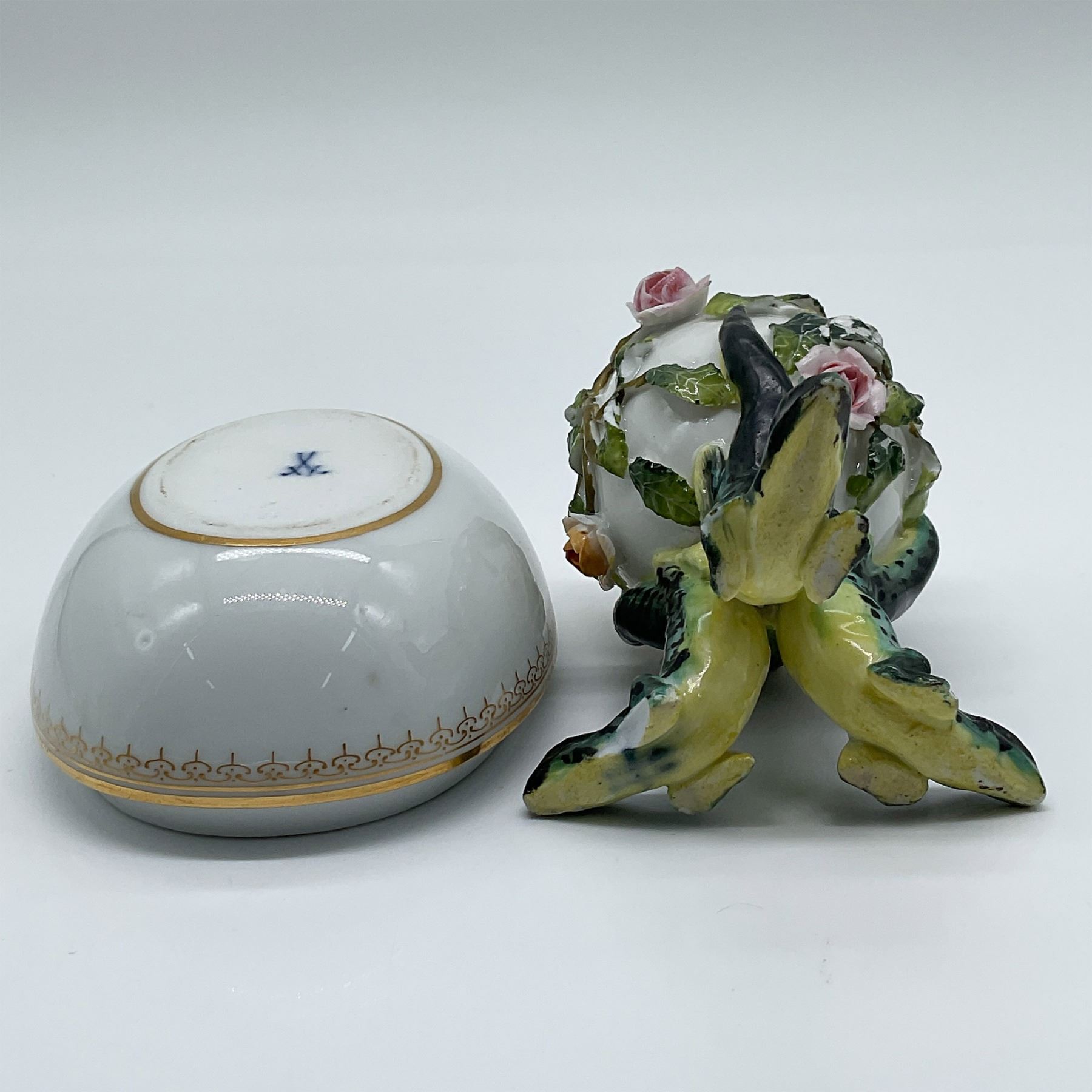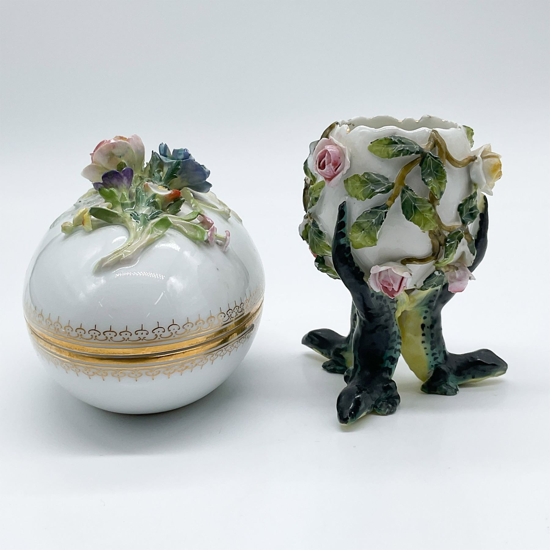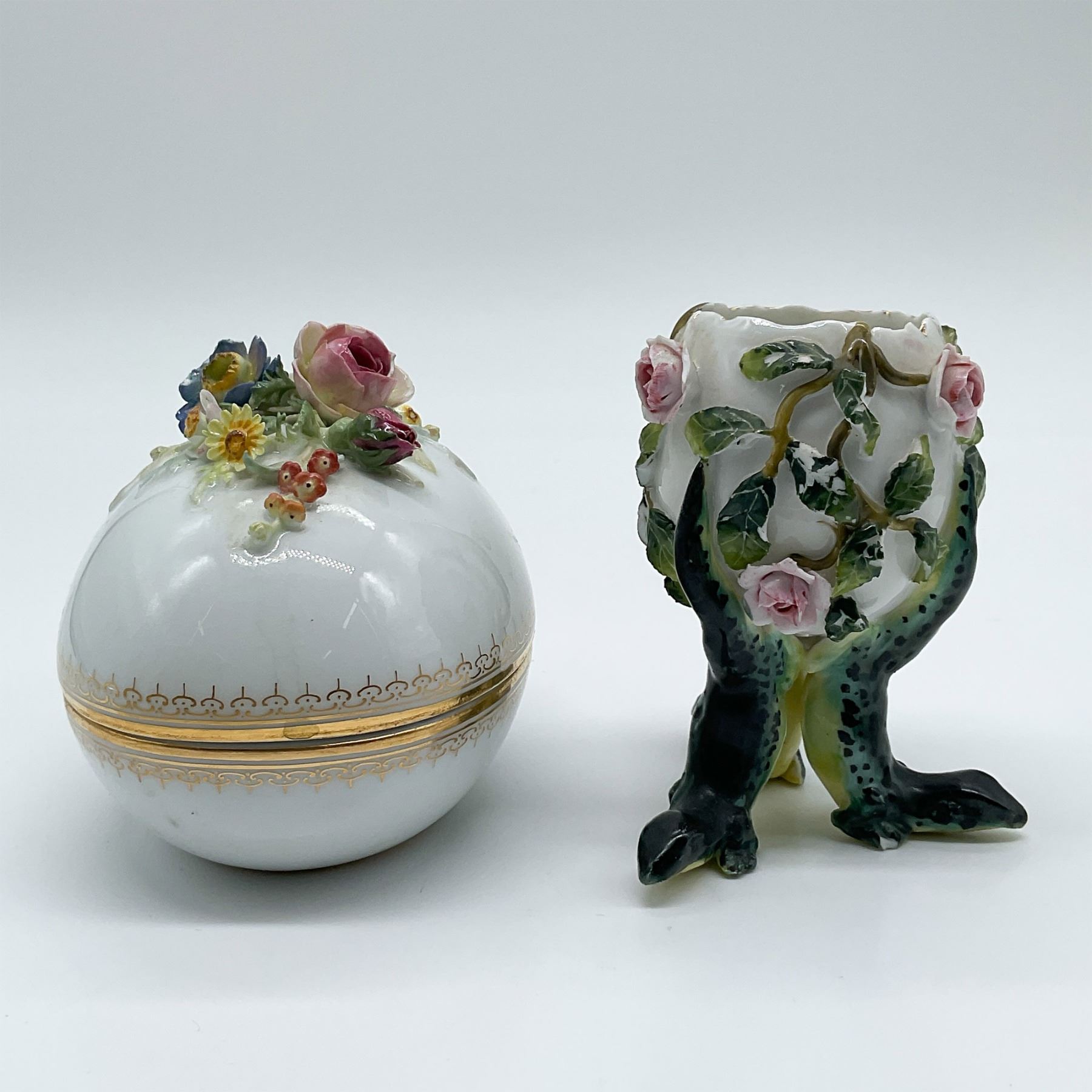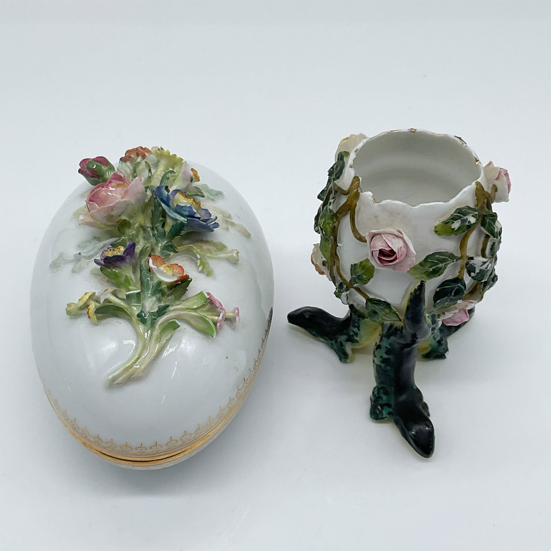 Pair of porcelain pieces featuring a lidded treasure box with floral appliqués and gilded details, along with an egg vase adorned with rose garlands and a figural tripod base. The treasure box measures 4.25”L. Both pieces showcase fine craftsmanship with underglaze blue marks, likely German origin.