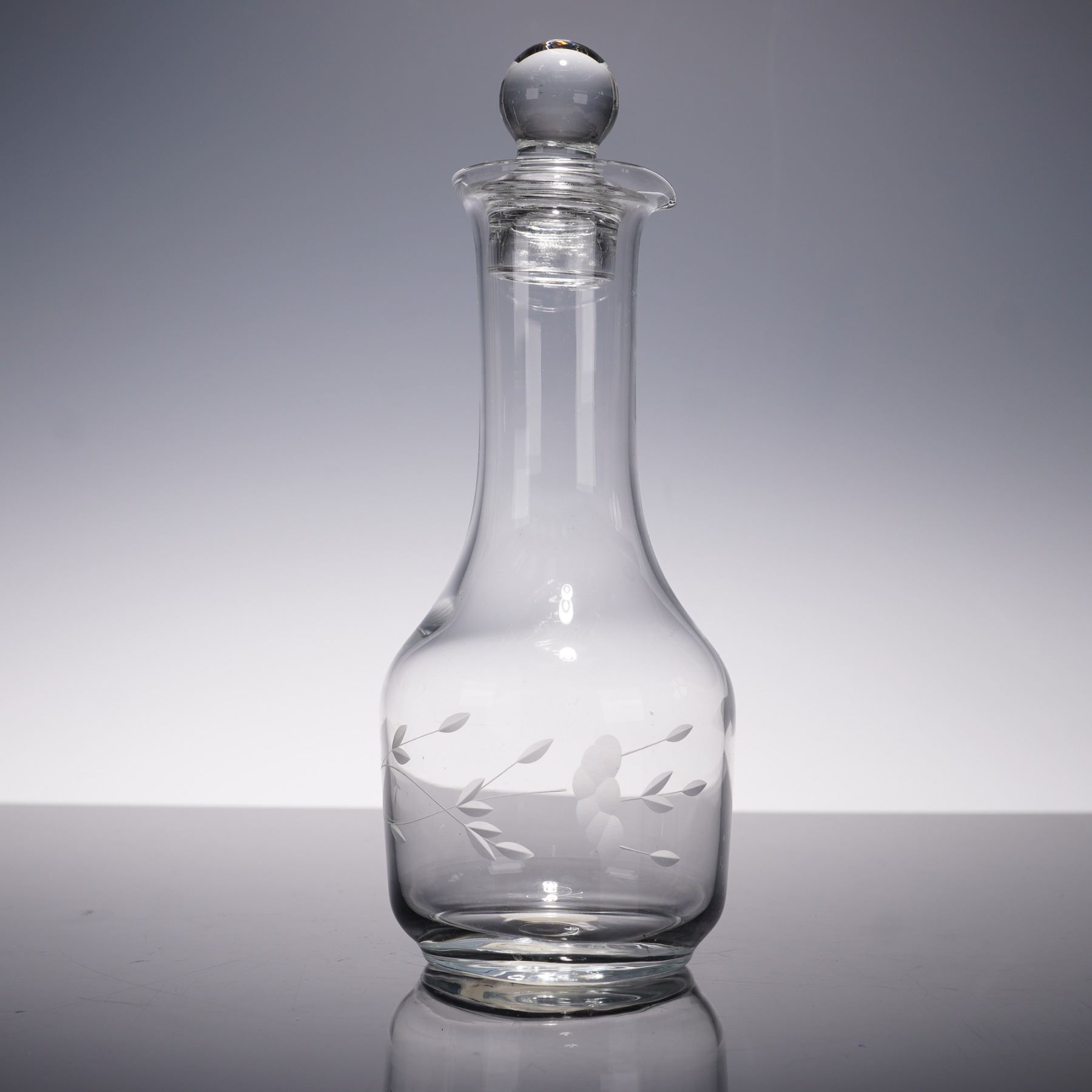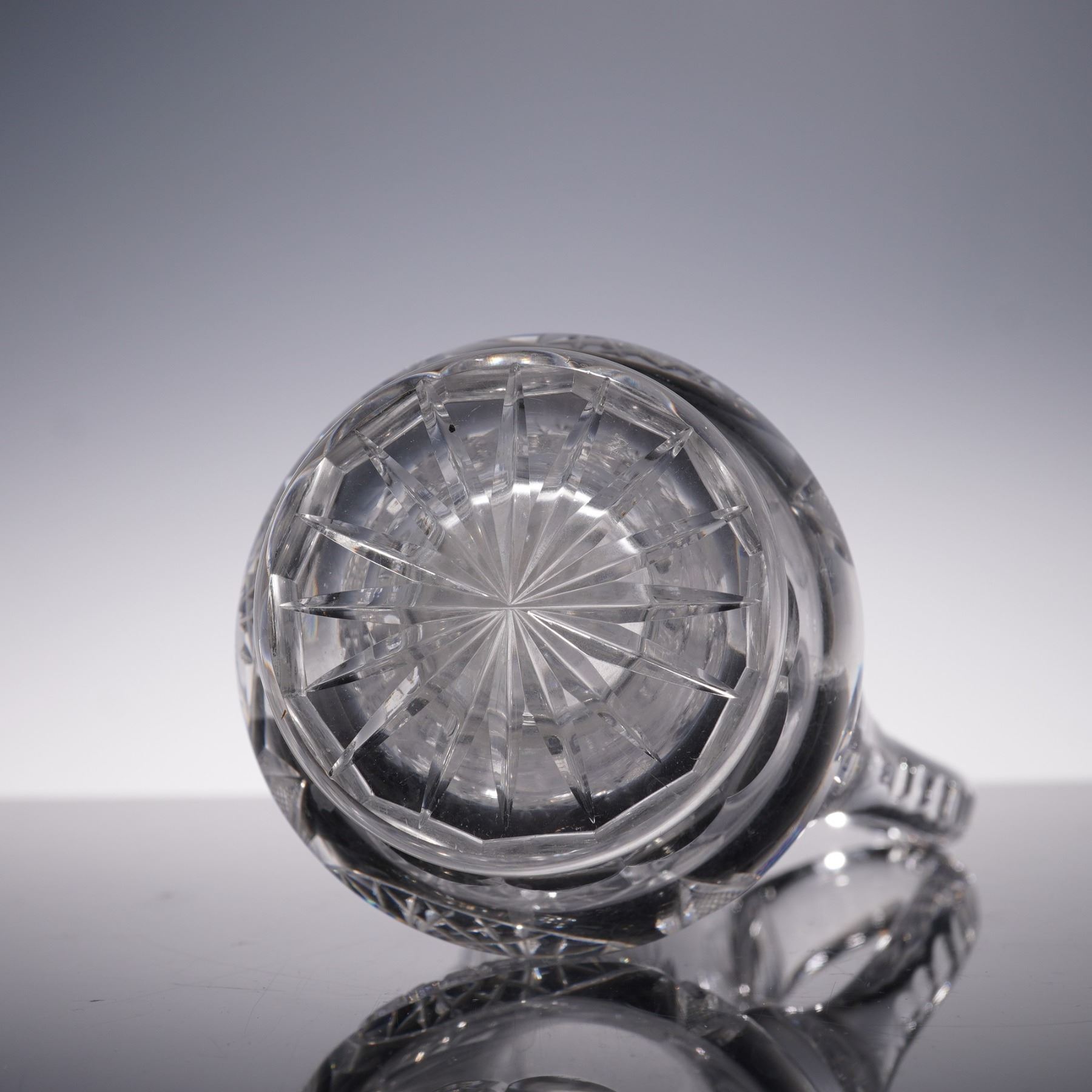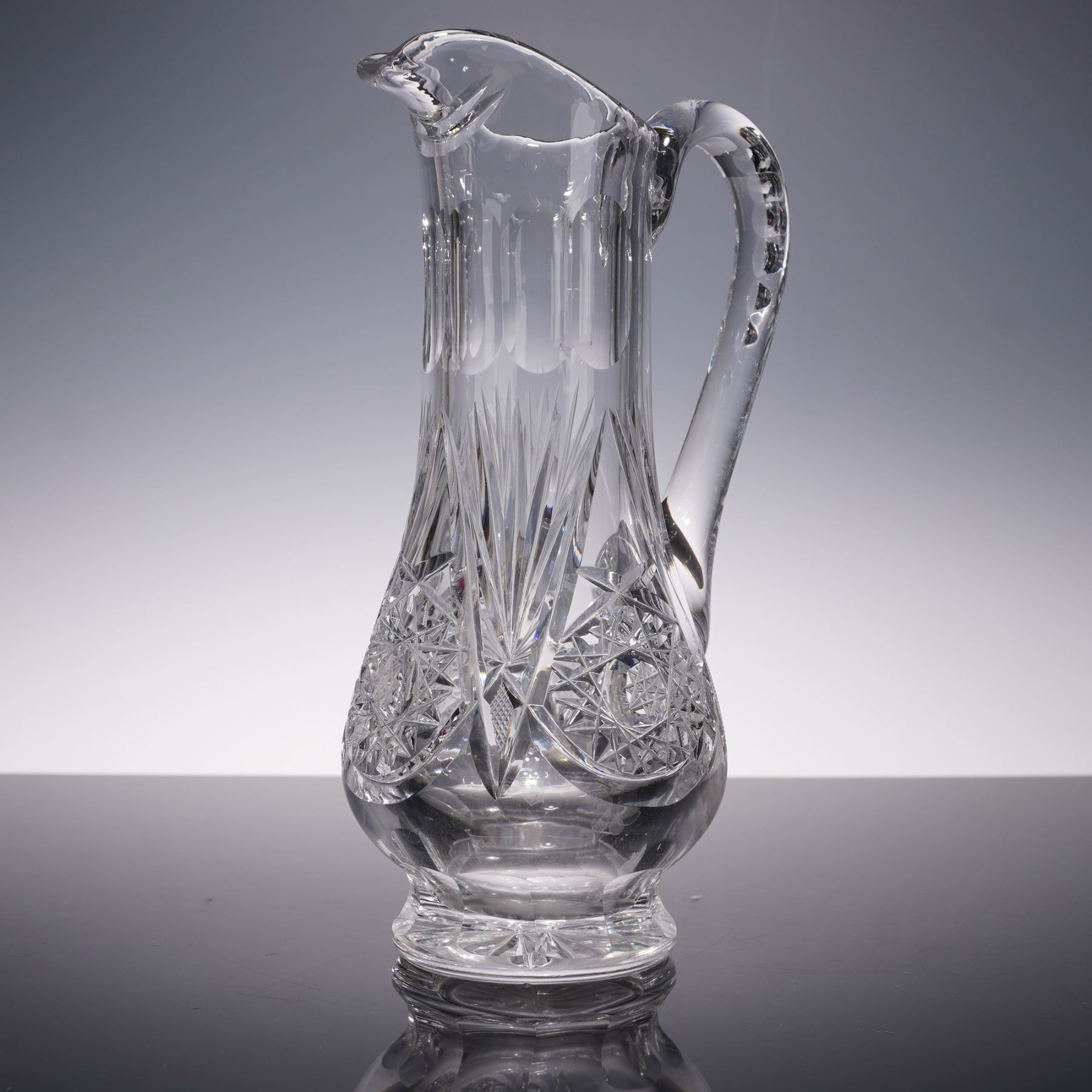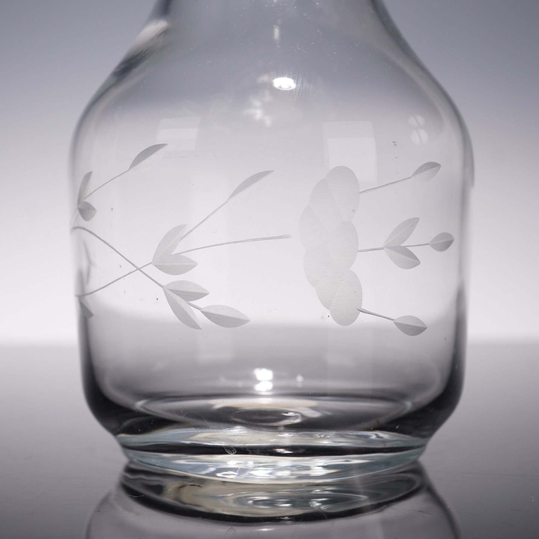 A pair of crystal cruets including one cut crystal pitcher with a star-cut base and intricate geometric motifs, and one clear glass decanter etched with delicate leaf patterns, complete with a matching stopper. The decanter bears a Princess House Italy label on the underside. Both pieces exhibit exceptional clarity and craftsmanship, ideal for elegant table or bar service. Largest piece measures 8.25"H.