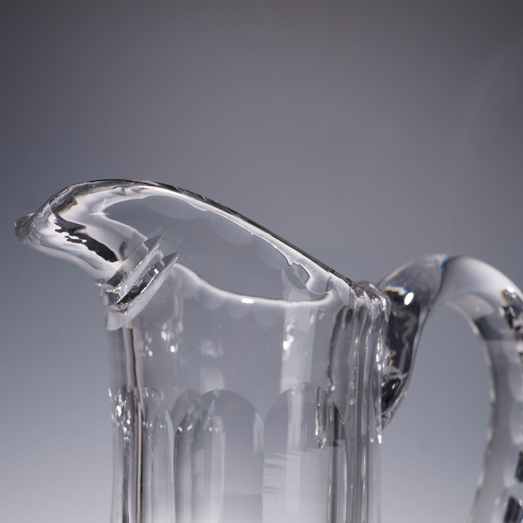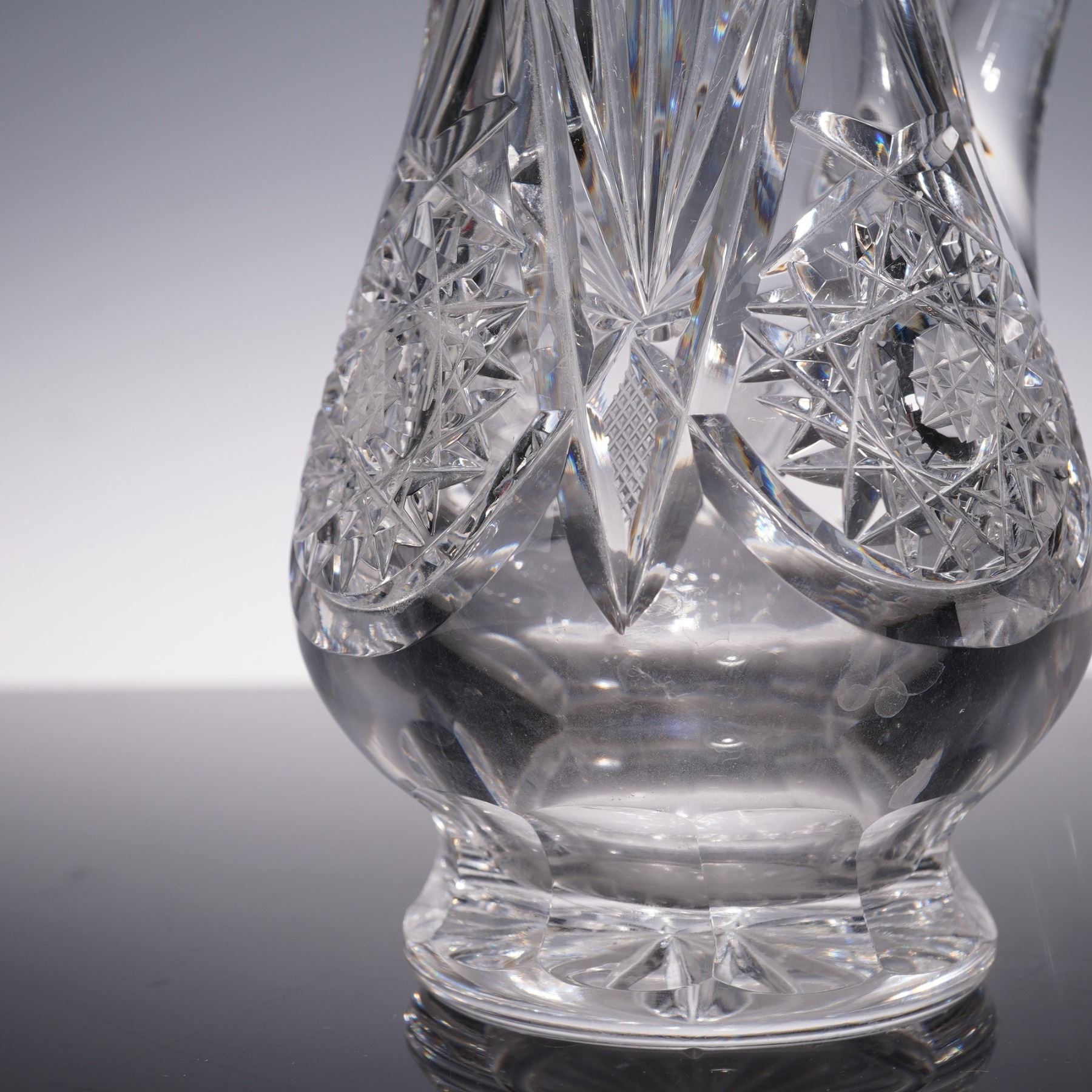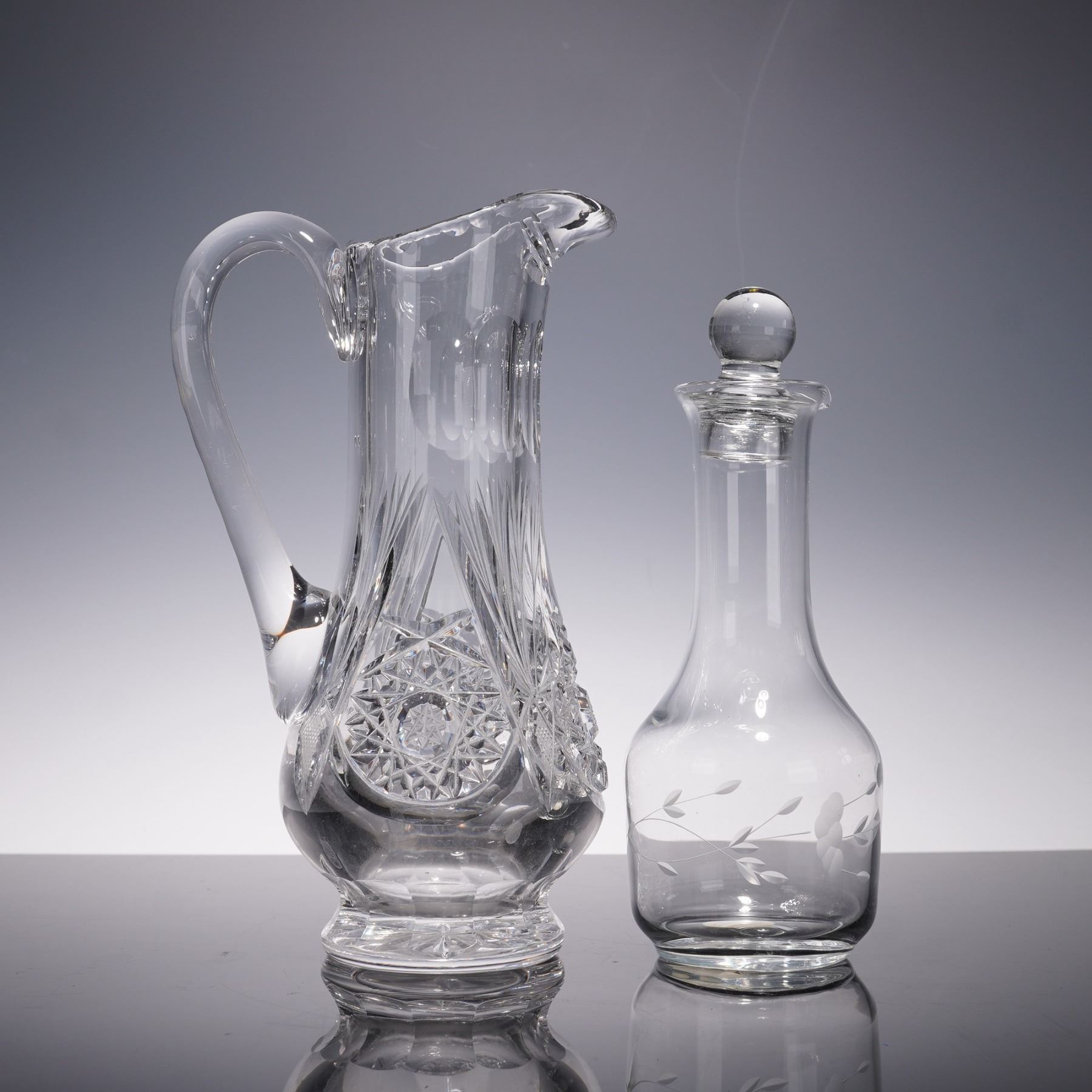 A pair of crystal cruets including one cut crystal pitcher with a star-cut base and intricate geometric motifs, and one clear glass decanter etched with delicate leaf patterns, complete with a matching stopper. The decanter bears a Princess House Italy label on the underside. Both pieces exhibit exceptional clarity and craftsmanship, ideal for elegant table or bar service. Largest piece measures 8.25"H.
