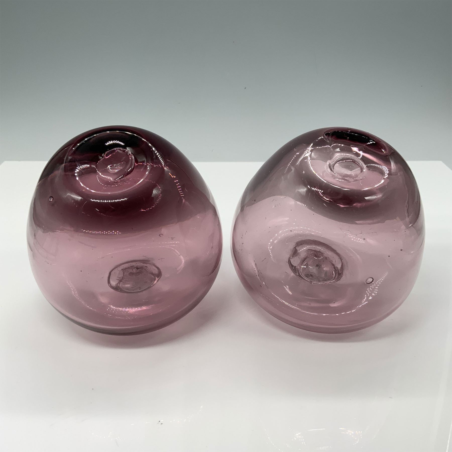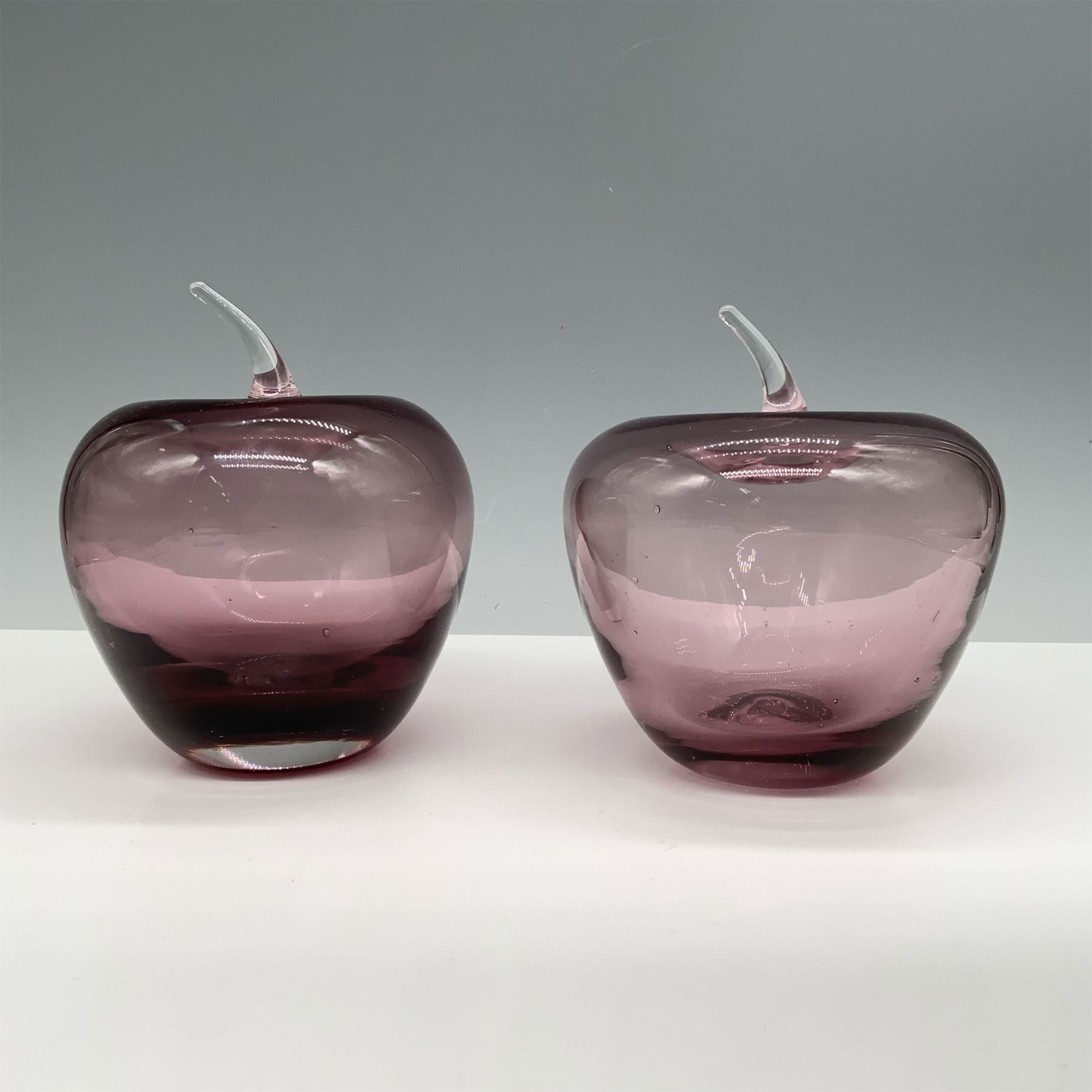 This lot features two purple glass apple figurines with clear glass stems. The rich purple tones in each apple create an elegant and striking appearance, with smooth, rounded bodies that reflect light beautifully. These figurines highlight the skilled craftsmanship involved in their creation, making them a captivating addition to any collection.