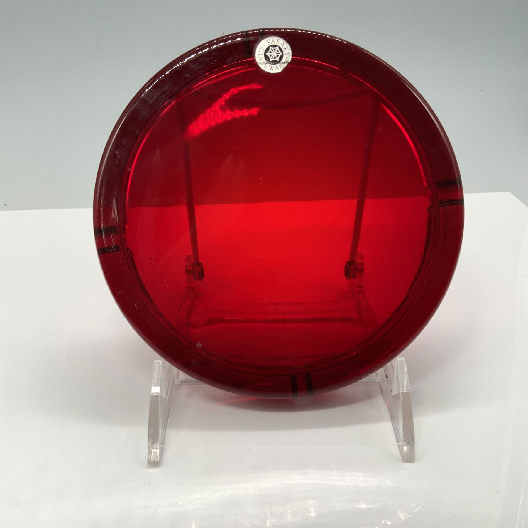 This lot includes a 2-piece set of red glass ashtrays. One piece is a rounded design with no markings, while the other, a flat ashtray, is marked with the Sasaki Glassware label, ensuring its authenticity. Known for its premium craftsmanship, Sasaki's glassware is highly sought after by collectors. The set showcases a vivid red hue and intricate cut details, making it a striking addition to any mid-century modern or glass collection. Largest ashtray: 6.5" dia.