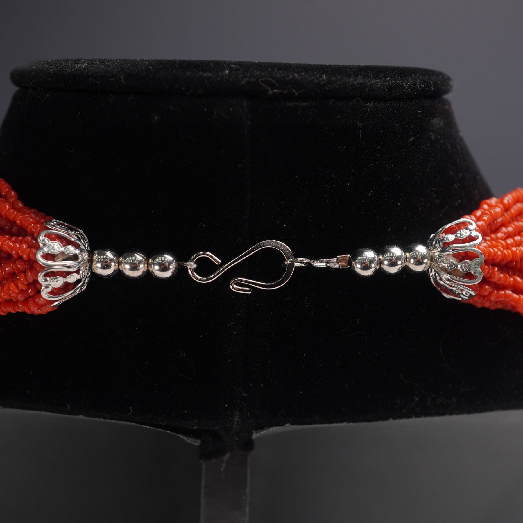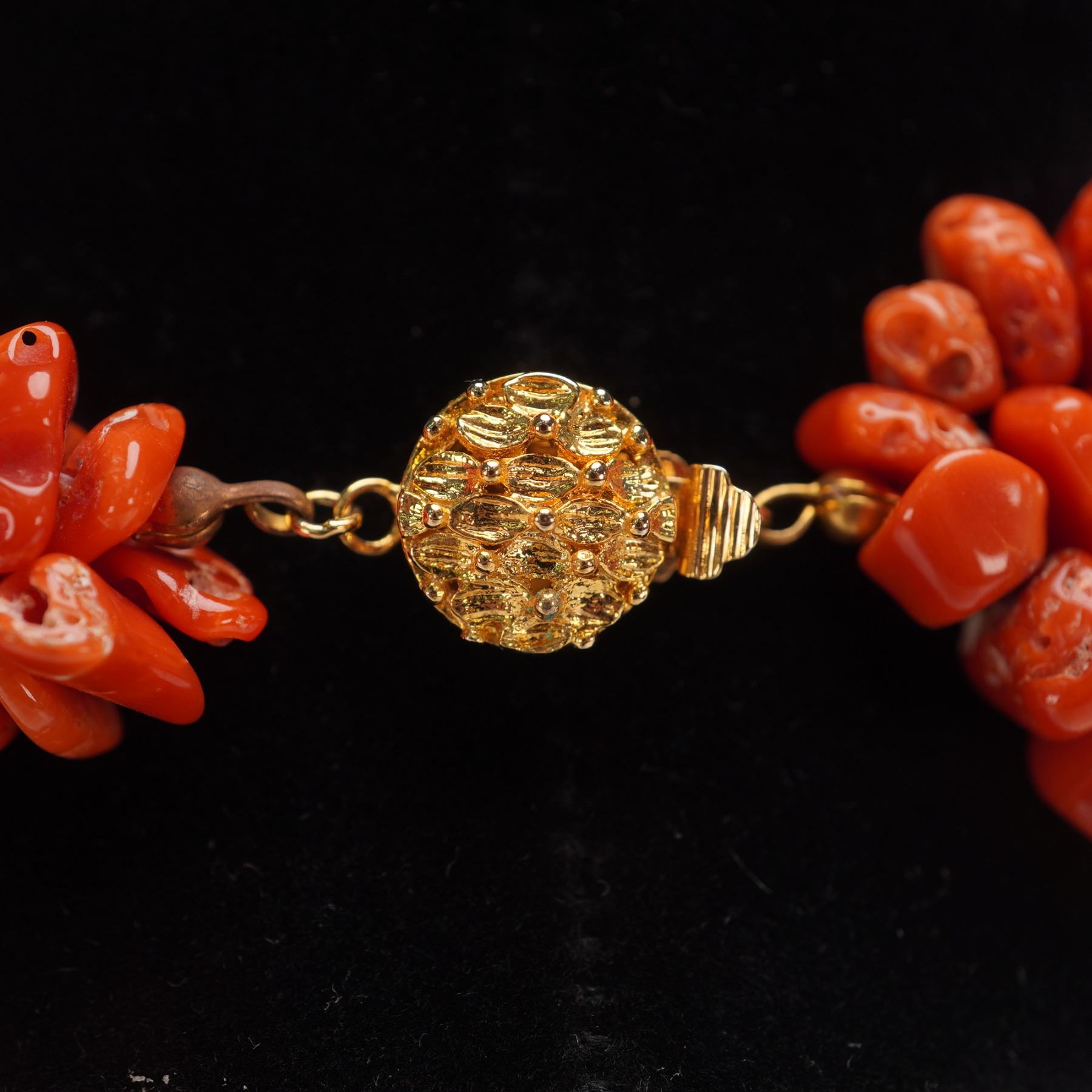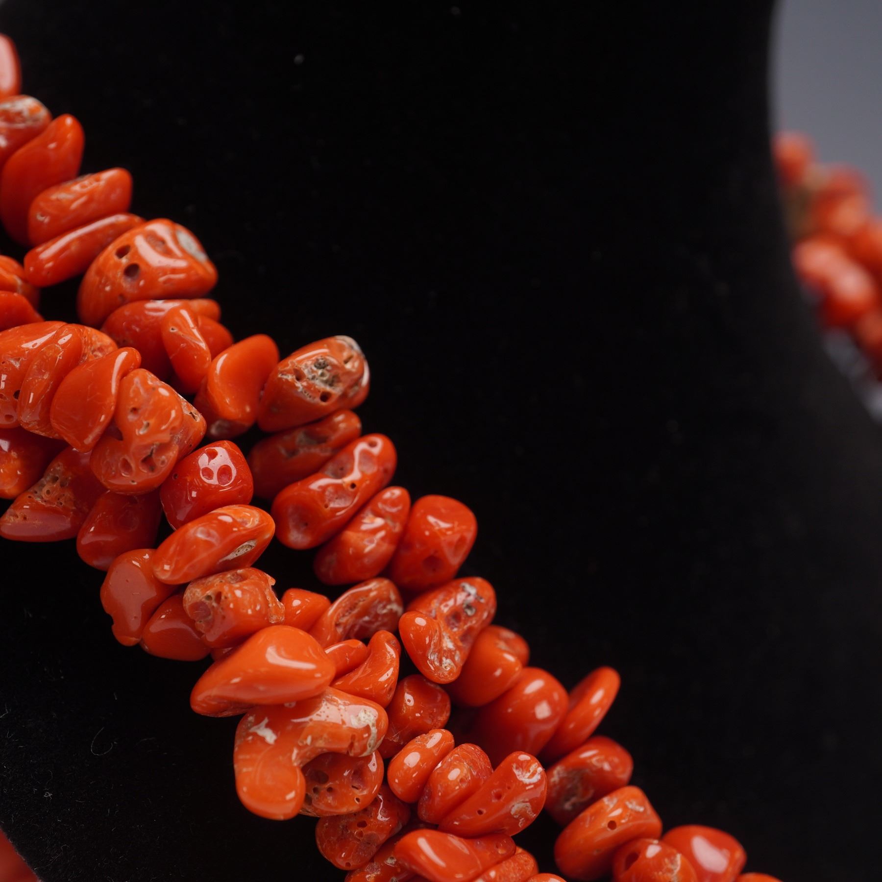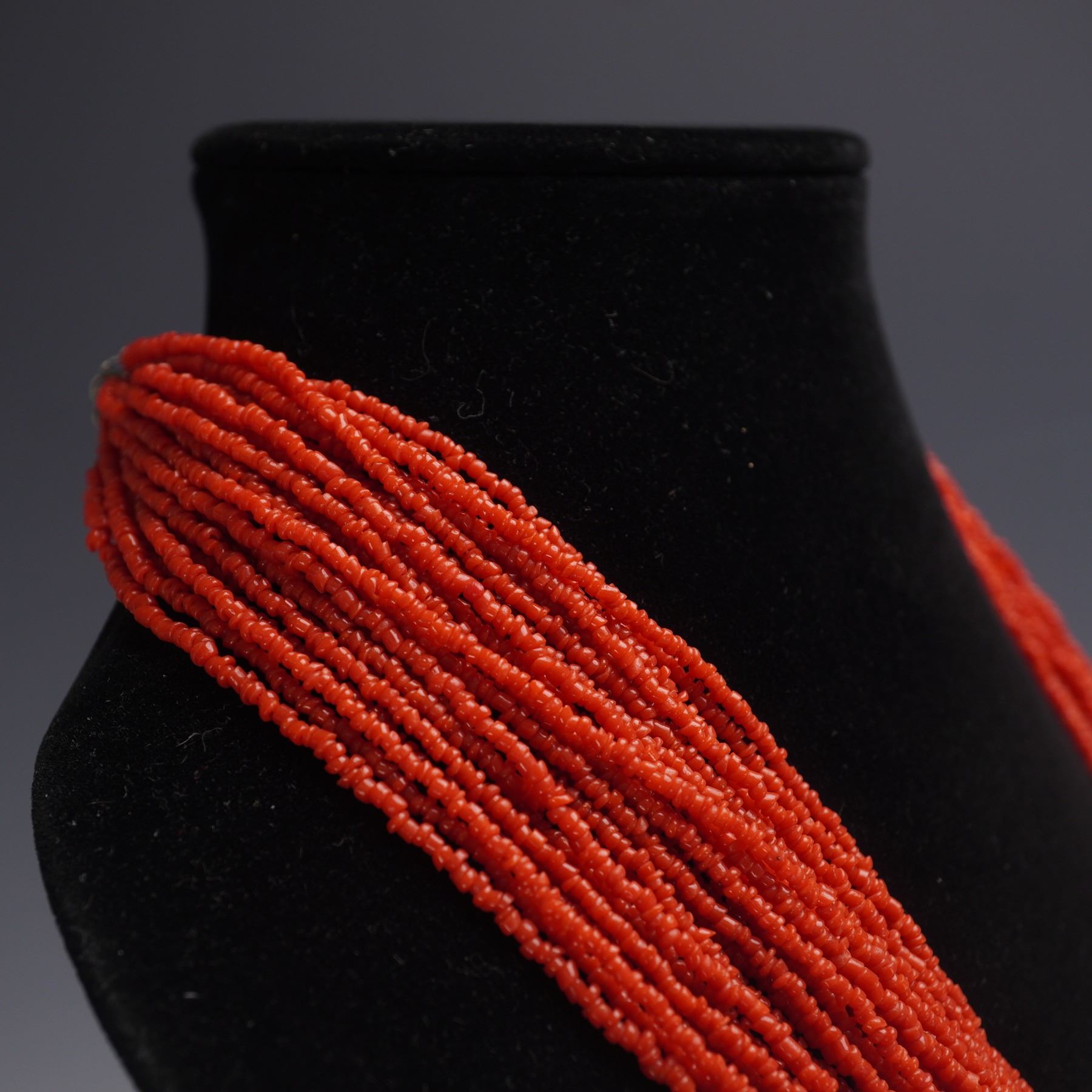 Two beautiful necklaces, one crafted from polished red turquoise fragments arranged in multiple twisted strands with a textured gold toned clasp. The other necklace formed of numerous fine red beads strung into layered strands and secured with a silver toned clasp. Gold clasp marked "G.P" for gold plated.
