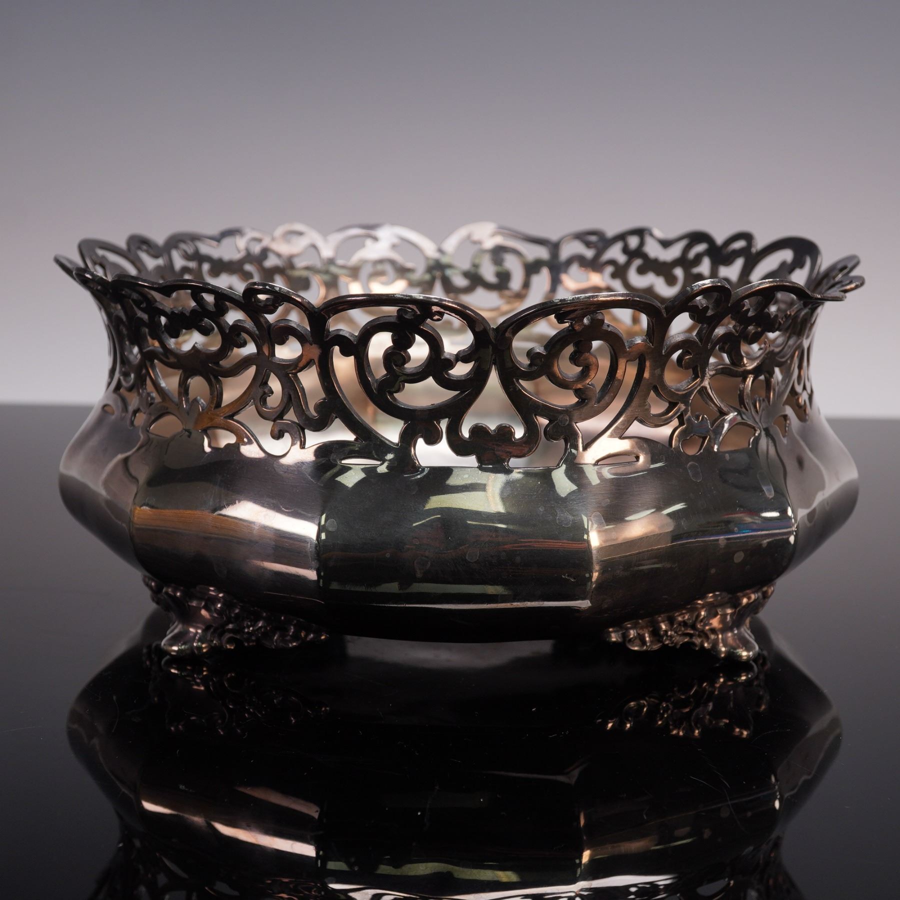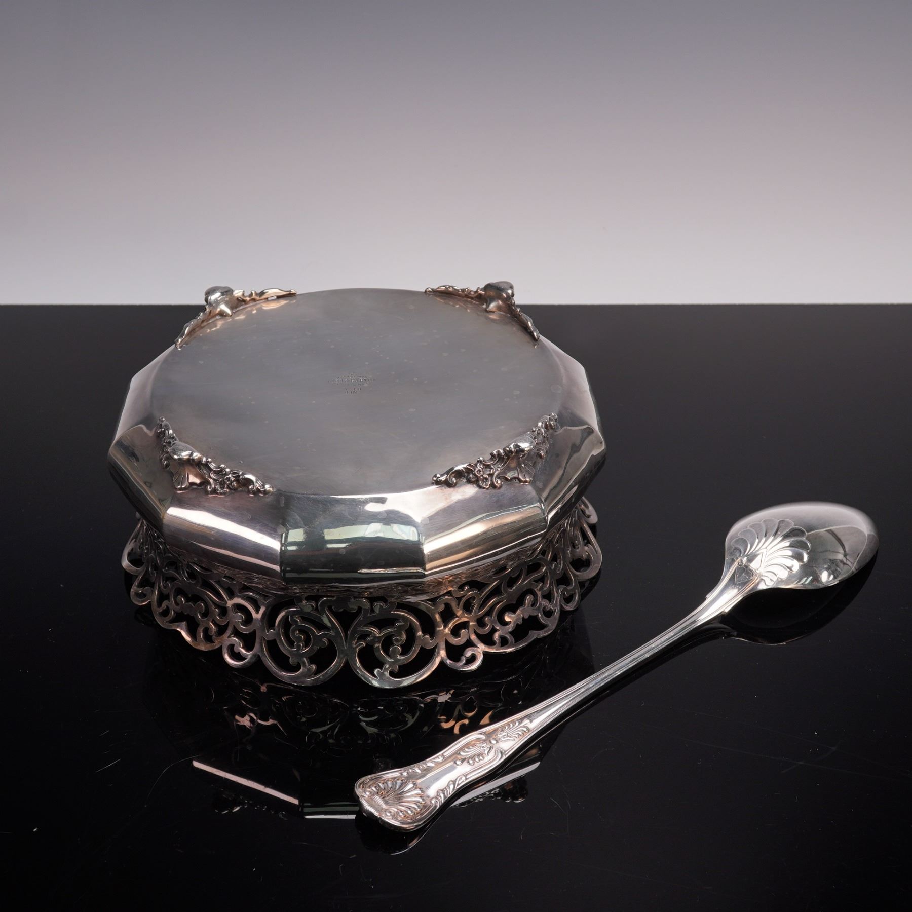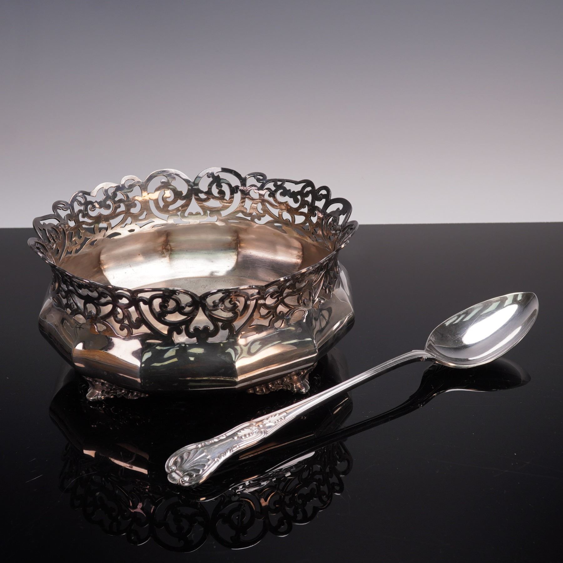 An elegant set featuring a bowl and serving spoon, the bowl of octagonal form raised on scrolling feet. The spoon's handle adorned with a shell and scroll work and the bowl with pierced border incorporating foliate and volute motifs. Reed & Barton hallmarked. Bowl measures: 9"W x 4"H. Spoon measures: 13"L x 2.25"W.