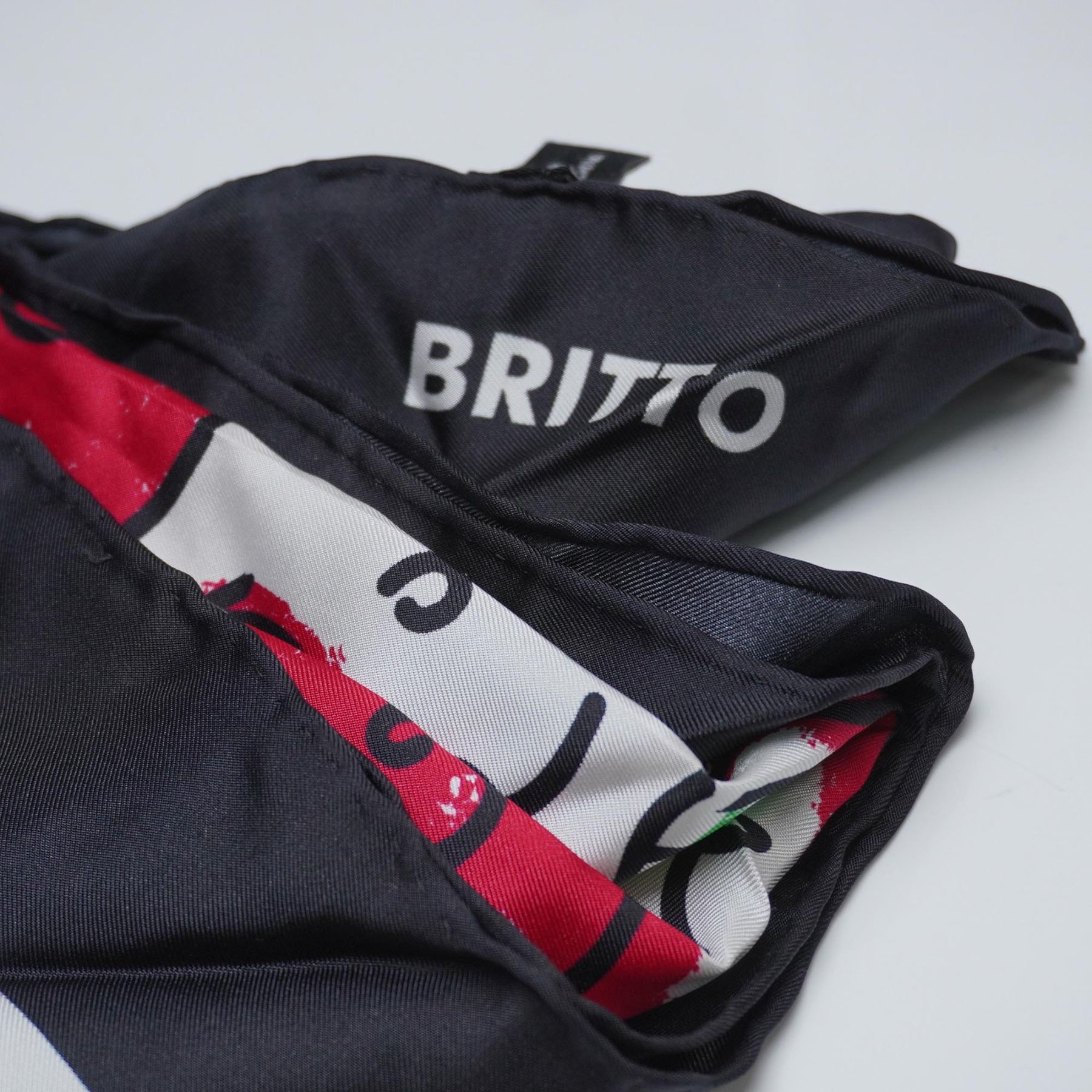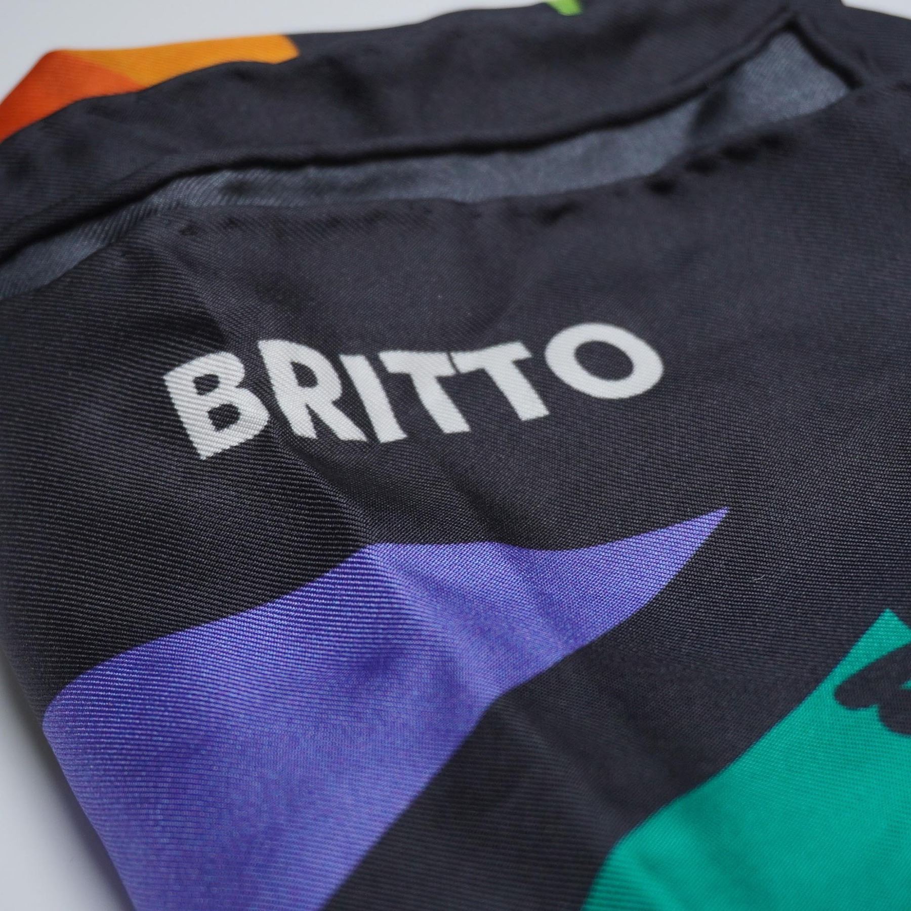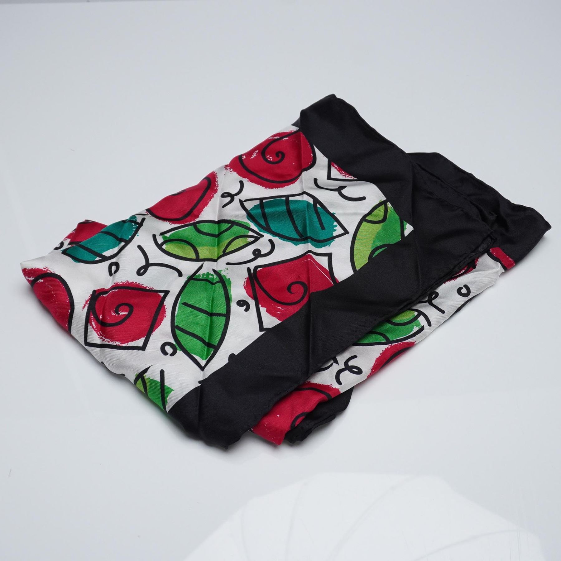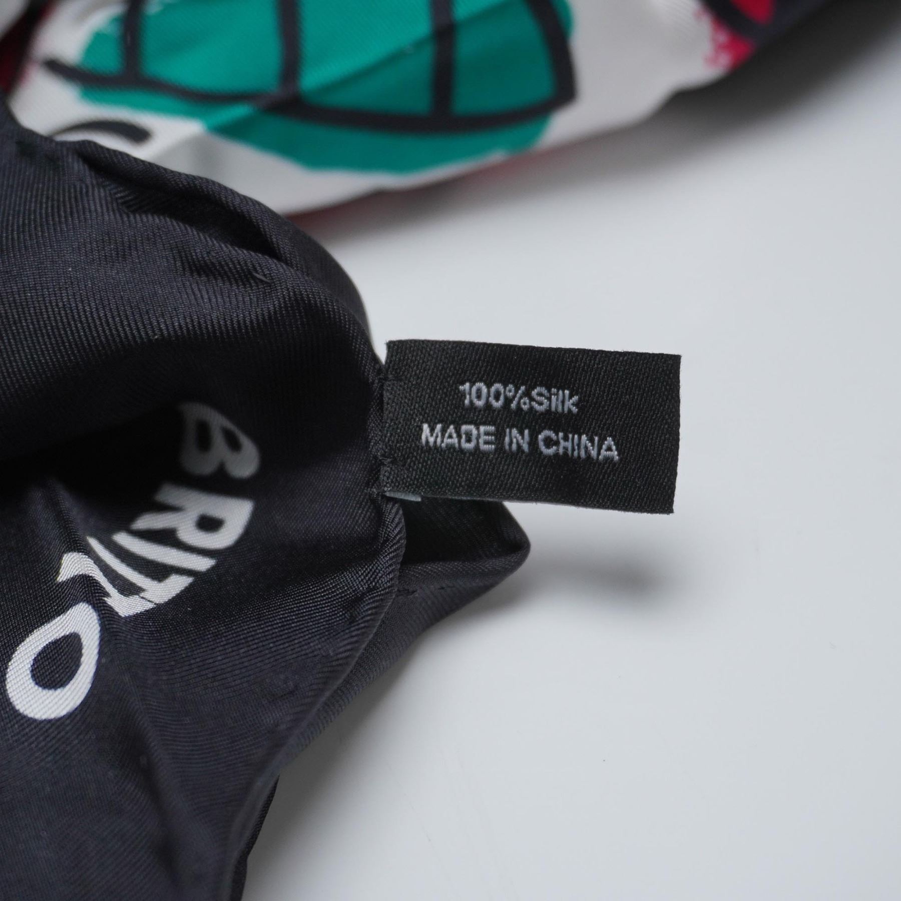 Set of two silk scarves featuring vibrant designs by Brazilian artist Romero Britto. One scarf showcases Britto's signature colorful abstract pattern with bold geometric shapes, while the other displays a whimsical floral motif with stylized roses and leaves on a white ground, both bordered in black. Each scarf is marked Britto, and both are crafted from 100% silk. A lively and artistic addition to any wardrobe or collection.