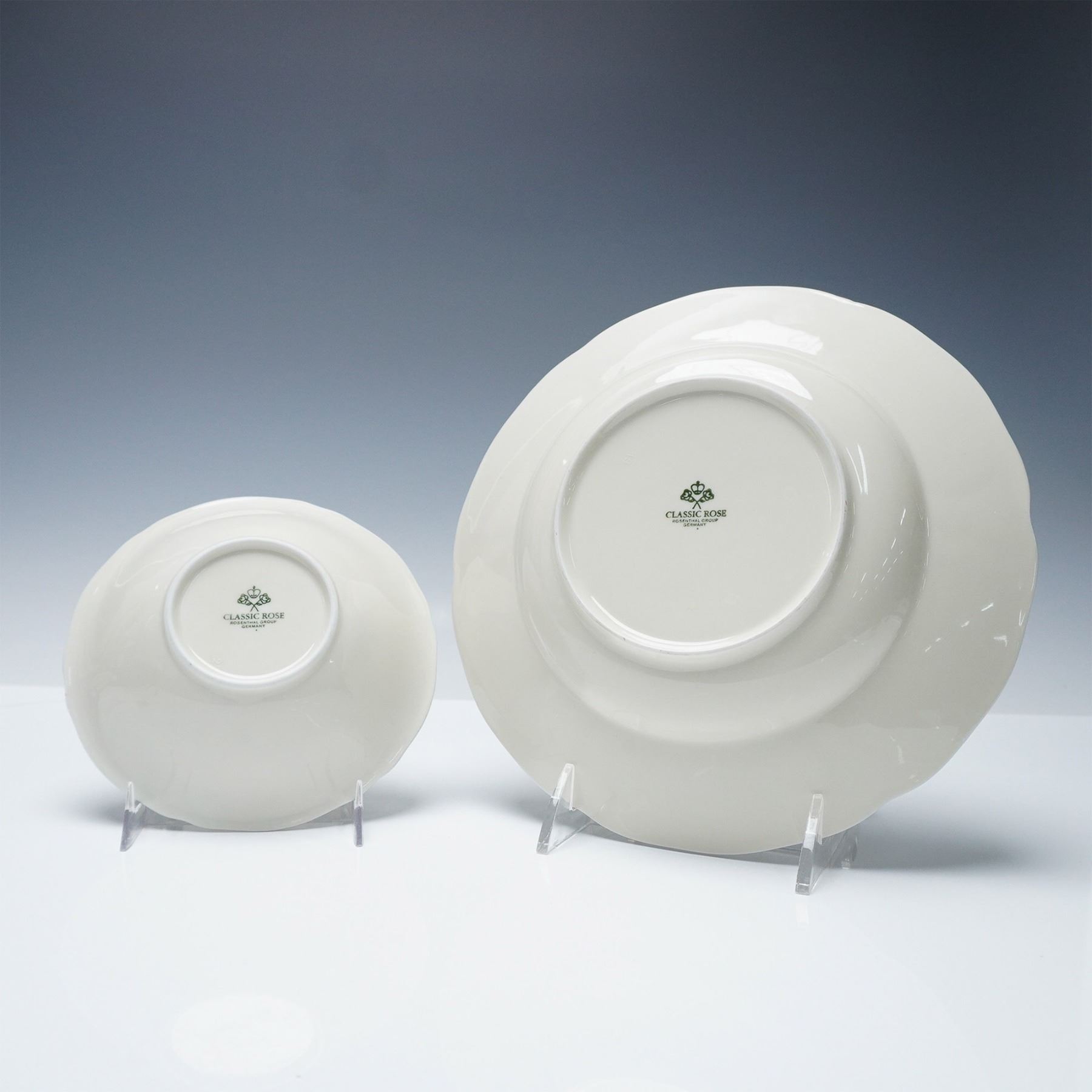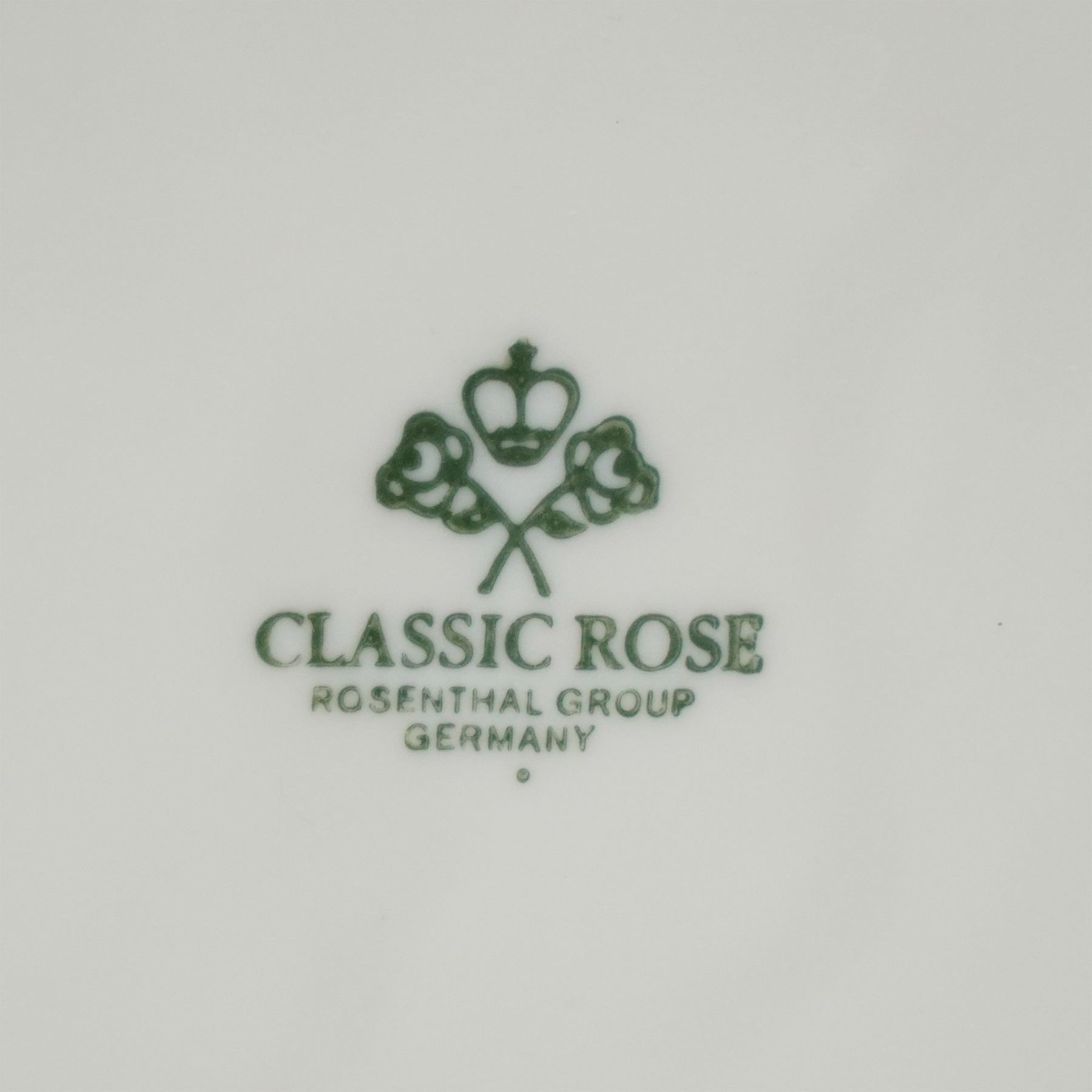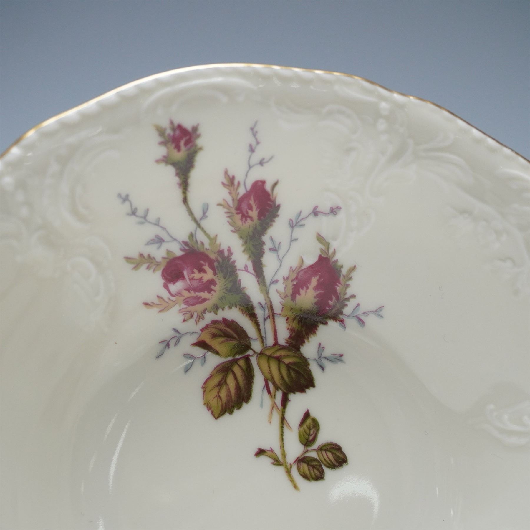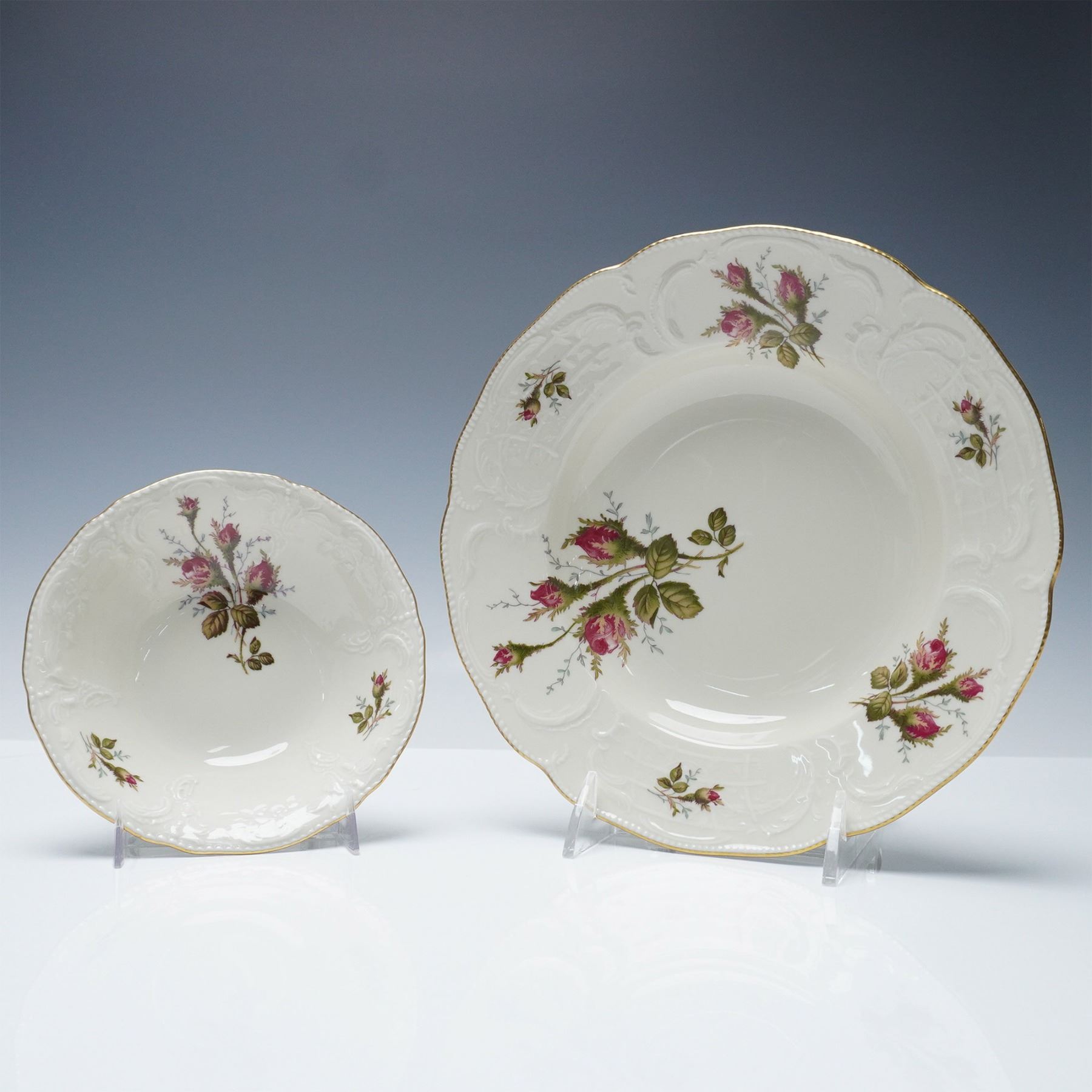 Elegant 2-piece porcelain bowl set by Rosenthal in the beloved Moss Rose pattern, featuring a large rim soup bowl and a coupe-style cereal bowl. Each piece showcases detailed embossed borders and delicate pink moss rose blossoms with green foliage and gold trim, set against a soft ivory ground. The backstamp reads "Classic Rose Rosenthal Group Germany". A charming blend of refined craftsmanship and floral romanticism, ideal for collectors or enhancing a traditional table setting. largest bowl measures 9.25" dia.