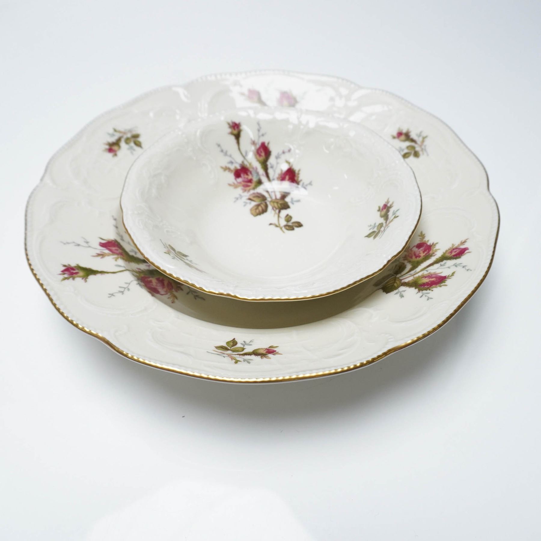 Elegant 2-piece porcelain bowl set by Rosenthal in the beloved Moss Rose pattern, featuring a large rim soup bowl and a coupe-style cereal bowl. Each piece showcases detailed embossed borders and delicate pink moss rose blossoms with green foliage and gold trim, set against a soft ivory ground. The backstamp reads "Classic Rose Rosenthal Group Germany". A charming blend of refined craftsmanship and floral romanticism, ideal for collectors or enhancing a traditional table setting. largest bowl measures 9.25" dia.