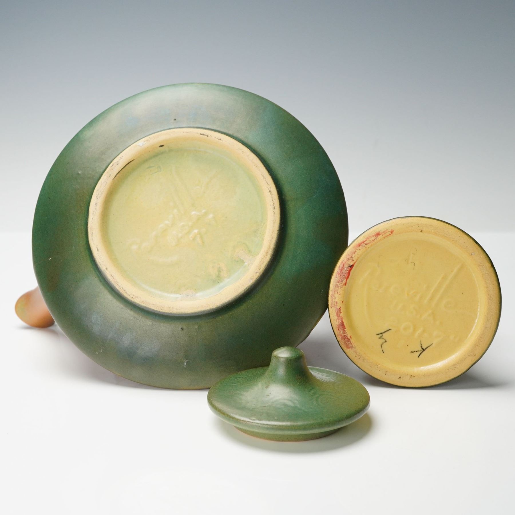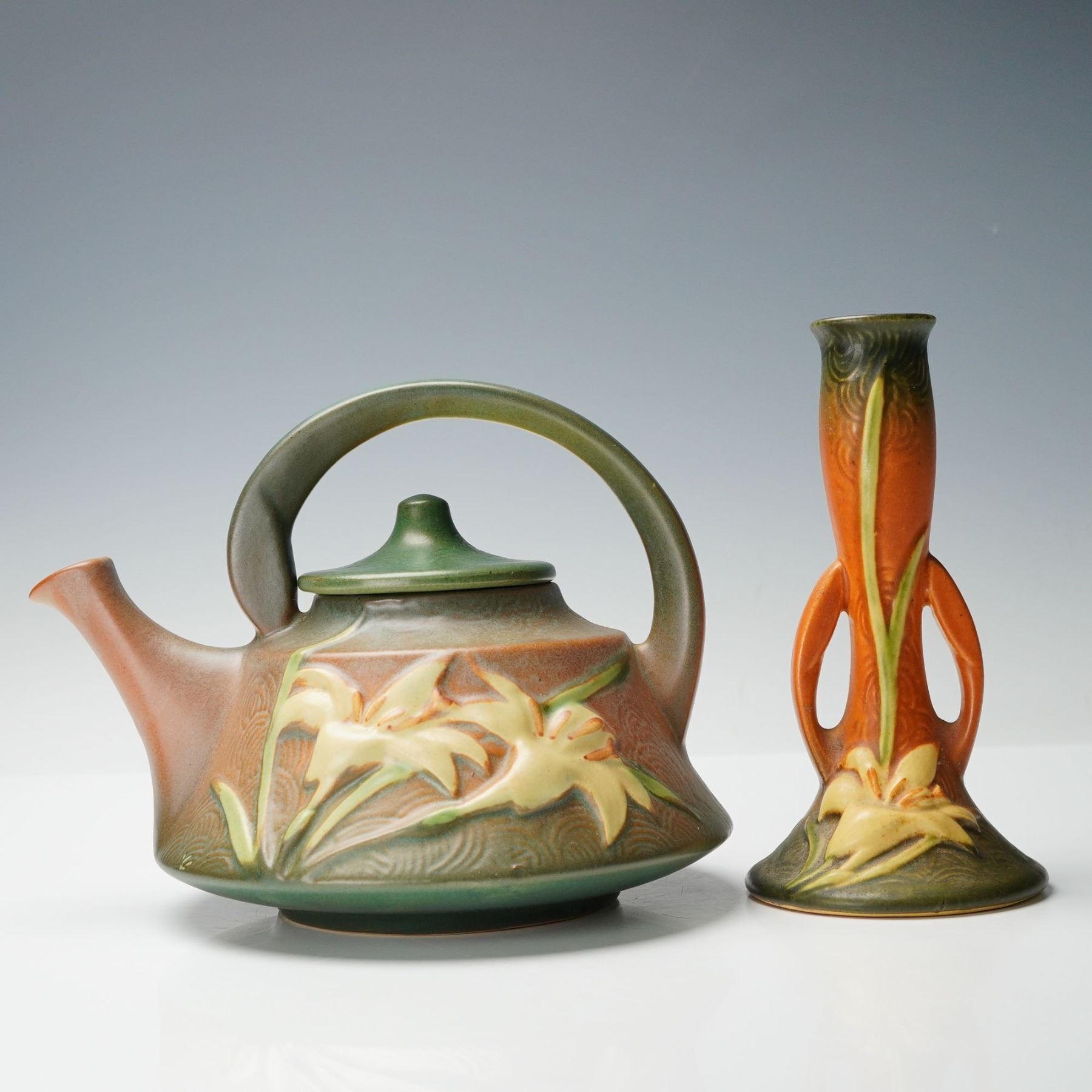 2pc Roseville Pottery Brown Teapot and Vase, Zephyr Lily