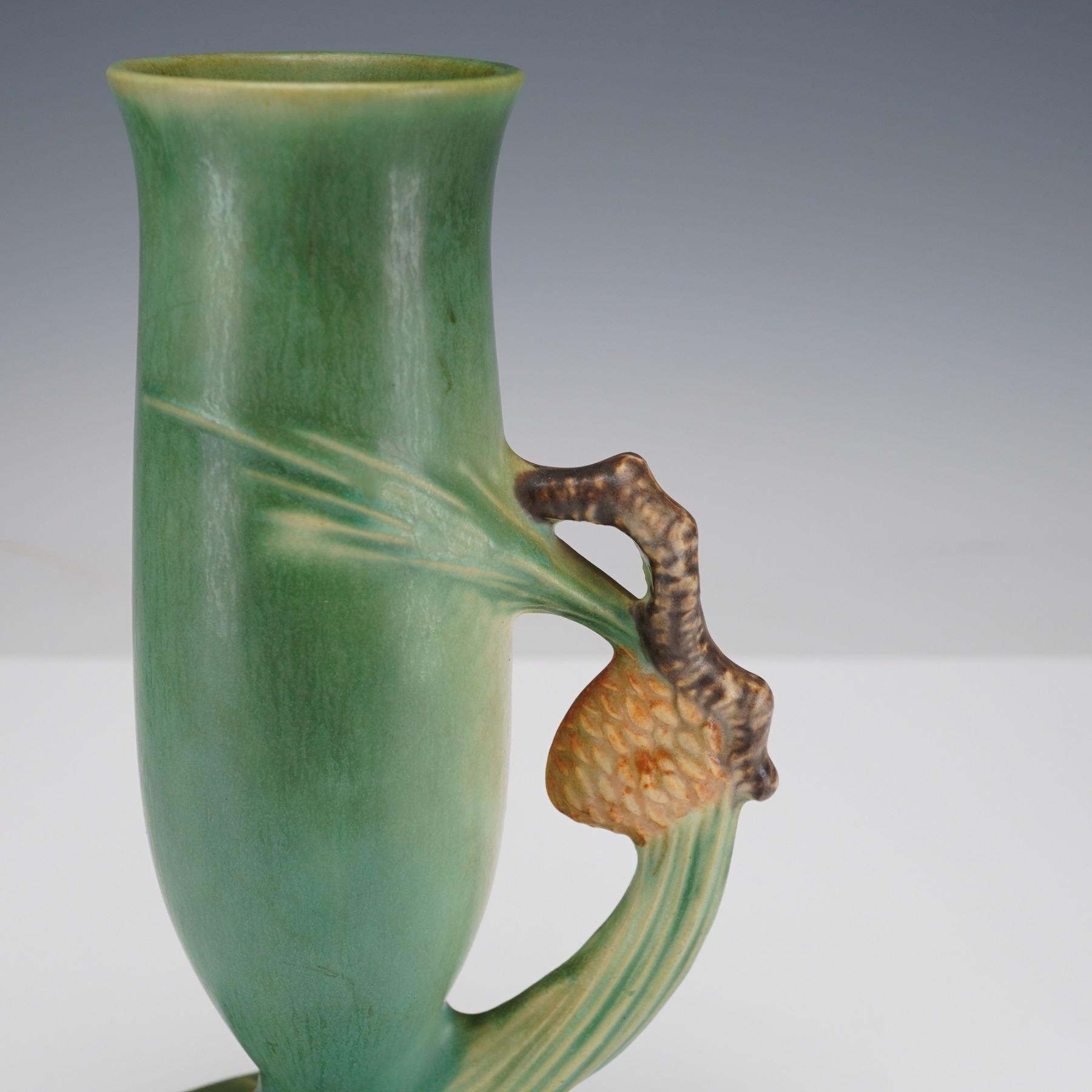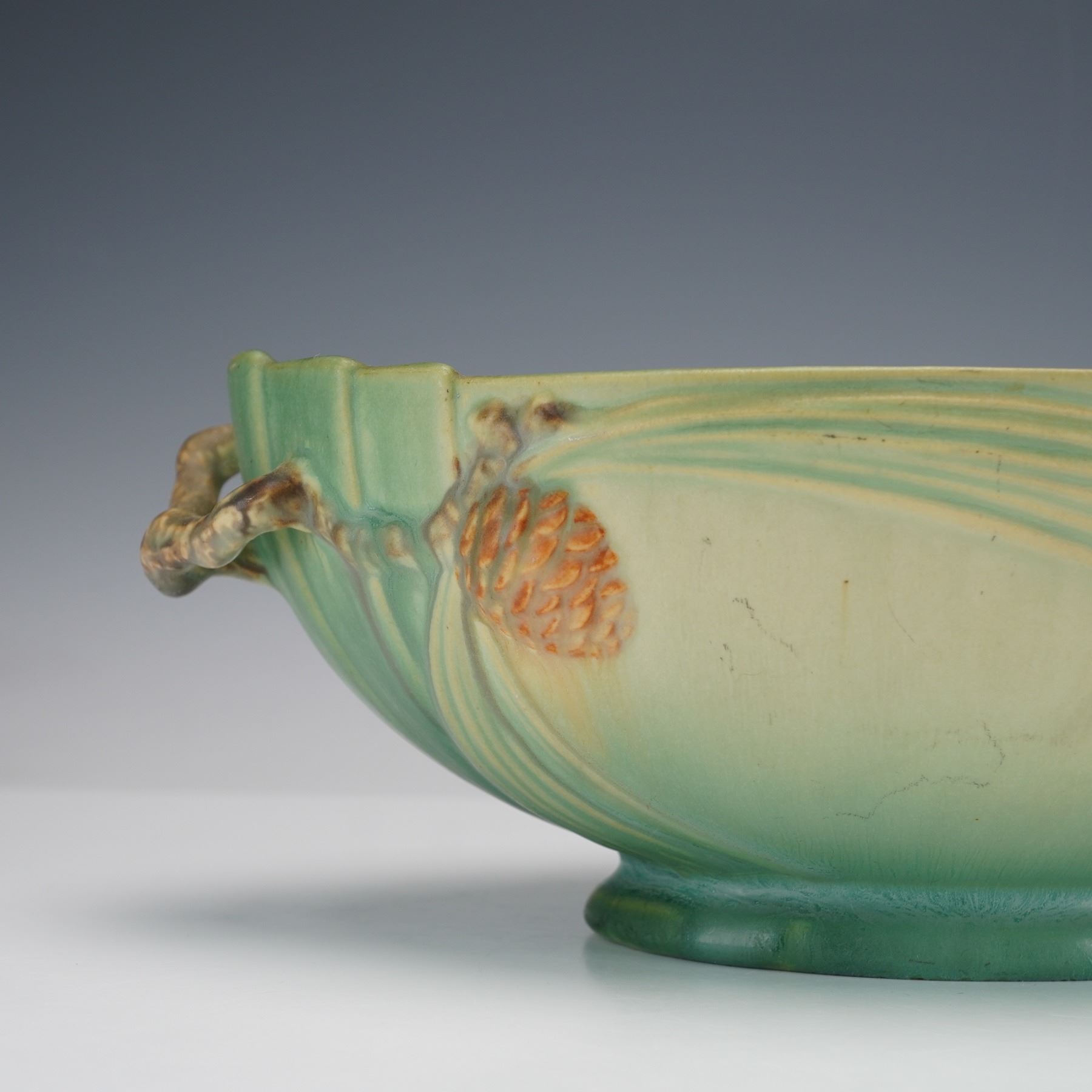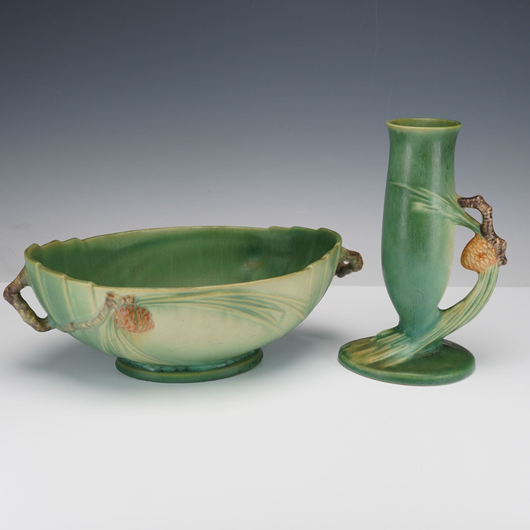 Pinecone pattern, introduced in 1935 grouping includes an oval console bowl and a tall handled vase, each finished in the green glaze variation. The design features sculpted pinecones and needles along textured branch-like handles, showcasing Roseville's signature blend of naturalistic detail and refined Art Deco styling. Both pieces are marked Roseville with corresponding shape numbers on the base.