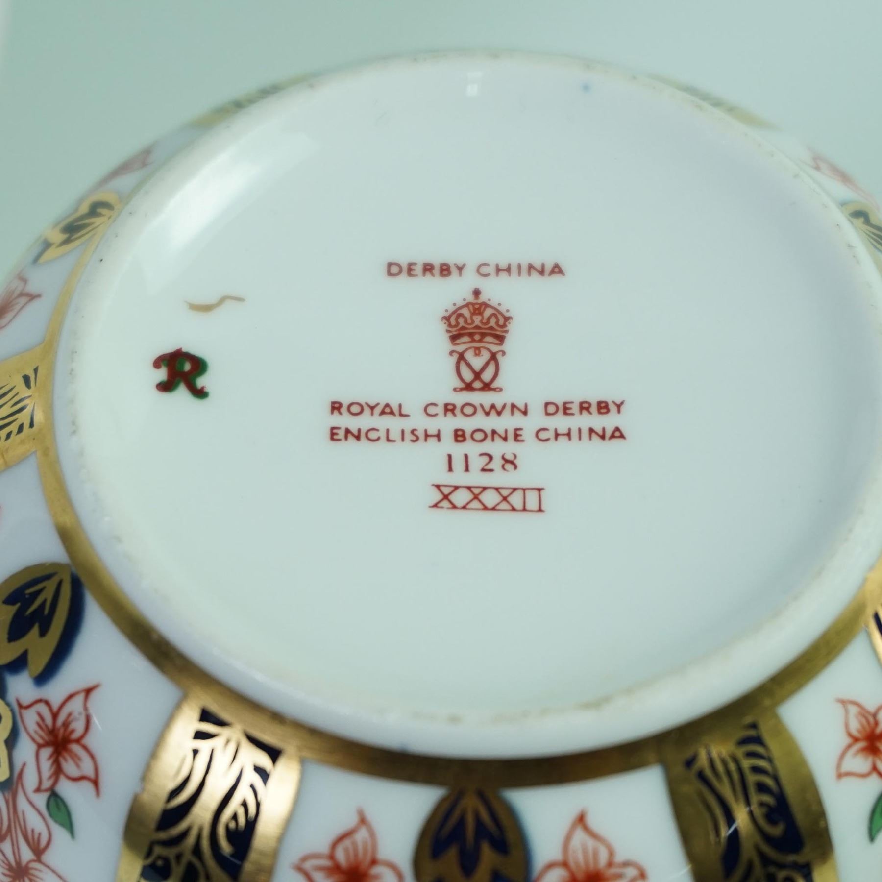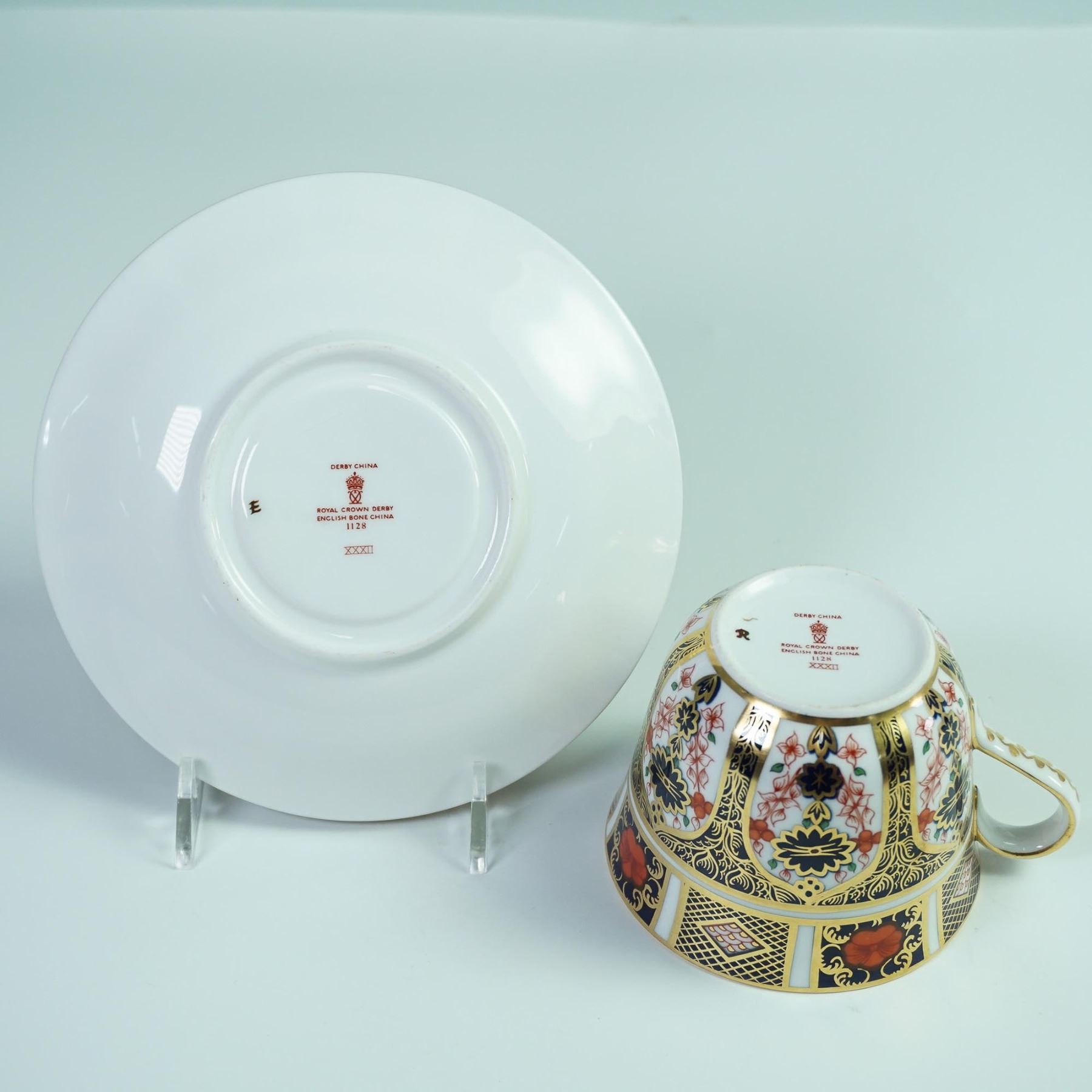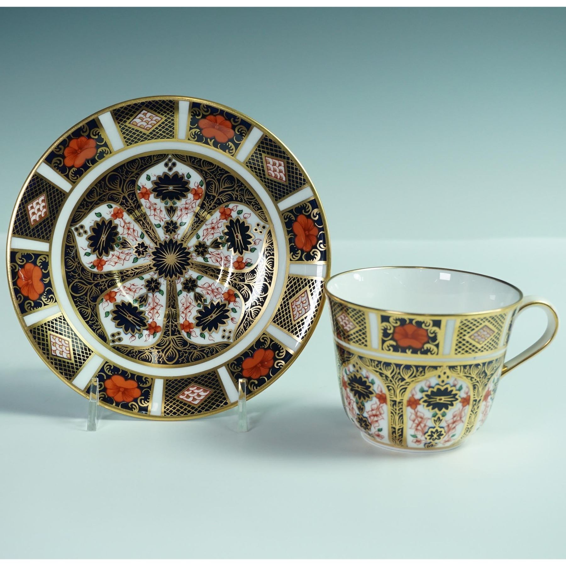 A fine Royal Crown Derby porcelain teacup and saucer in the iconic Old Imari pattern 1128. This richly decorated set features a bold palette of cobalt blue, iron red, and lavish 22-karat gold accents in an intricate design inspired by traditional Japanese Imari ware. The pattern is applied over a classic white ground, with a central starburst motif and repeating floral and geometric panels around the borders. Marked on the base with the Royal Crown Derby red backstamp and pattern number 1128, along with Roman numerals indicating the date code. Cup measures 2.75"H and saucer 6" dia.