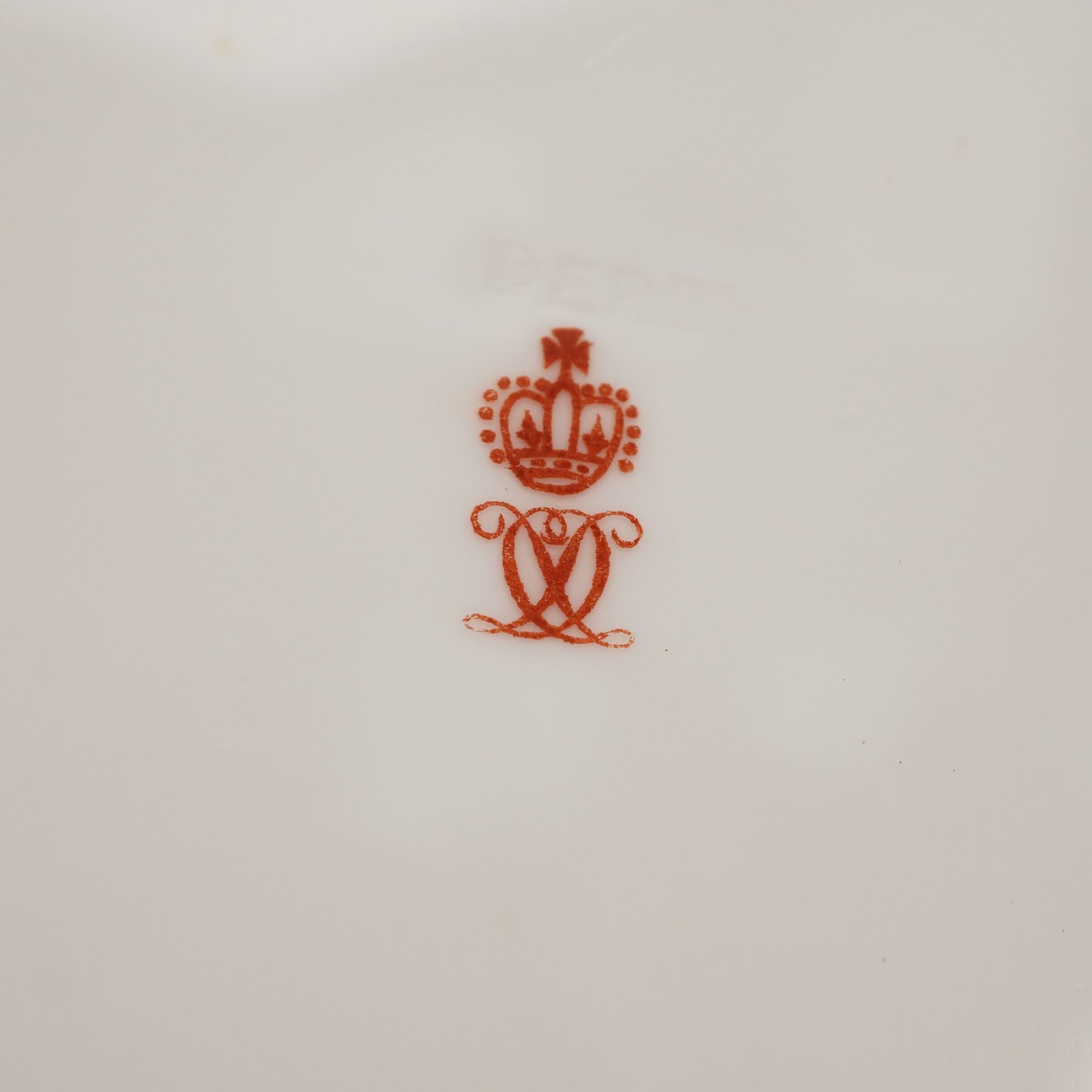 This set of two Royal Crown Derby hand painted Orchid cake plates features exquisite orchid designs. One plate is adorned with a soft apricot border, while the other has a light blue border, both complemented by delicate floral motifs in vibrant colors. The gold detailing adds an extra touch of elegance, and each plate is marked with the Royal Crown Derby backstamp.