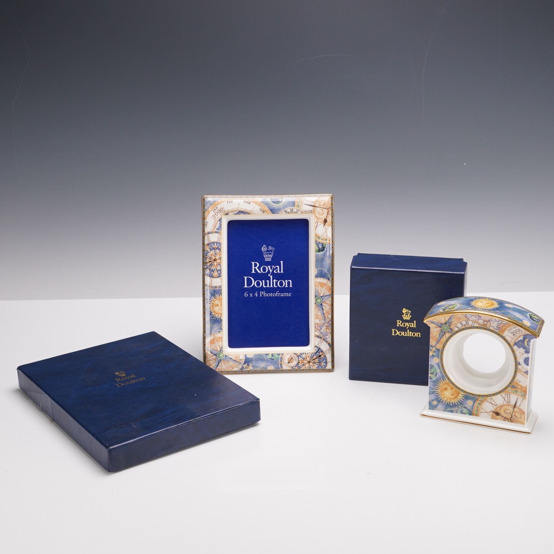 Royal Doulton bone china decorative accessories from the Millennium collection, comprising a 6 x 4 inch photo frame and a clock case. Each piece is decorated with an intricate celestial inspired design in blue, gold, and cream with gilt accents, showcasing Royal Doulton's fine craftsmanship. Both items are fully marked on the underside with the Royal Doulton backstamp. Includes original Royal Doulton presentation boxes.