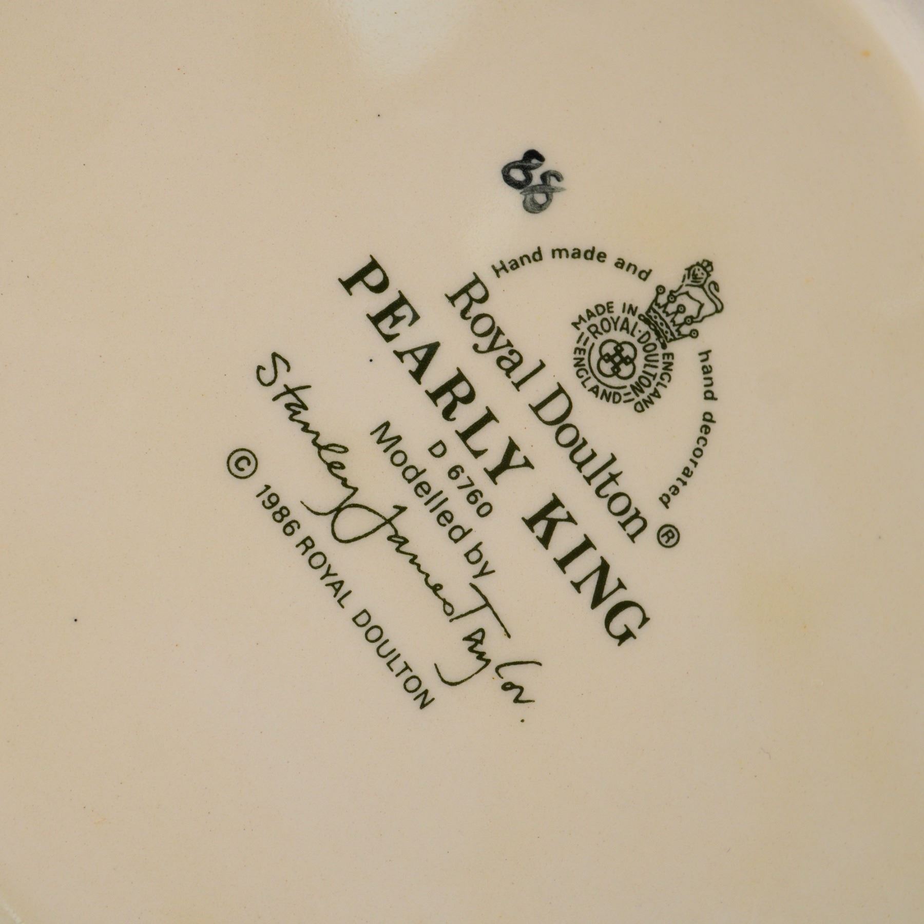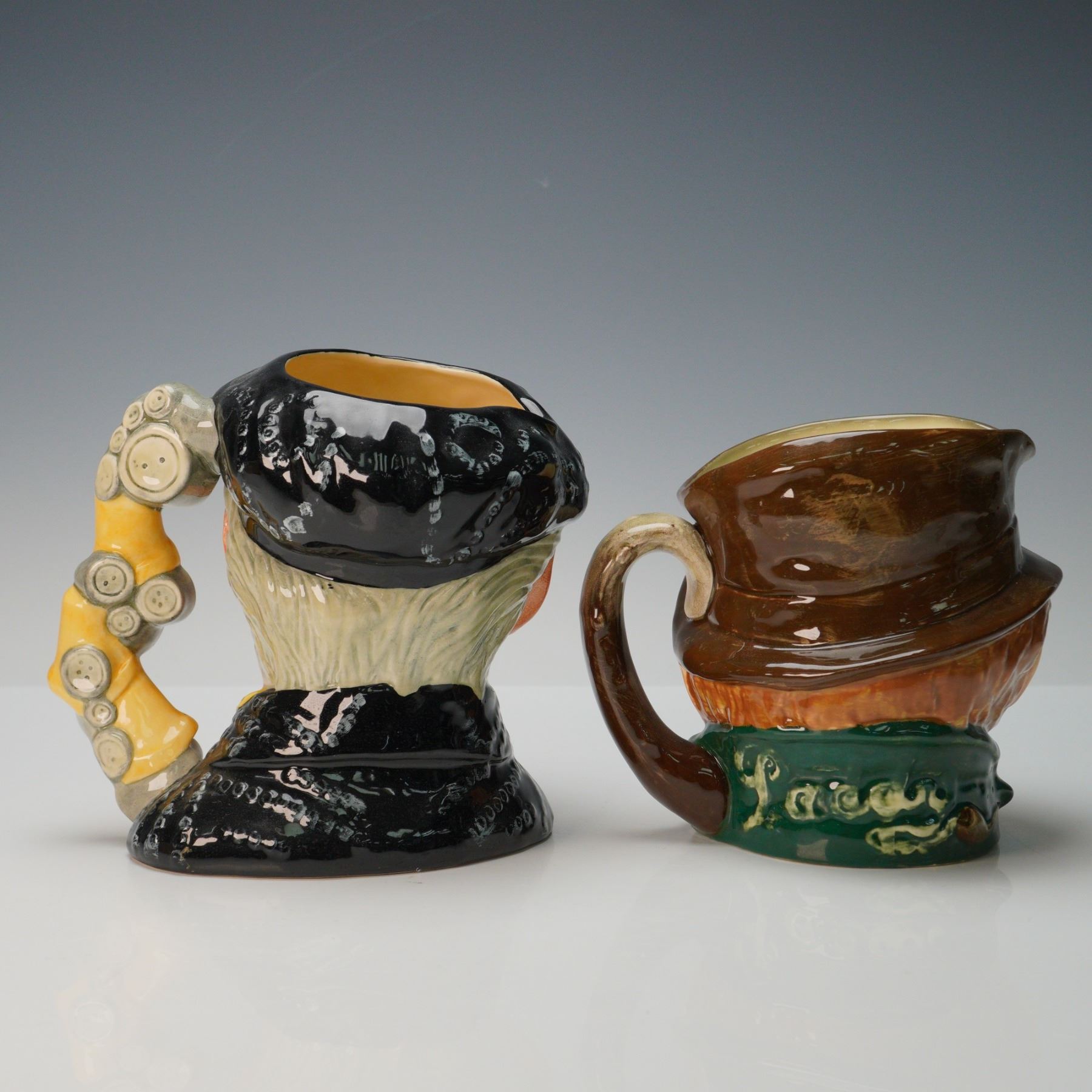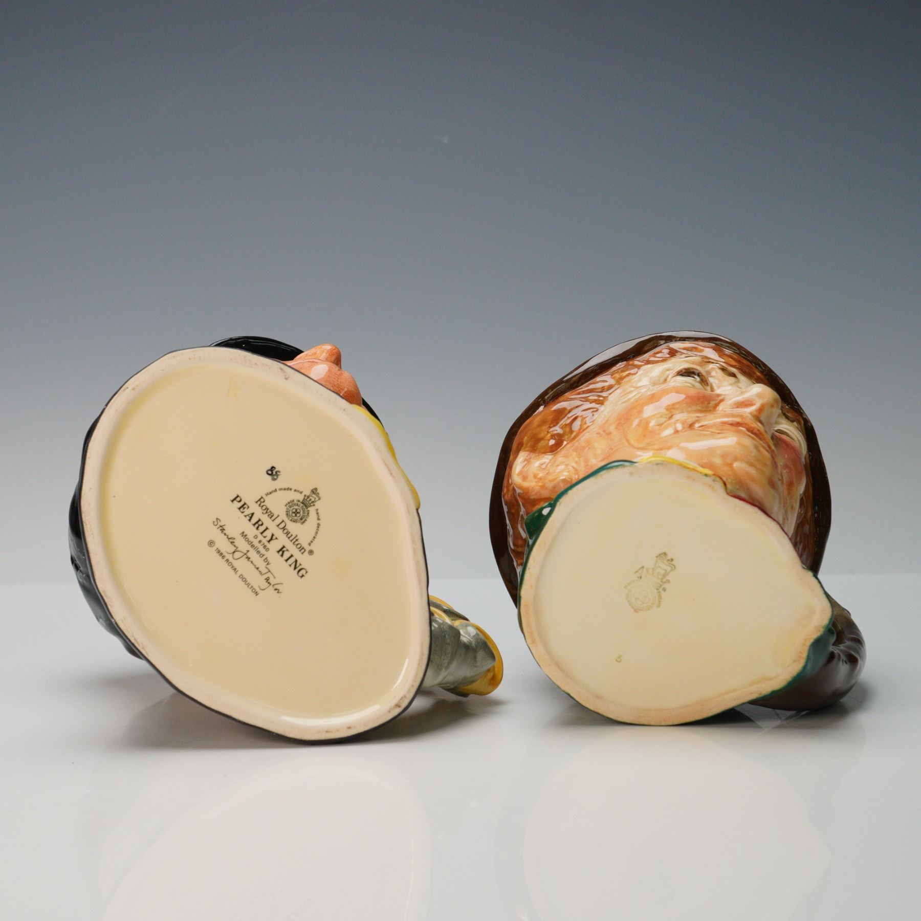 Pair of Royal Doulton character jugs, featuring the Pearly King D6760, hand made and hand decorated, modelled by Stanley James Taylor in 1986, with a distinctive button-adorned cap and scarf. Accompanied by the Paddy character jug, depicting a jovial figure in a brown cap and green scarf. Both pieces bear the Royal Doulton backstamp and display the fine detailing and vibrant hand painting that define the brand's celebrated craftsmanship.