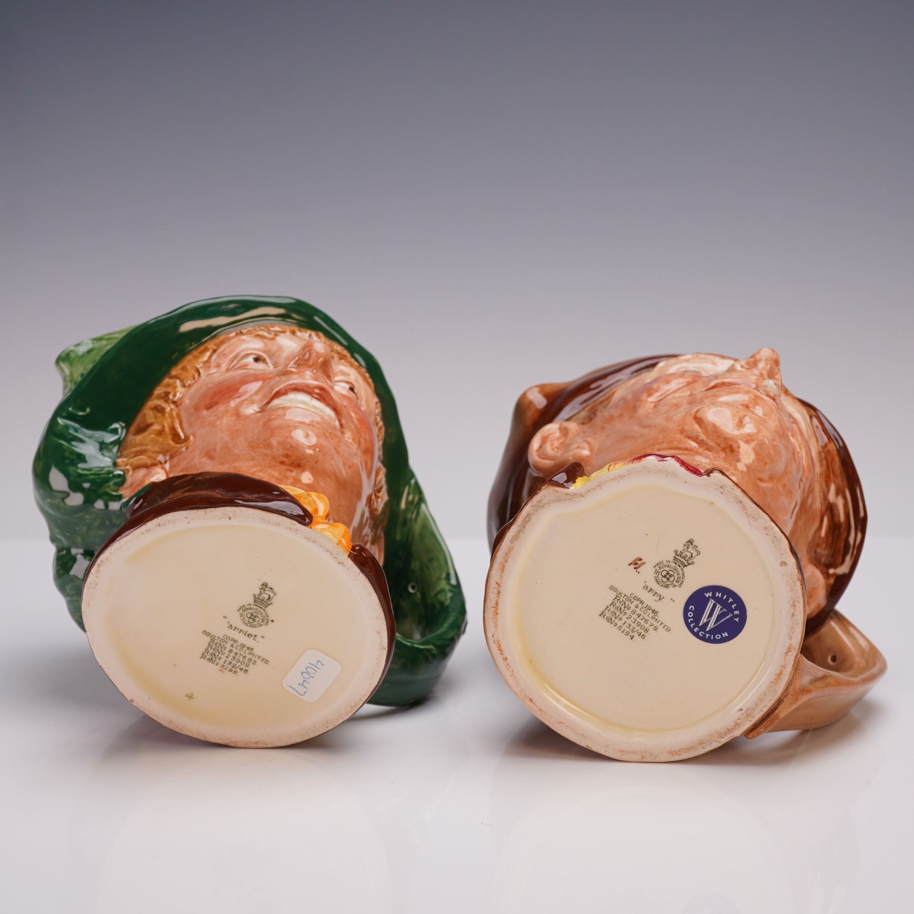 A pair of Royal Doulton character jugs comprising Arry D6207 and Arriet D6208, both modeled with expressive features in colorful hand painted glazes, with distinctive period headwear and attire. Each jug is marked to the base with the Royal Doulton backstamp. Largest piece measures 7"L x 6.5"H.
