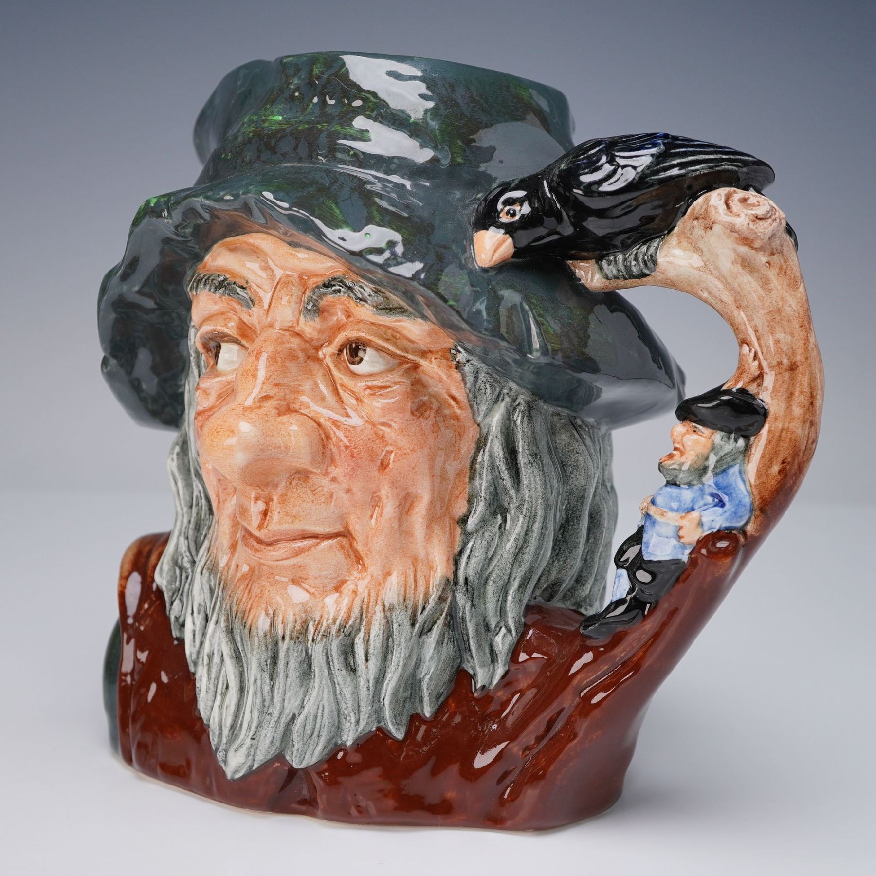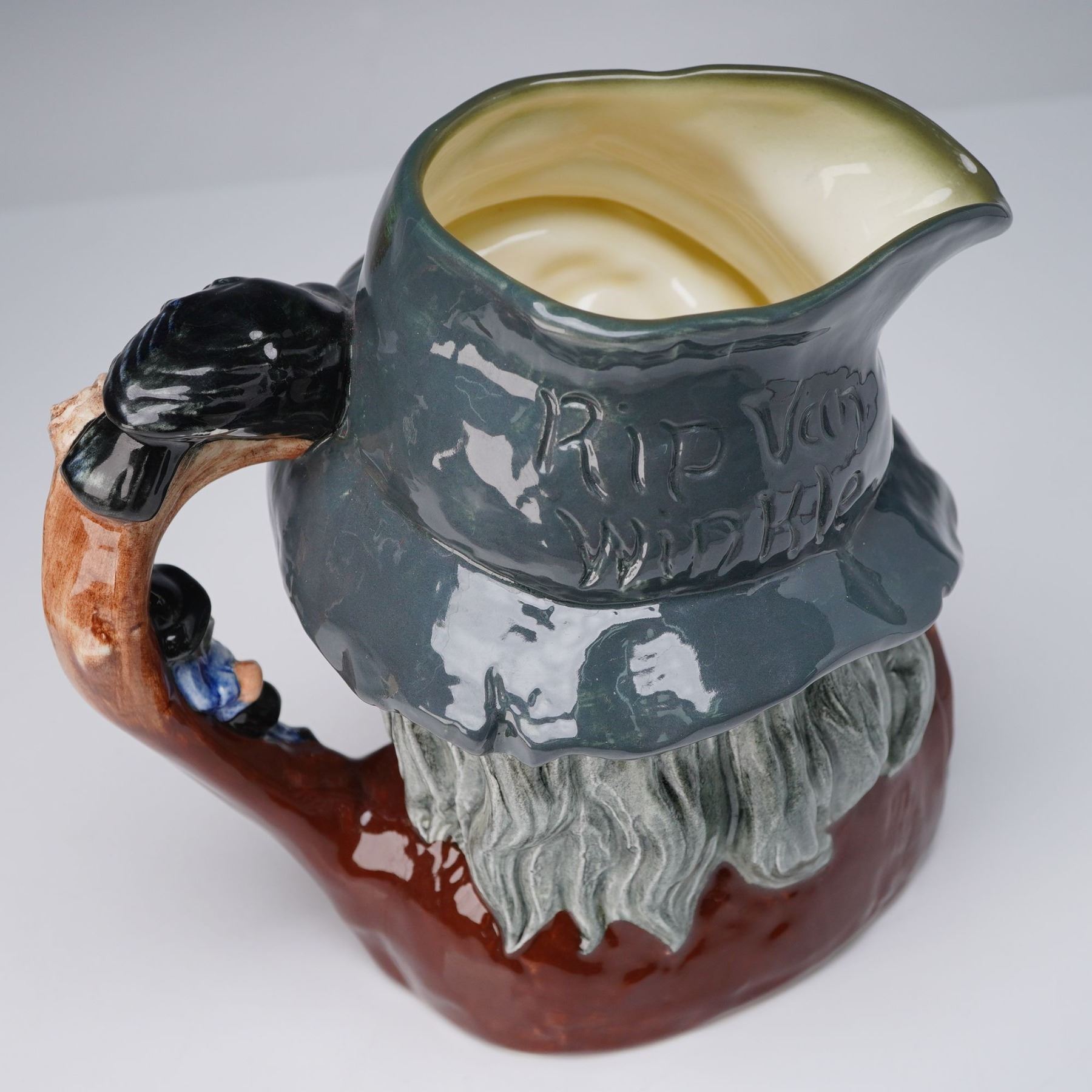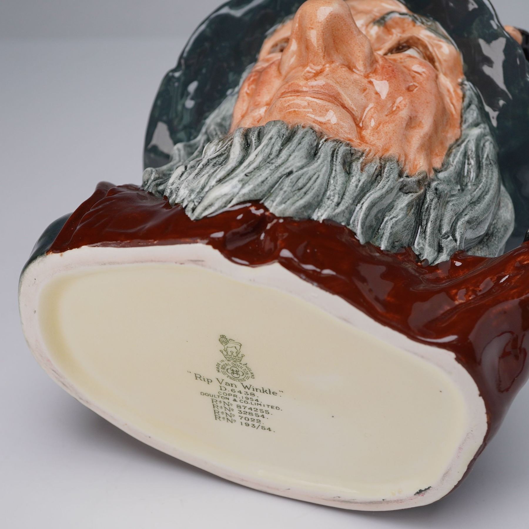 A pair of Royal Doulton character jugs including Rip Van Winkle, model D6438, depicting the legendary bearded figure wearing a green hat with a handle featuring a raven and miniature figure, and Jolly Toby, a seated toby jug holding a tankard and pipe. Both bear Royal Doulton backstamps to the base.