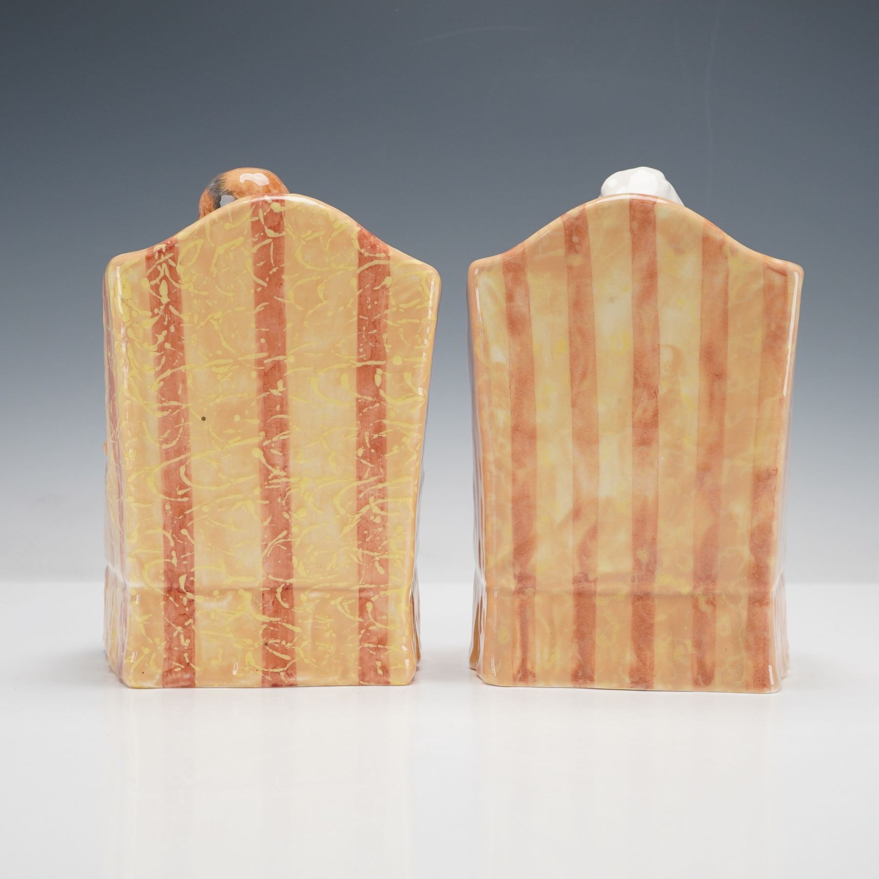 Two porcelain figures depicting an elderly couple seated in armchairs, each accompanied by a small animal. Uncle Ned HN2094 shows an older man in a brown coat and green trousers, holding a blue mug with his black dog at his feet. Forty Winks HN1974 portrays an elderly woman in a green shawl and white apron, dozing with her black cat beside her. Both pieces feature rich hand-painted detail and carry the Royal Doulton backstamp to the base, along with their respective model numbers.