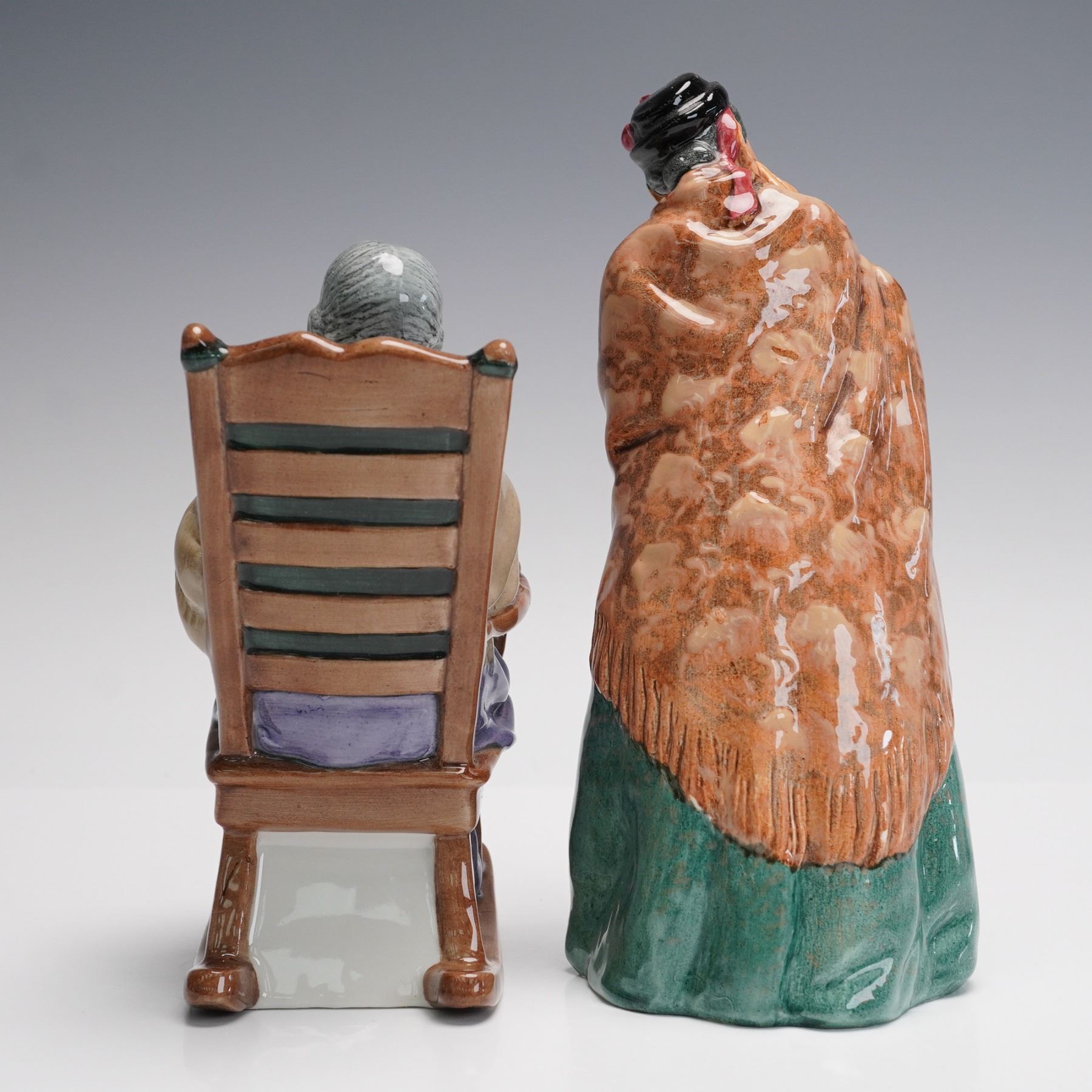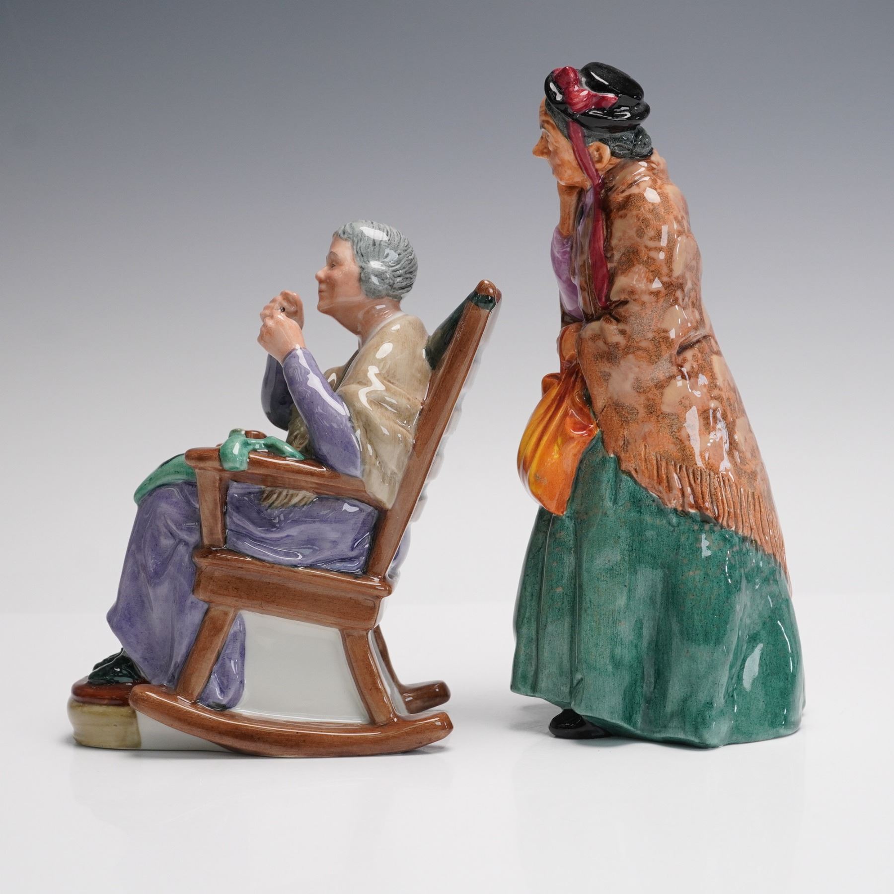 This charming pair of Royal Doulton porcelain figurines includes HN2352 A Stitch in Time, depicting an elderly woman in a rocking chair immersed in her needlework, and HN2170 Bridget, shown in a shawl and skirt with a shopping bag in hand, exuding personality and character. Both pieces are hand-painted in vivid tones and stamped on the base with the Royal Doulton hallmark, along with detailed registration numbers. A Stitch in Time was issued in 1966, and Bridget dates to 1950, both capturing the quaint domestic scenes Royal Doulton is celebrated for. These mid-century collectibles display the craftsmanship and narrative charm associated with the brand's best-known figures.