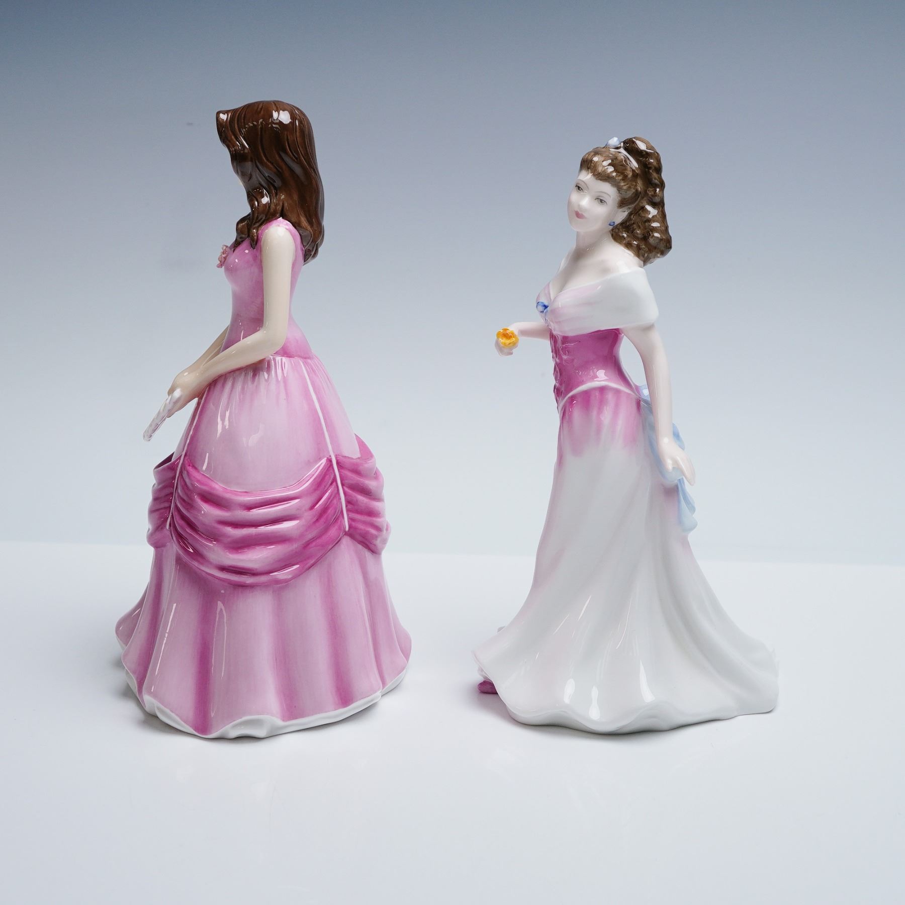 This pair of Royal Doulton bone china figurines showcases the artistry and refinement of English porcelain. "For You" HN3863, issued in 1997, depicts a young woman in an off-shoulder pink and white gown adorned with a delicate blue bow and a small yellow bloom in her hand. Her hair is styled in soft curls with a matching blue ribbon. "Grace" HN4906, a later figure issued in 2006, features a woman with a rose corsage and fan, dressed in a layered pink gown with ruched detailing. Both figures bear clear Royal Doulton backstamps on the base.