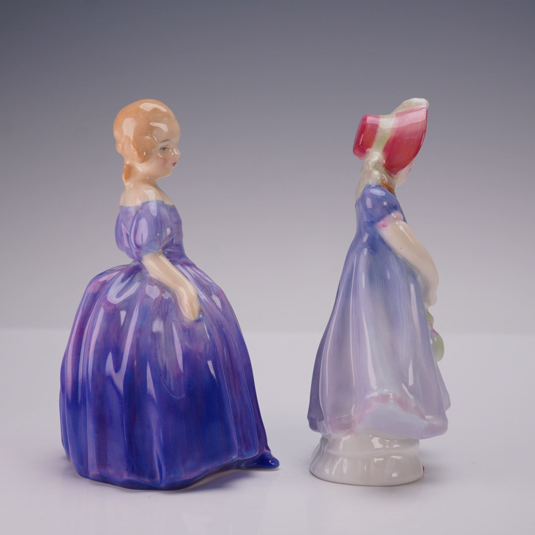 This charming pair of Royal Doulton bone china figurines features two beloved models, "Marie" HN1370 and "Ivy" HN1768, both showcasing the fine craftsmanship and detail for which Royal Doulton is renowned. "Marie," designed by Leslie Harradine and issued between 1933 and 1997, is a classic piece adorned in a rich, deep violet gown with subtle pink undertones and delicate hand-painted detailing, reflecting the elegance of the early 20th century. Beside her is "Ivy," introduced in 1935 and retired in the late 20th century, wearing a soft lavender dress accented by a red bonnet and holding a small bouquet of flowers. Both figures are finished in Royal Doulton's signature high-gloss glaze, enhancing the vibrant colors and fine sculpting. Each figurine is stamped on the base with the Royal Doulton backstamp, along with the model name and number for authenticity. These collectible figurines are in excellent condition, with no chips, cracks, or repairs noted, making them a perfect addition for collectors of English fine china or admirers of classic figurative art.