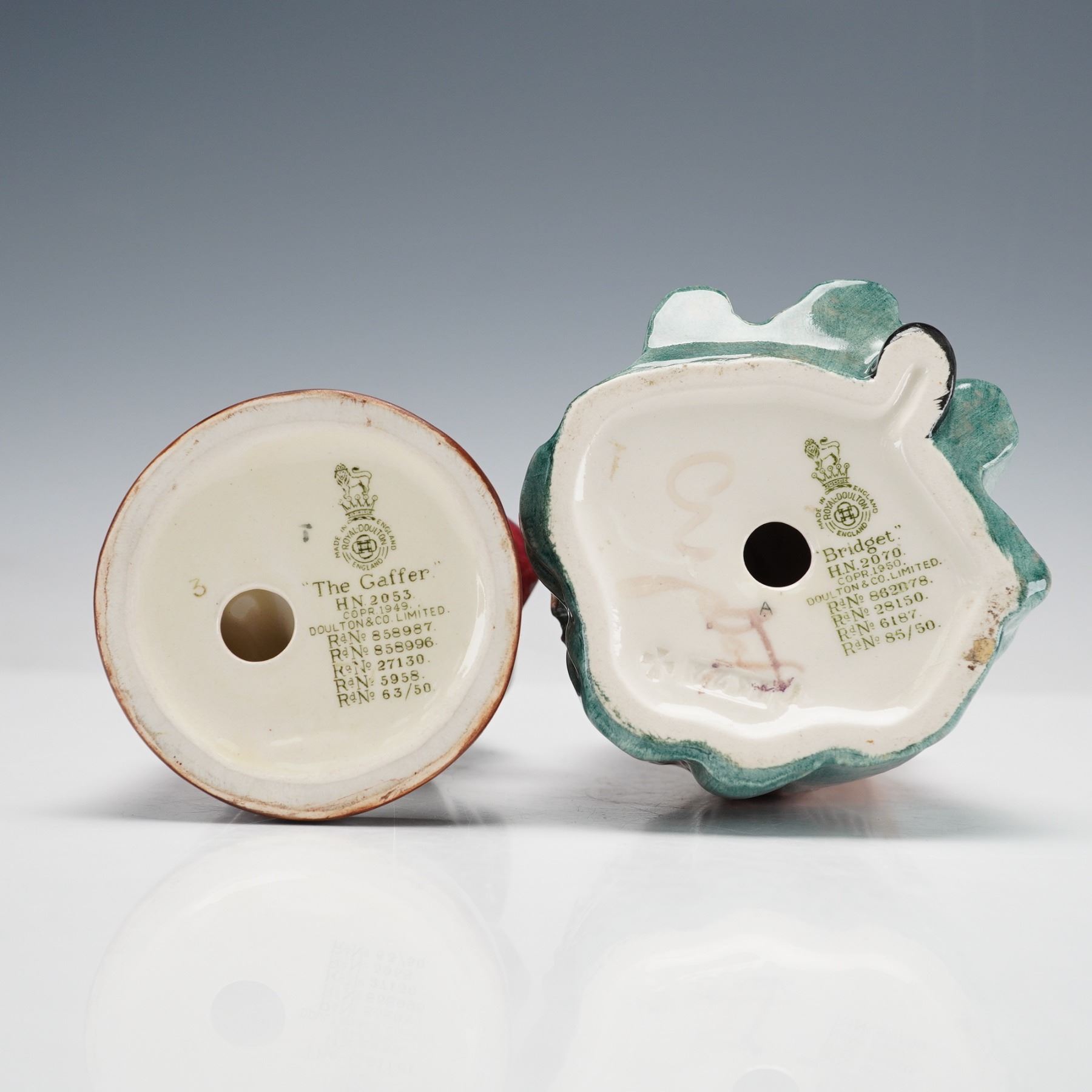 A charming duo of Royal Doulton hand-painted ceramic figurines depicting The Gaffer HN2053 and Bridget HN2070. Each figure is finely modeled with vivid color and expressive detail, capturing the warmth and humor of traditional English country life. The Gaffer, designed by Leslie Harradine and issued from 1949 to 1998, shows an elderly gentleman with a beard, wearing country attire and holding his hat and walking stick. Bridget, designed by Mary Nicholl and issued from 1949 to 1969, portrays a thoughtful older woman carrying a bright yellow bag and dressed in layered shawls and skirt. Both pieces bear the Royal Doulton backstamp and respective model numbers to the undersides.
