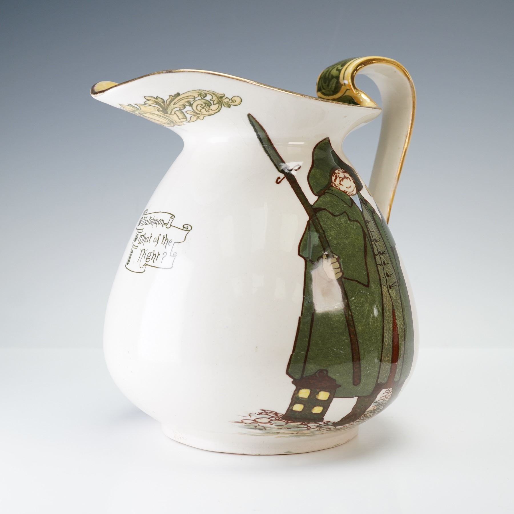 This pair includes the Old Charlie D6030 toby jug and the Watchman What of the Night D1500E pitcher. Old Charlie is shown seated with a cheerful face, holding two foaming mugs of ale while dressed in a green coat, red breeches, and tricorn hat. The Watchman pitcher features a night guard in a long green cloak holding a lantern and halberd, with delicate gold trim accenting the spout and handle. Both pieces display Royal Doulton's traditional craftsmanship and storytelling charm. Royal Doulton backstamp.
