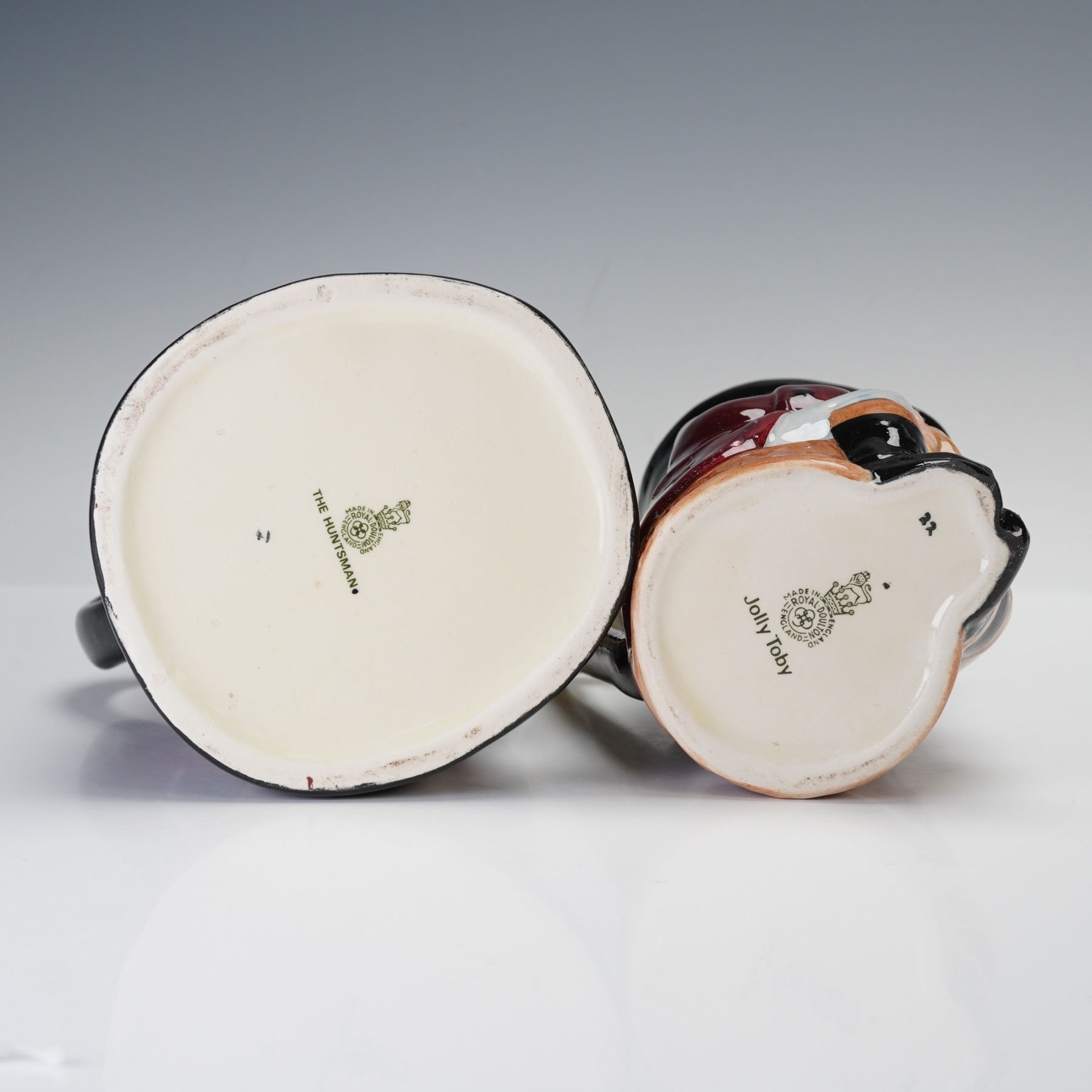 The Huntsman features a portly figure dressed in a deep red coat and black hat, holding a whip in one hand and exuding a look of quiet authority. Jolly Toby is shown seated with a cheerful expression, holding a mug and cane while wearing a matching red coat and tricorn hat. Both jugs exhibit glossy finishes and fine detail that highlight Royal Doulton's classic craftsmanship. Royal Doulton backstamp.
