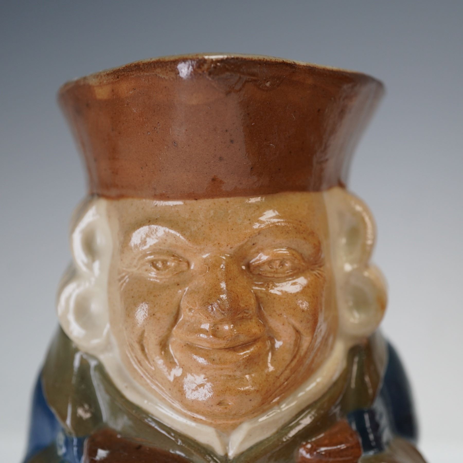 Toby XX is depicted sitting atop a barrel marked XX while holding a jug, dressed in rich red and brown tones with a tricorn hat. The Standing Man wears a blue coat and brown hat and is shown with a cheerful expression. Both display the fine craftsmanship characteristic of early Toby jugs. Royal Doulton backstamp. Royal Doulton Lambeth backstamp.