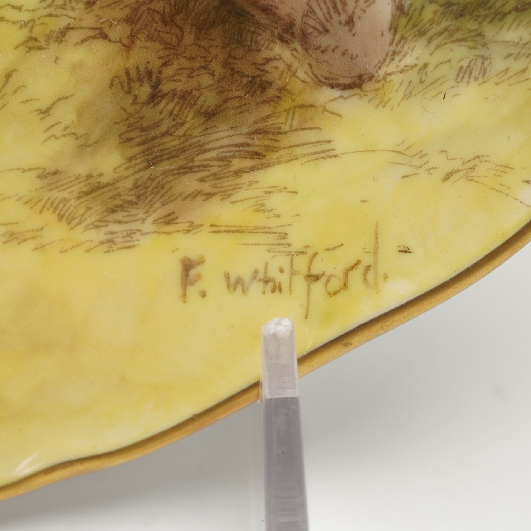 Two hand painted plates with picturesque English rural landscapes, one titled Elmlery and signed by the artist F. Whitford and the other titled Little Combeton and signed by the artist to the left side. The scenes feature charming thatched cottages nestled amid tranquil countryside setting. Royal Worcester backstamp.
