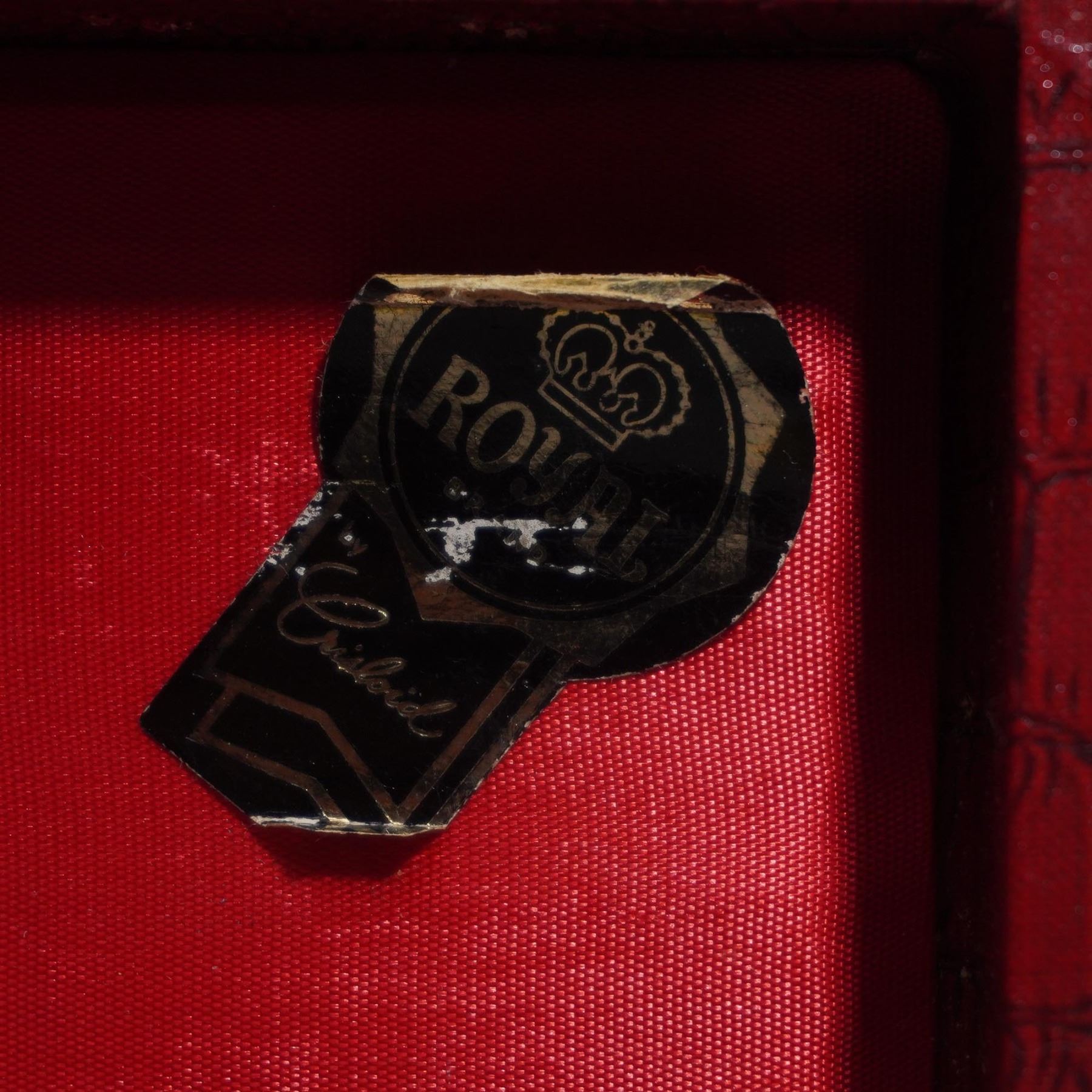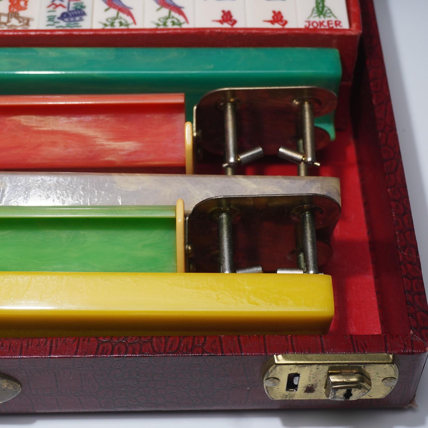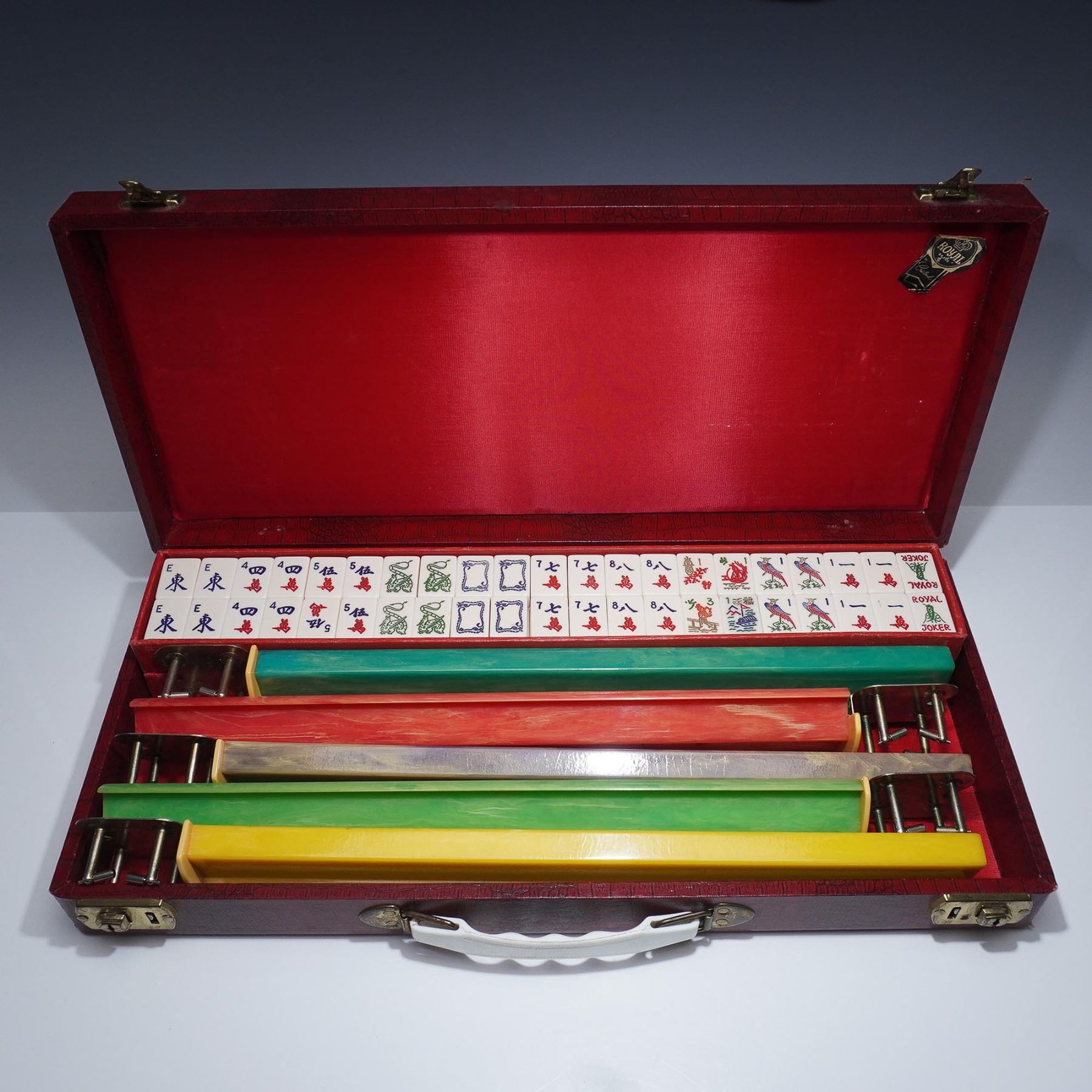 A 20th century, game board game involving skill, strategy and luck. This set includes 5 multicolored racks, 143 bakelite tiles, and a bag with extra tiles. The game tiles and racks are fitting into a red leather-like carry case box. Royal by Crisloid label to interior of case.