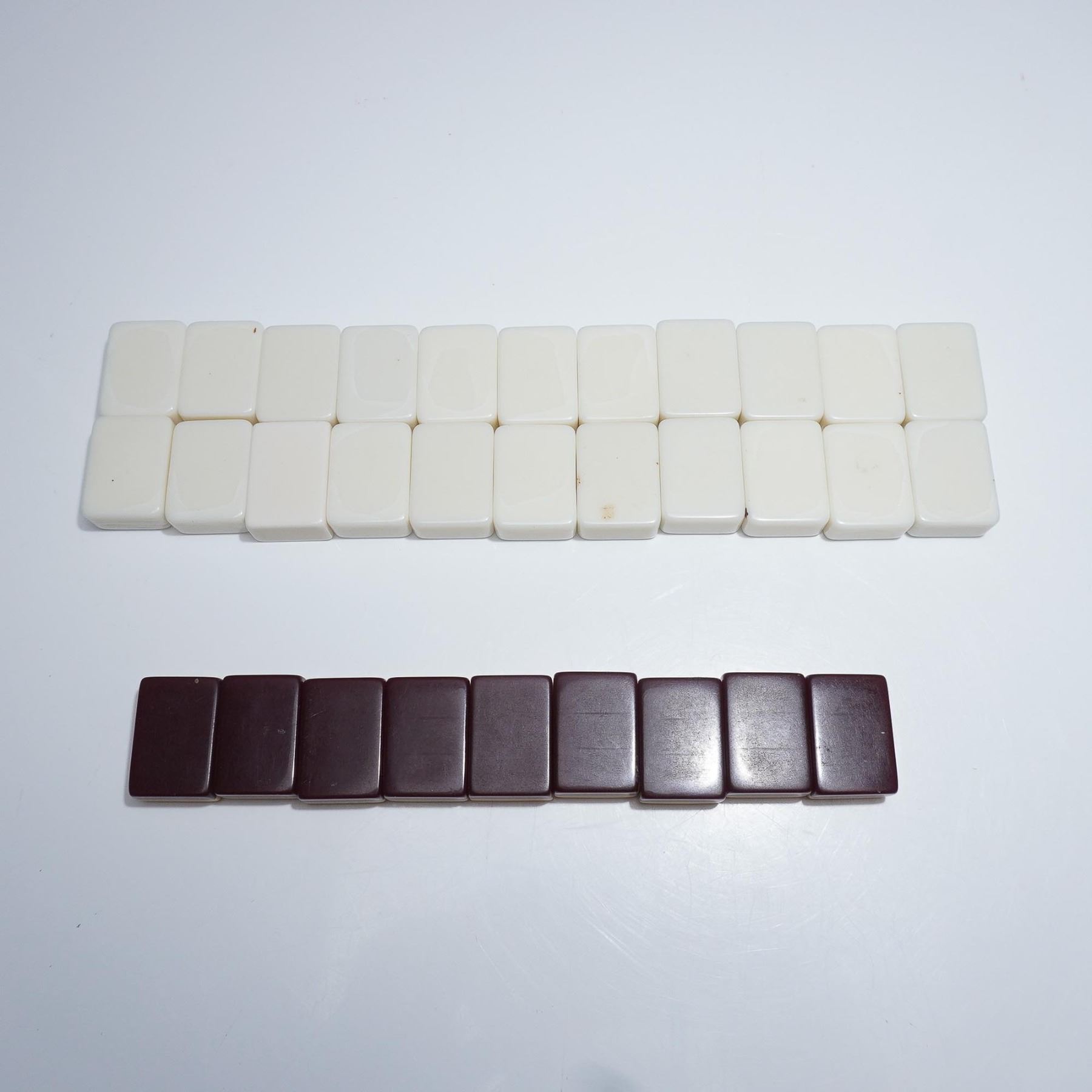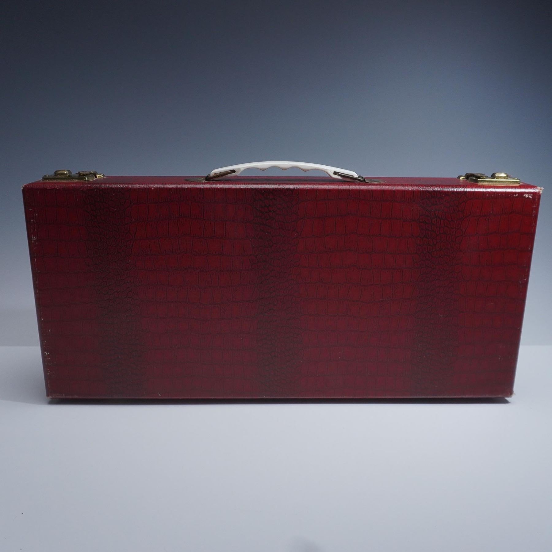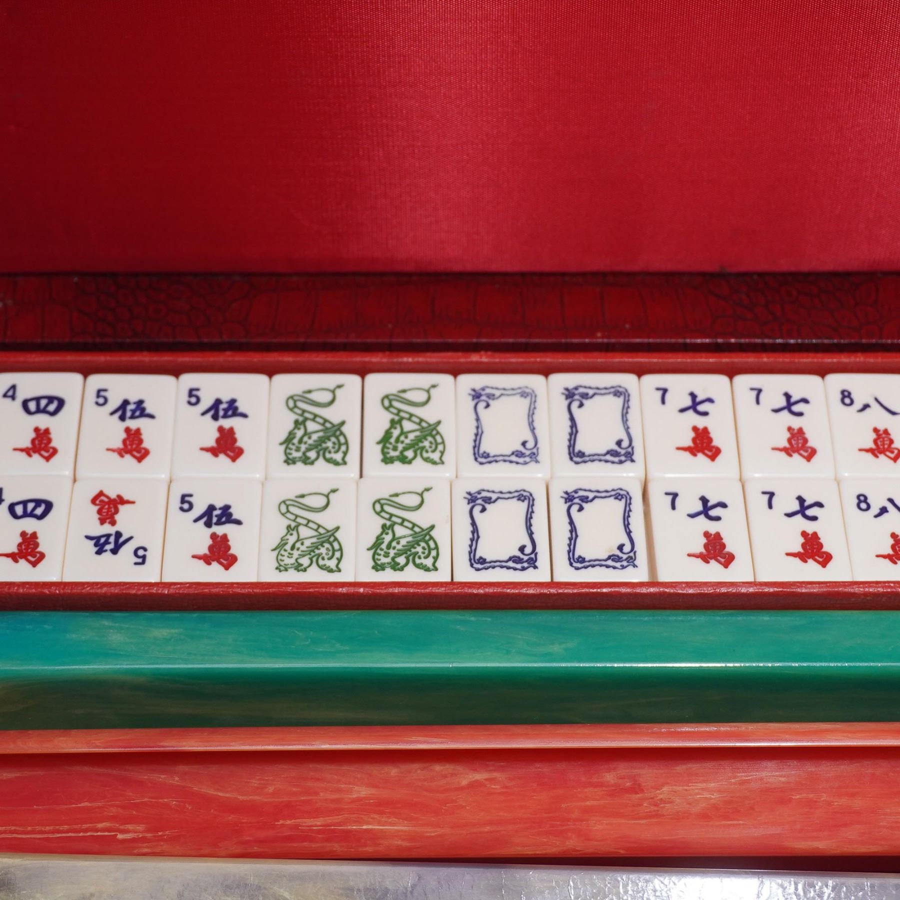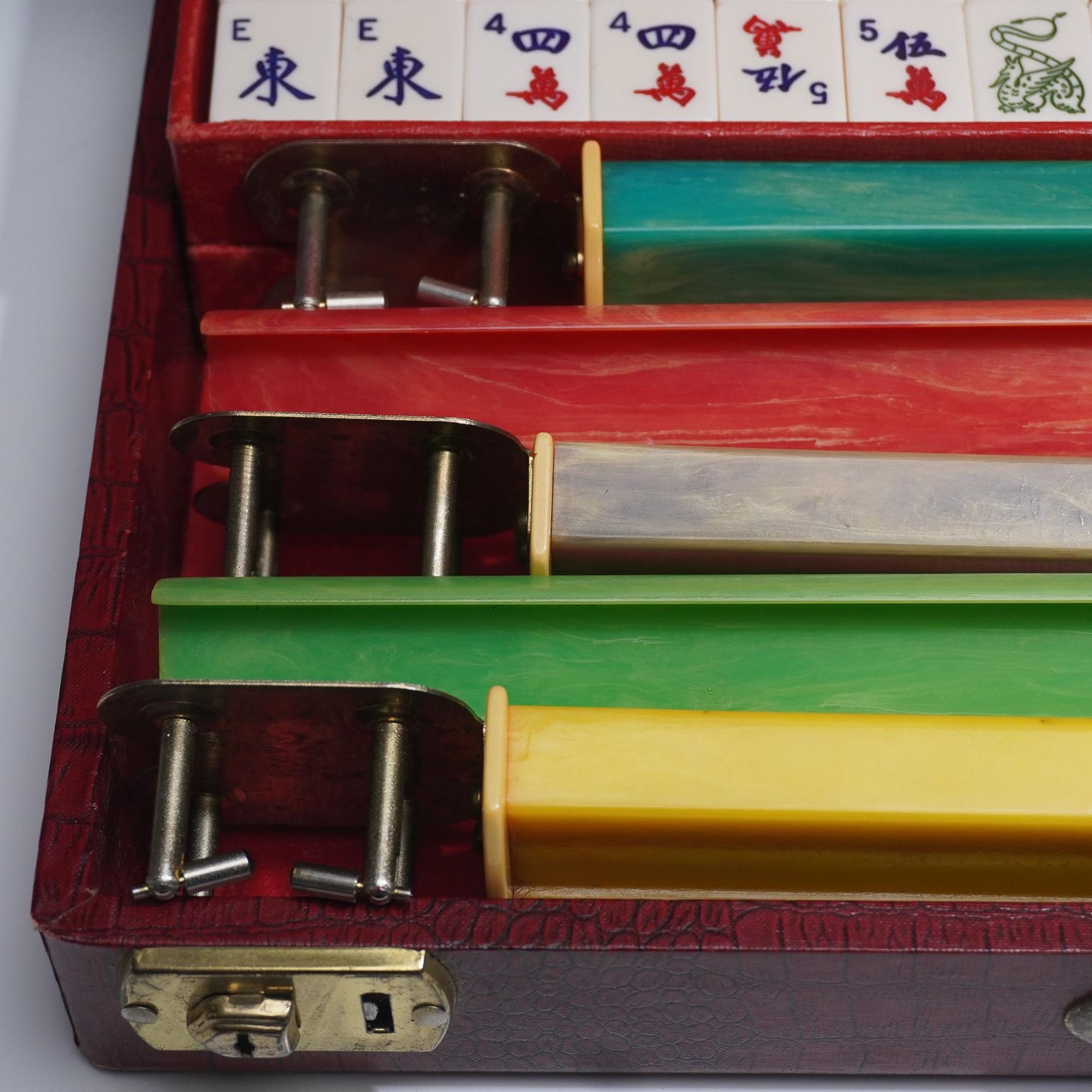 A 20th century, game board game involving skill, strategy and luck. This set includes 5 multicolored racks, 143 bakelite tiles, and a bag with extra tiles. The game tiles and racks are fitting into a red leather-like carry case box. Royal by Crisloid label to interior of case.