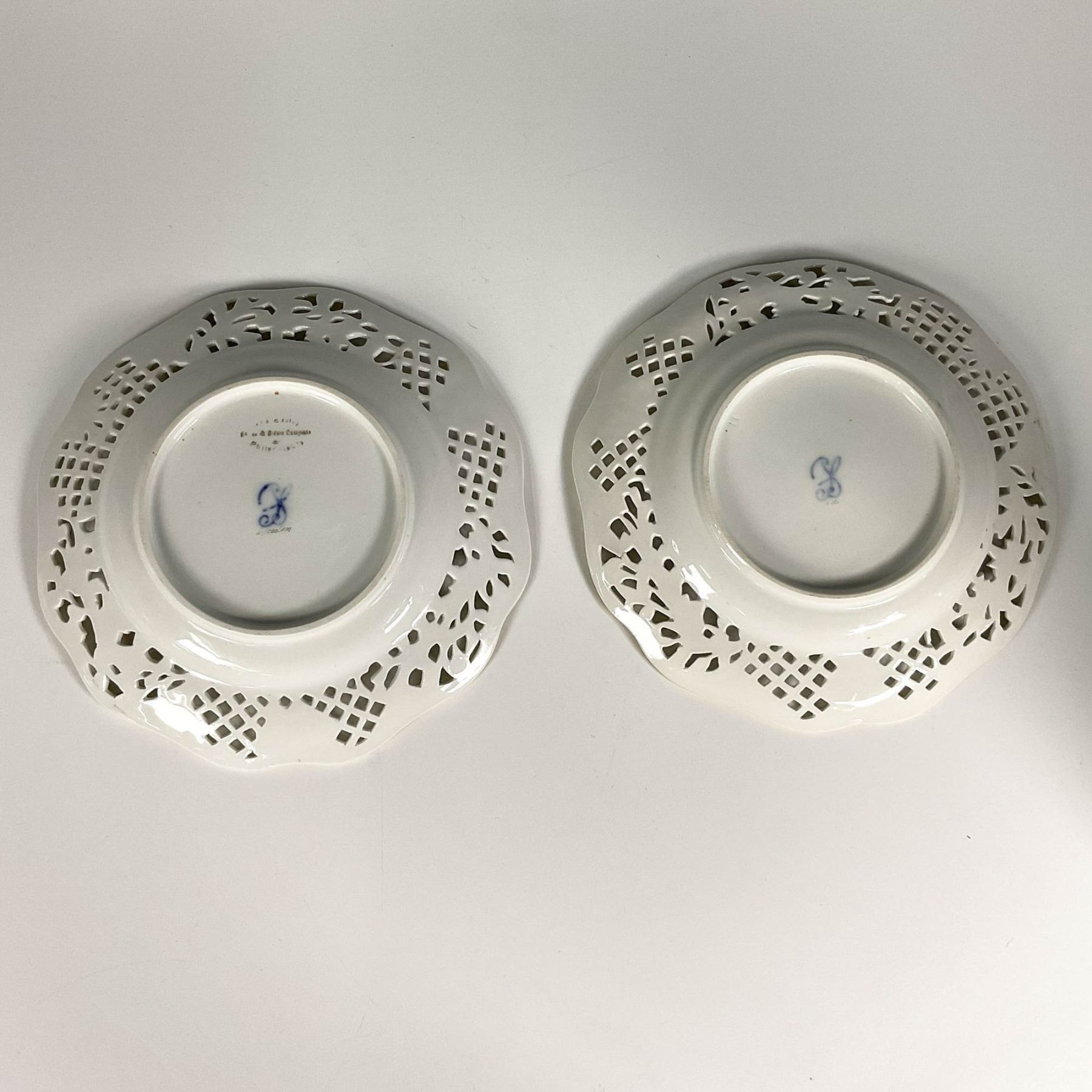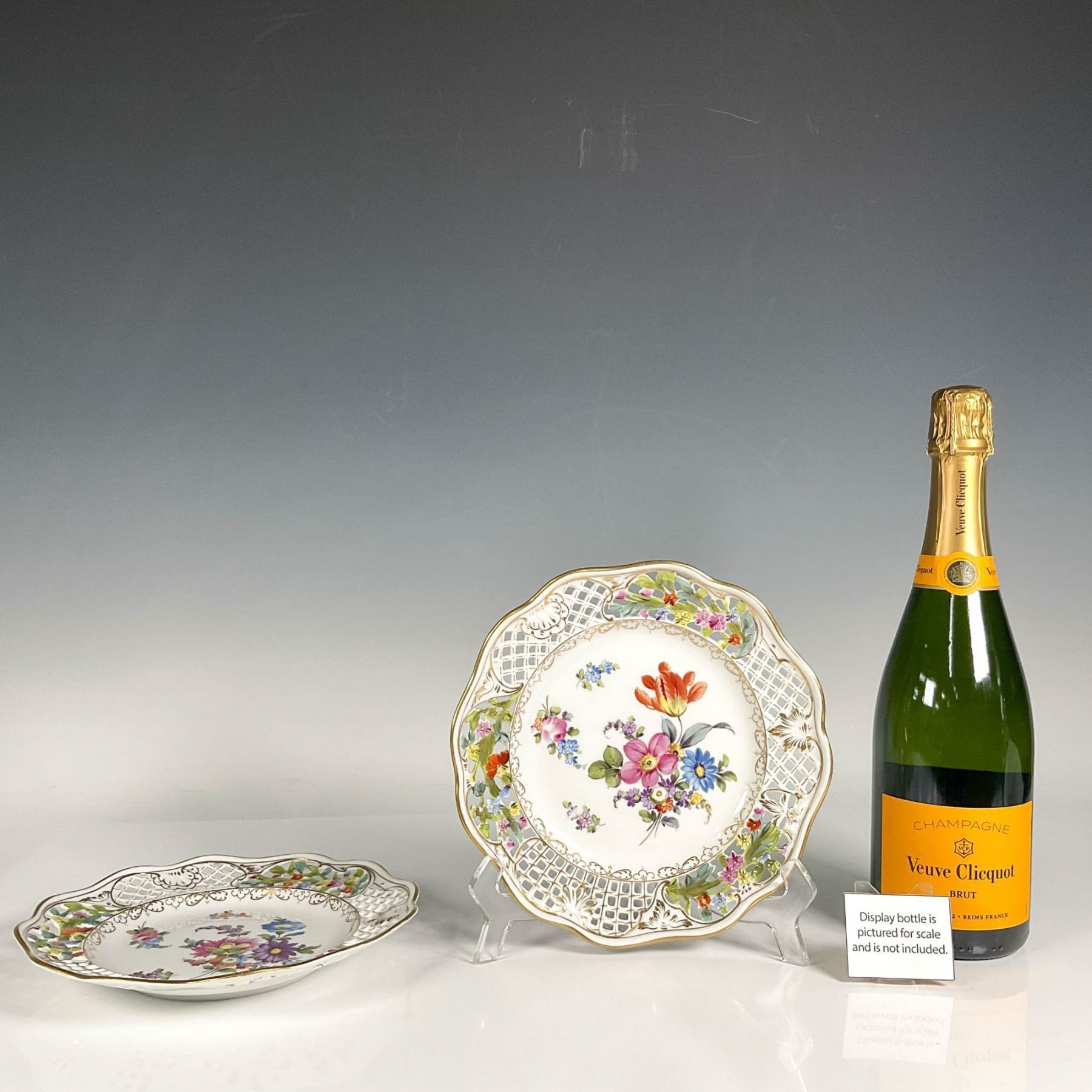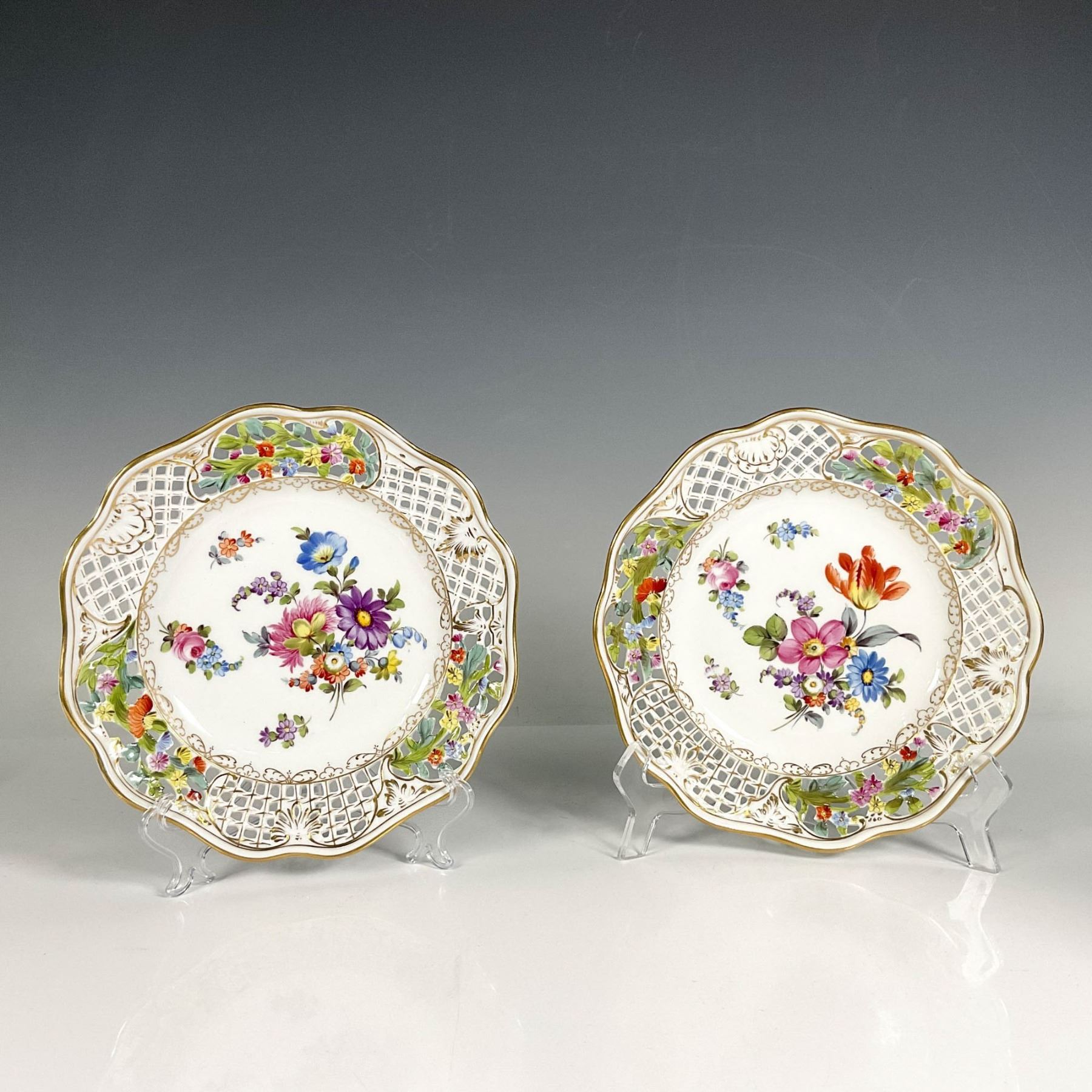 Two hand painted serving plates, each elaborately adorned with a central spray of blooming flowers, encircled by a floral reticulated border and finished with a gilt rim. SP Dresden marks on the bottom.