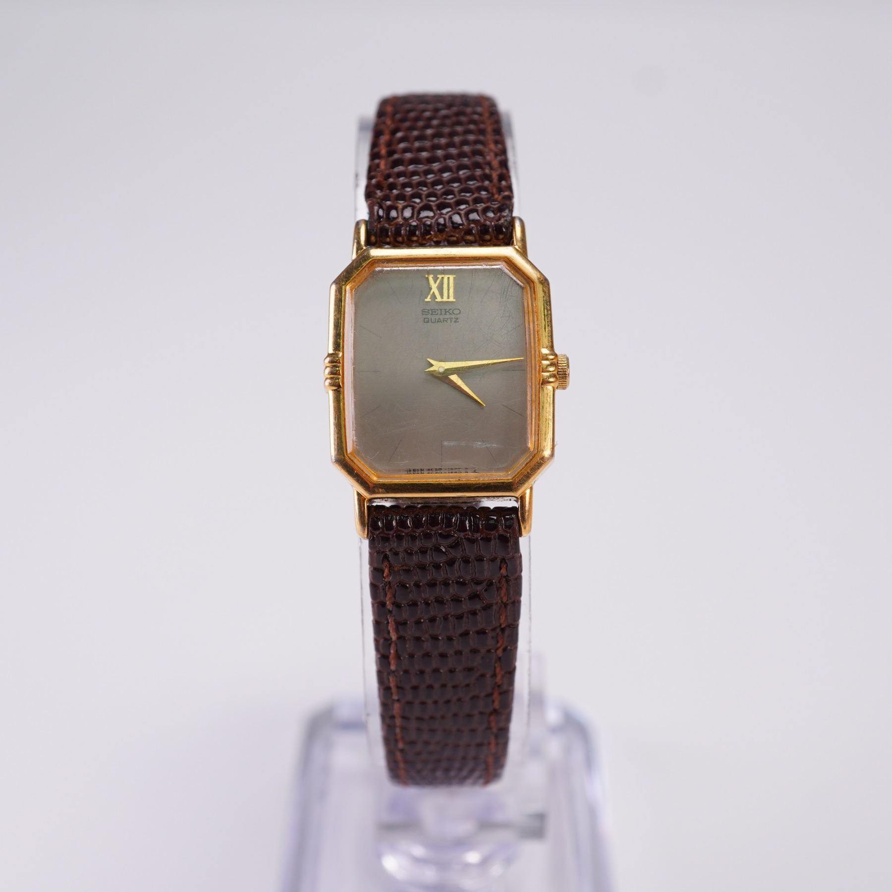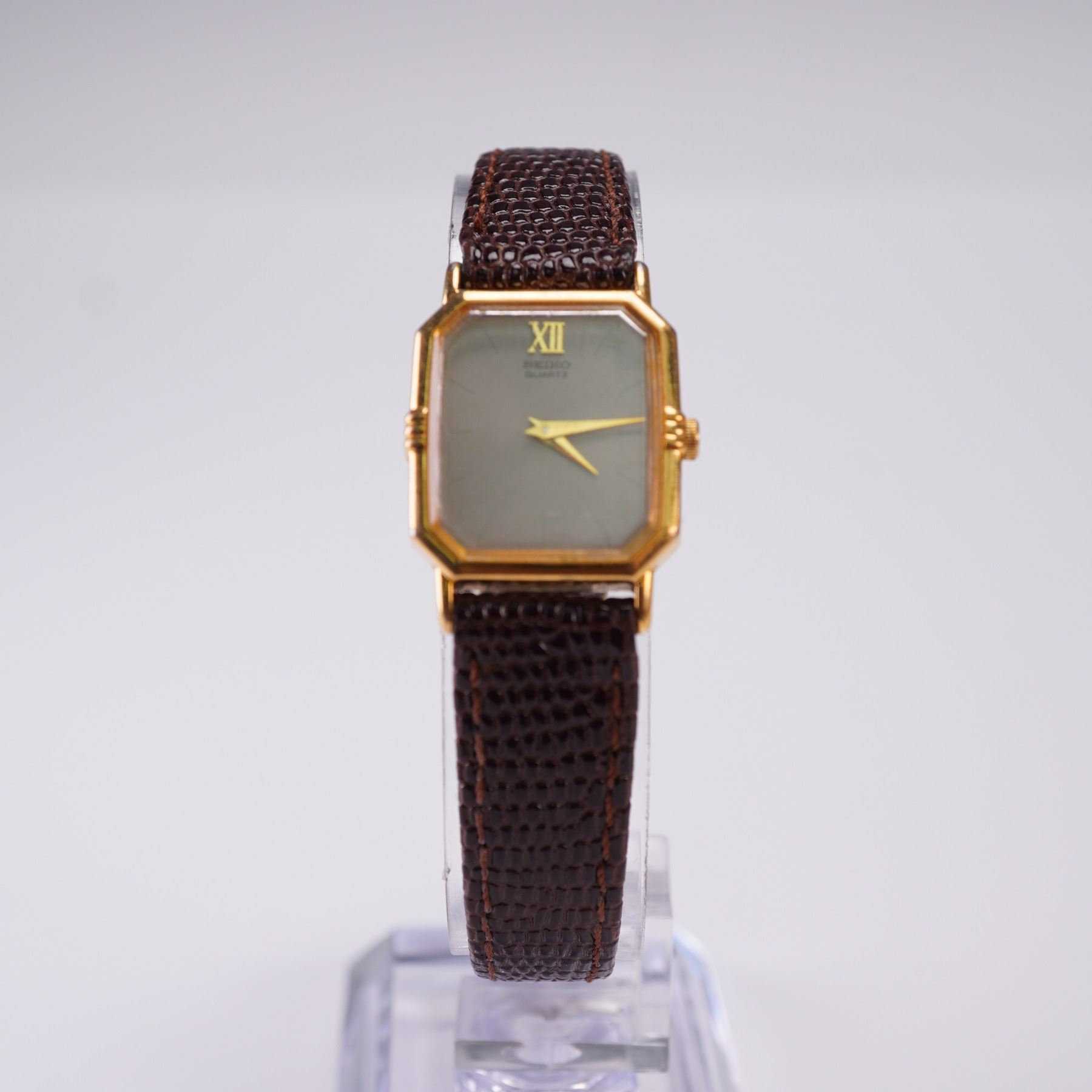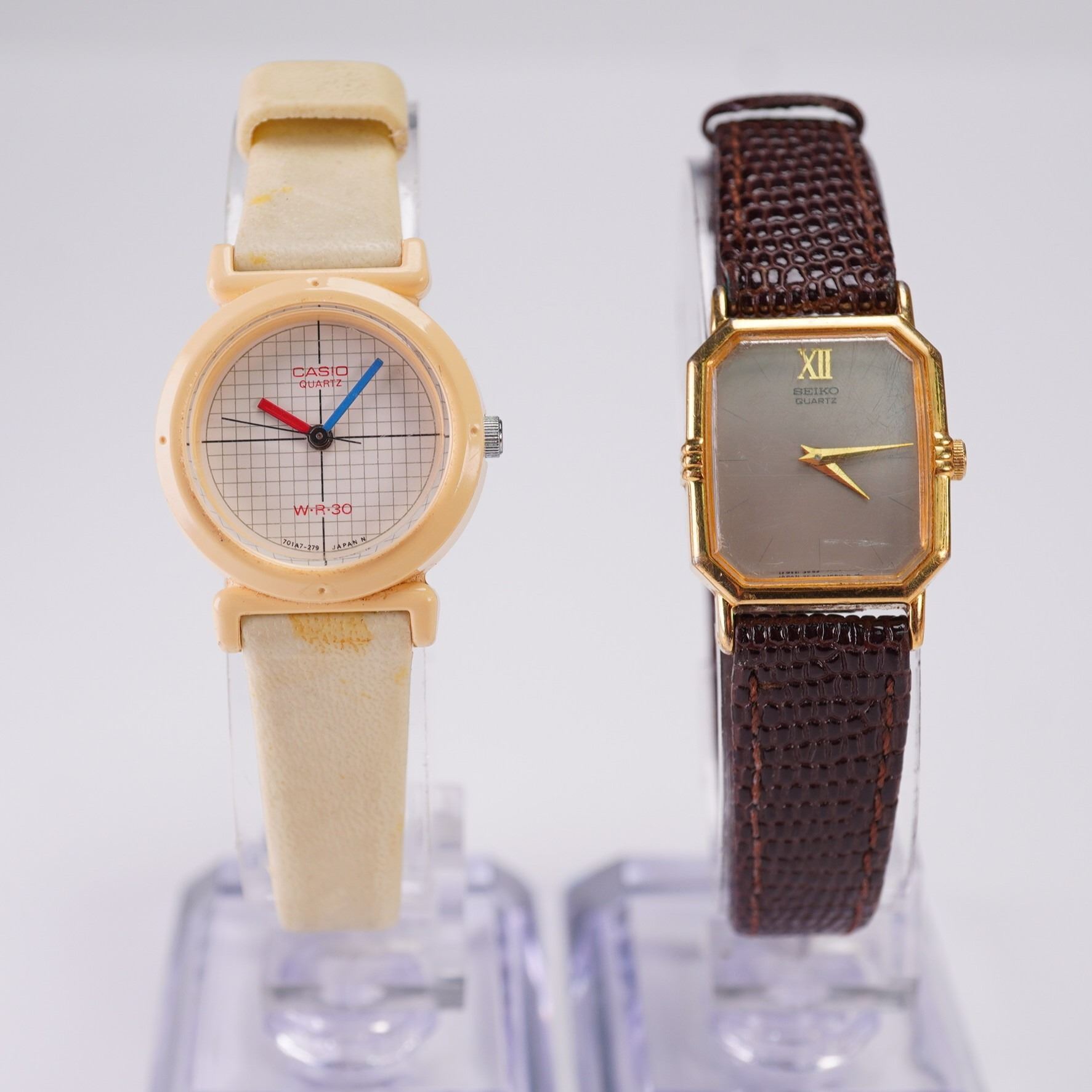 Lot includes two vintage ladies quartz wristwatches. The Casio has a round cream-tone case with a grid dial, red and blue hands, and a cream strap measuring 8.25"L. The Seiko features a rectangular gold-tone case with a brown textured band and Roman numeral dial, band measures 8"L. Watch faces measure approximately 23.6mm and 18.8mm.