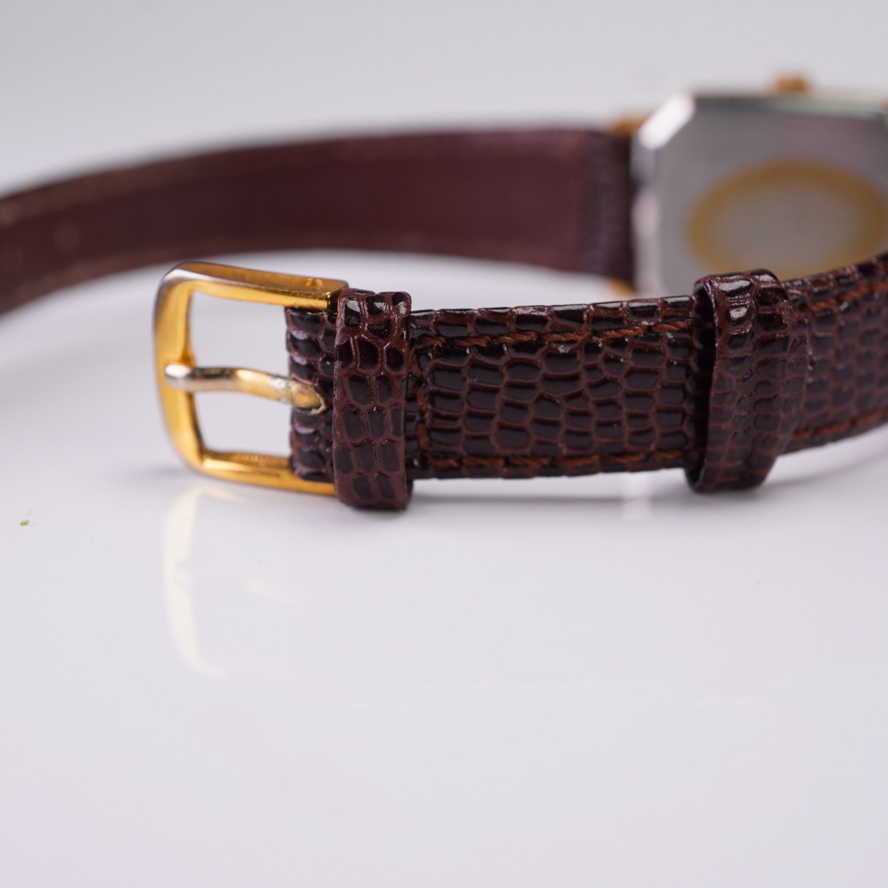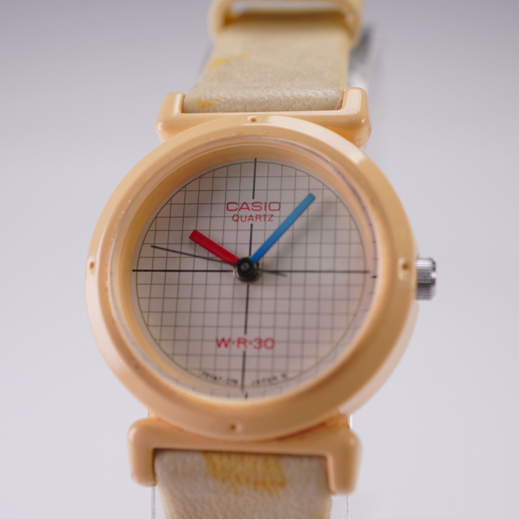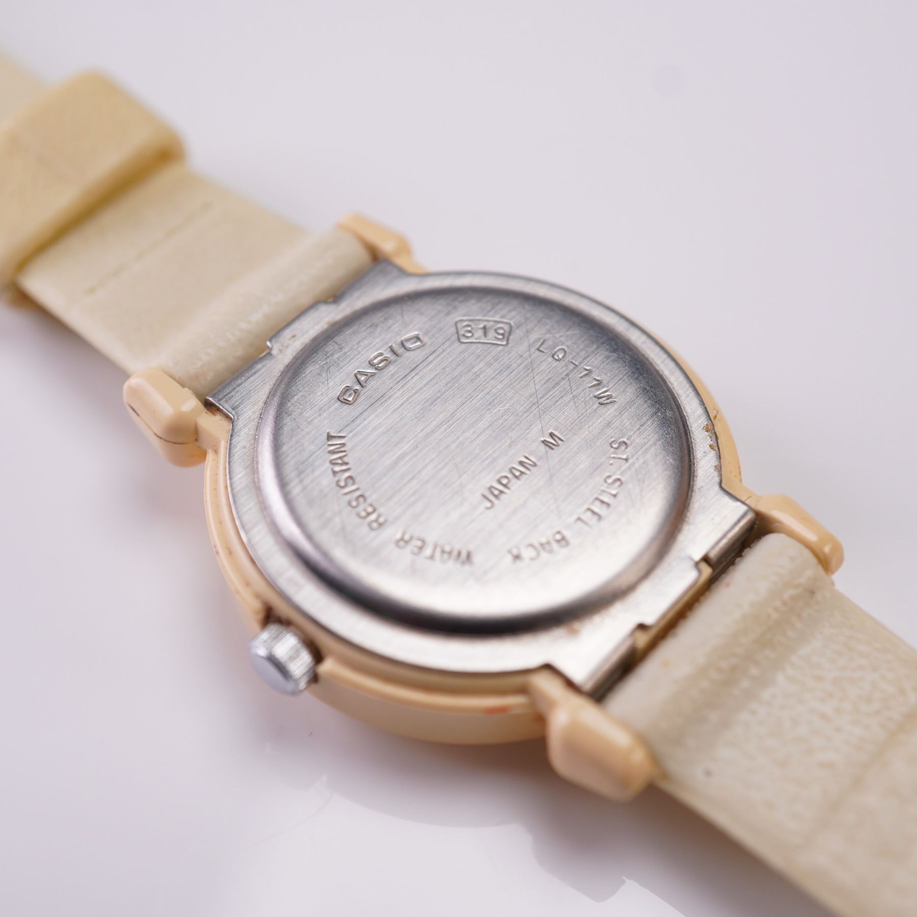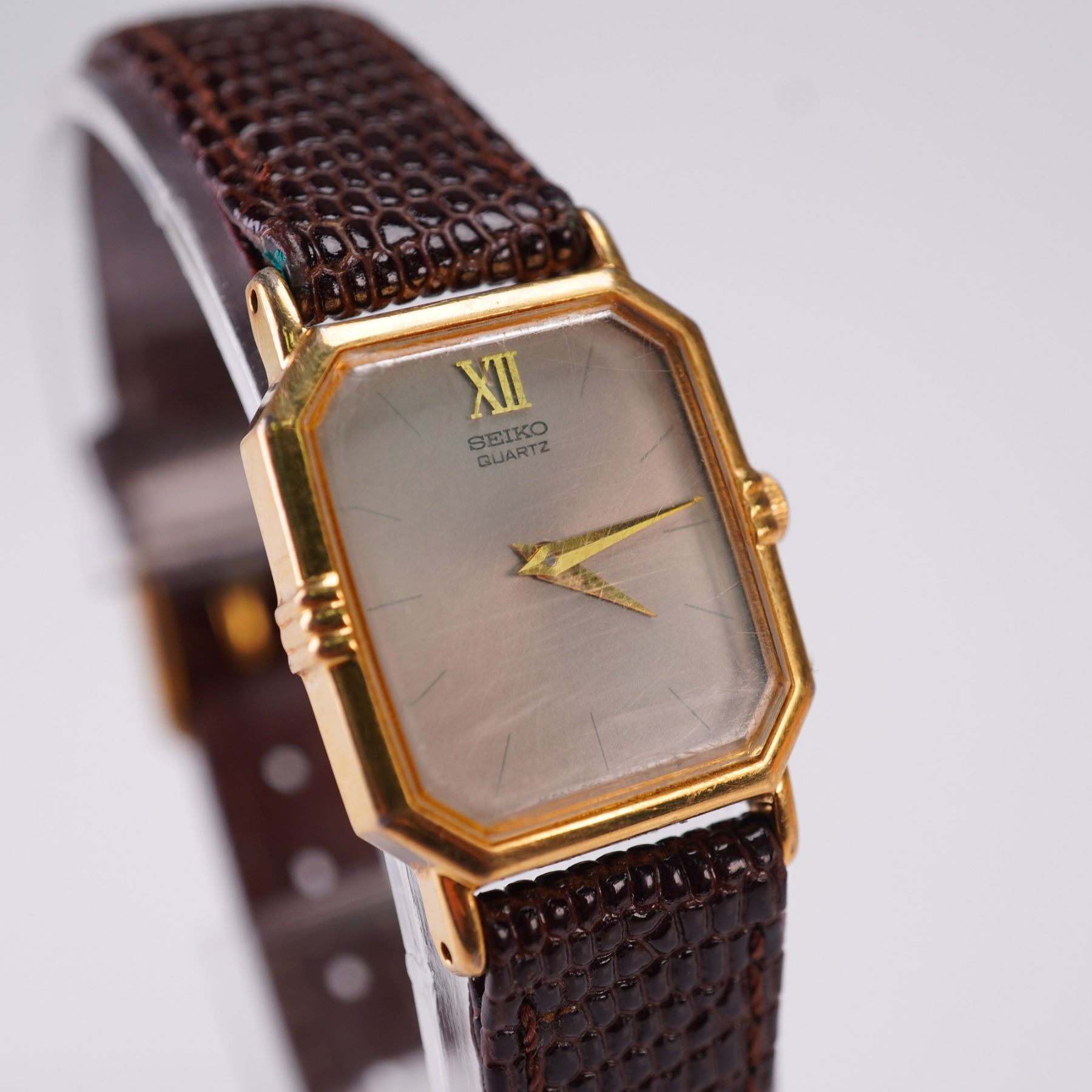 Lot includes two vintage ladies quartz wristwatches. The Casio has a round cream-tone case with a grid dial, red and blue hands, and a cream strap measuring 8.25"L. The Seiko features a rectangular gold-tone case with a brown textured band and Roman numeral dial, band measures 8"L. Watch faces measure approximately 23.6mm and 18.8mm.