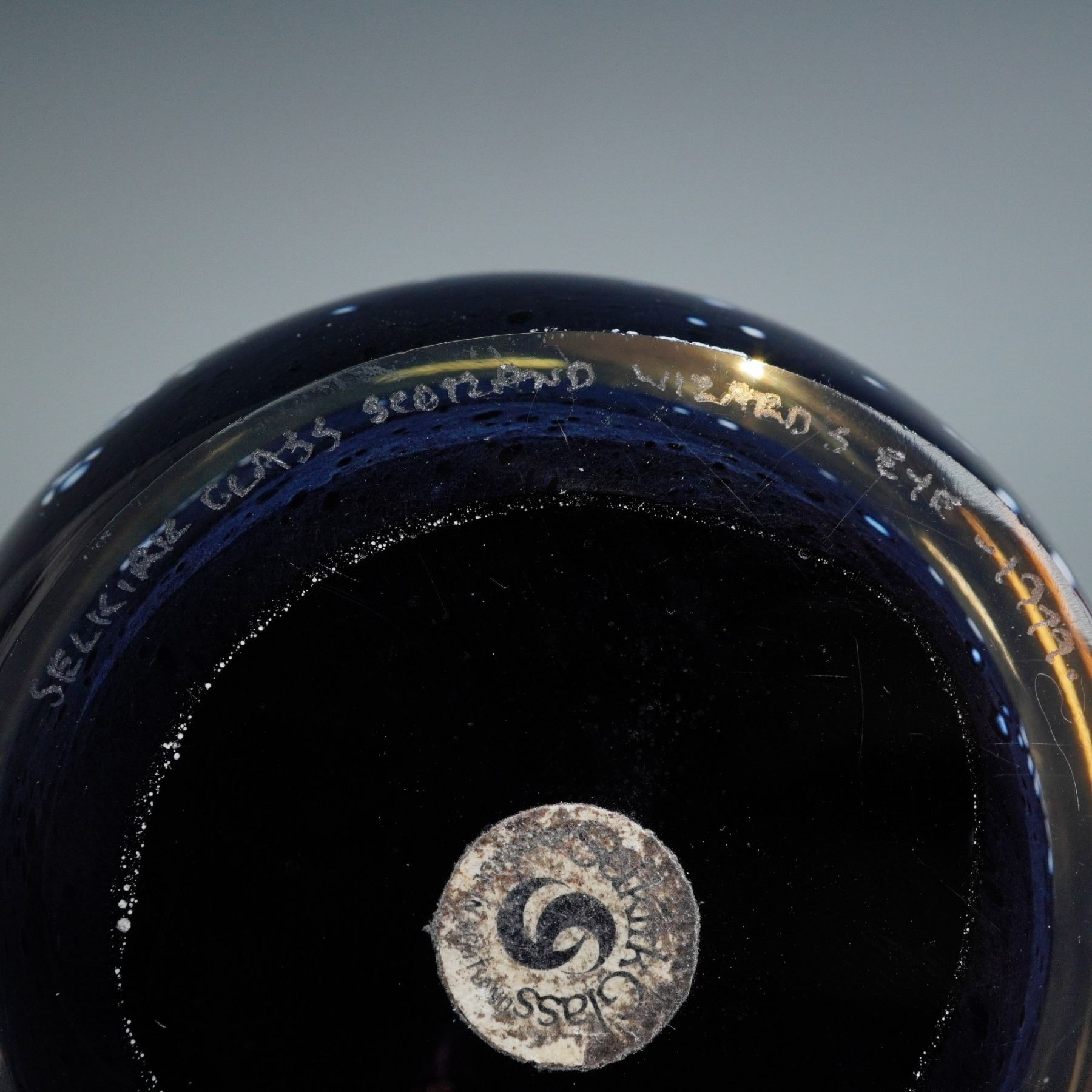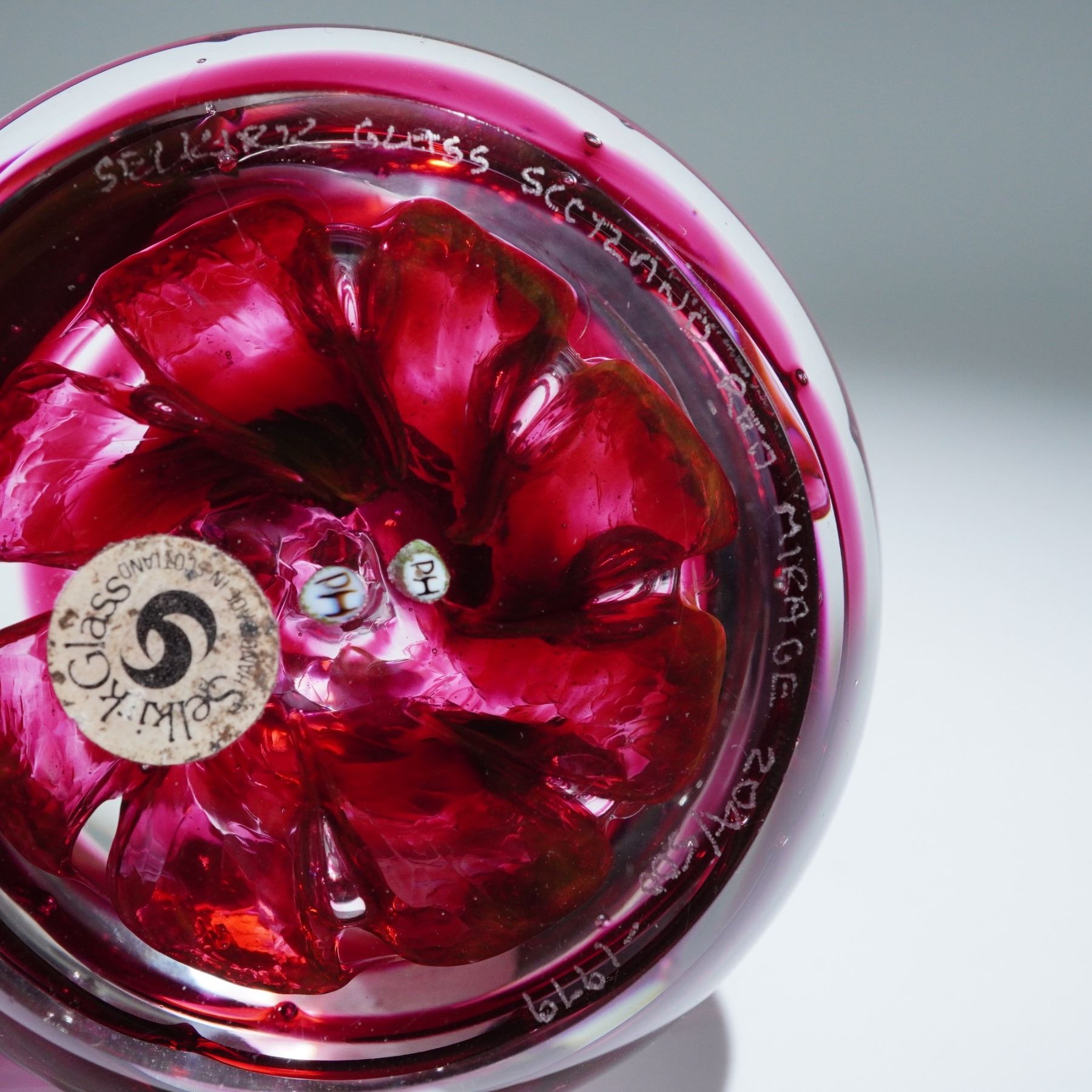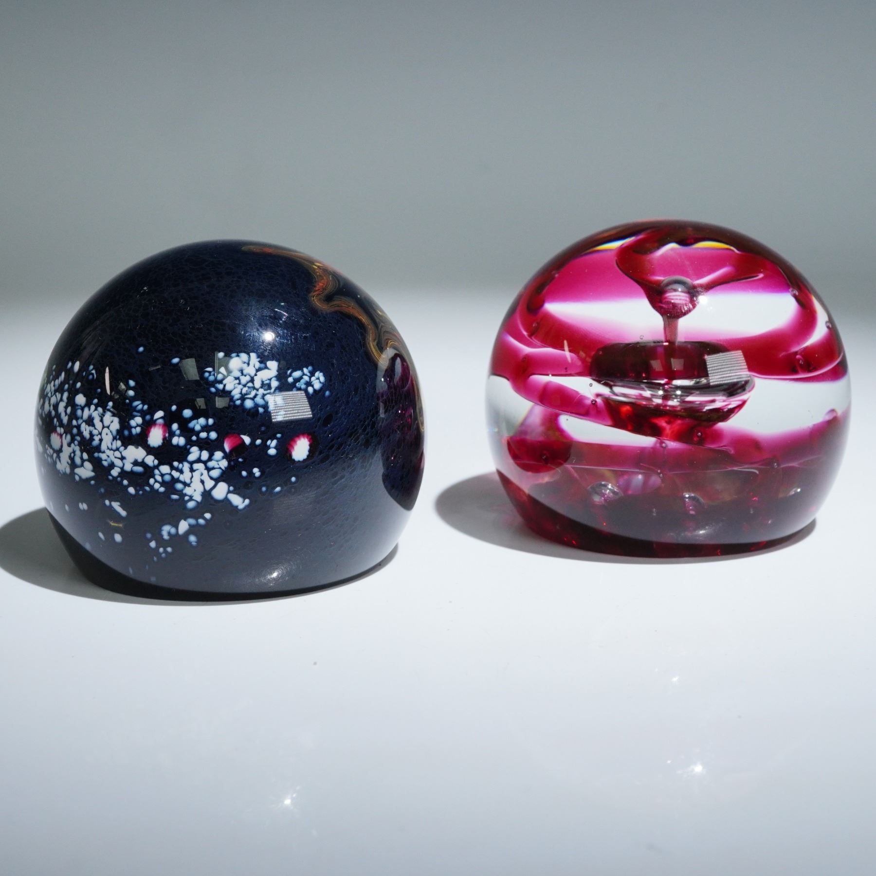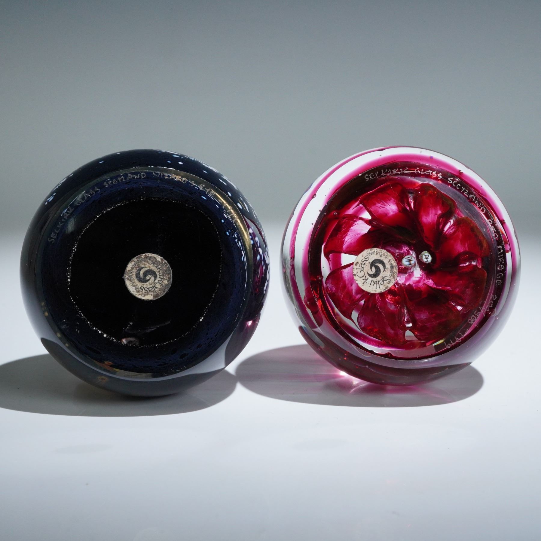 A fine pair of Selkirk Glass paperweights crafted in Scotland, both dated 1979. The first, titled Red Mirage, is a limited edition piece numbered 204 of only 500 produced, featuring an elegant swirling pattern in vivid crimson suspended within clear glass. The second piece, named Wizards Eye, showcases a deep, mysterious midnight-blue color accented by subtle white and red speckles, evocative of a celestial sky. Both paperweights are clearly signed and labeled by Selkirk Glass, with inscriptions at the base authenticating titles, edition numbers, and date. Excellent condition, highly collectible examples of vintage Scottish art glass.