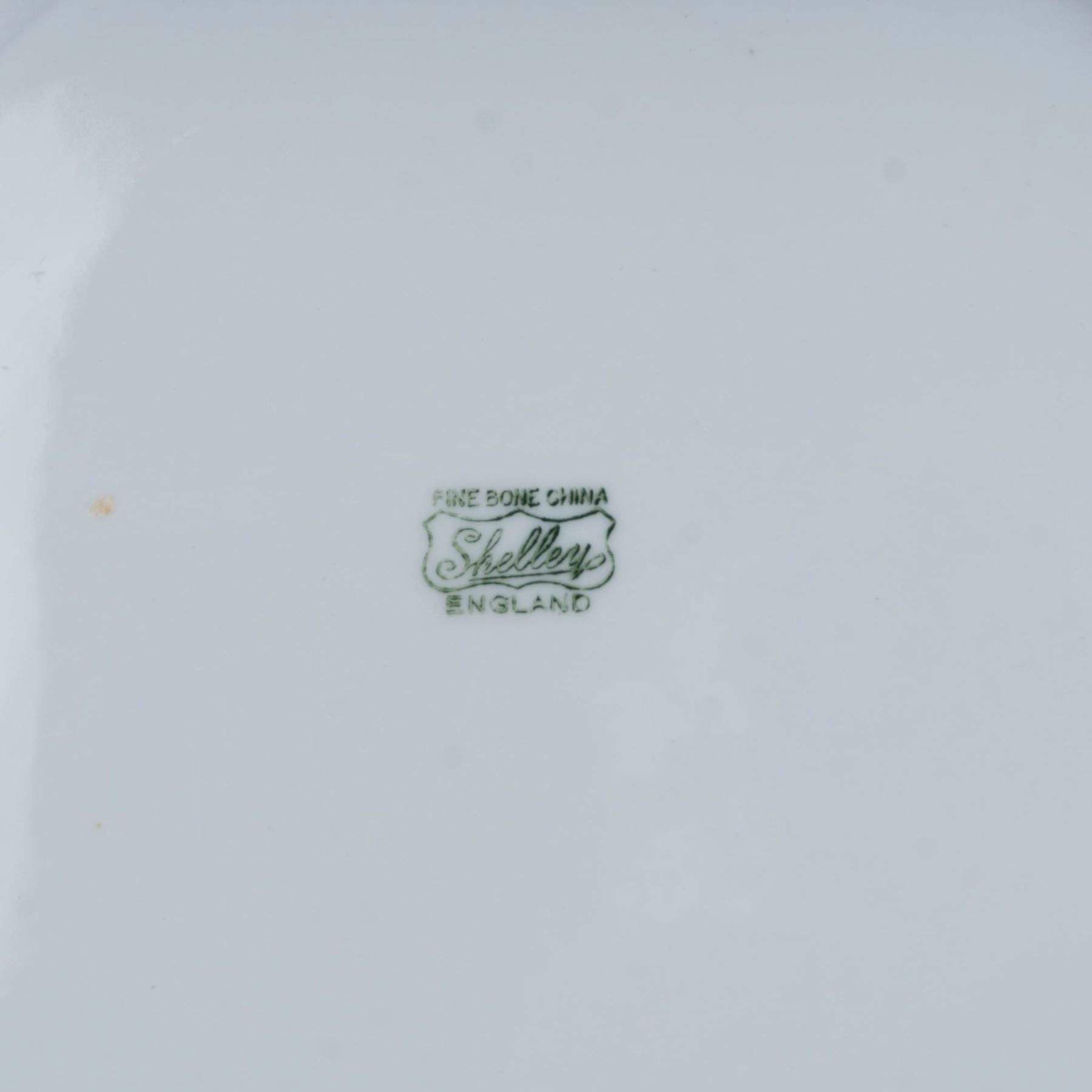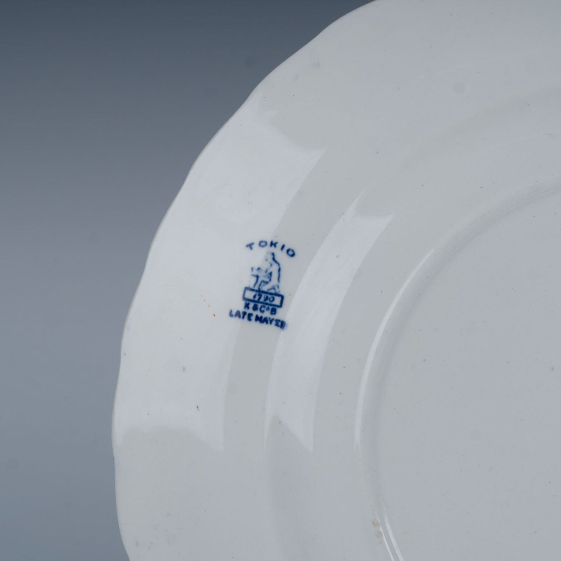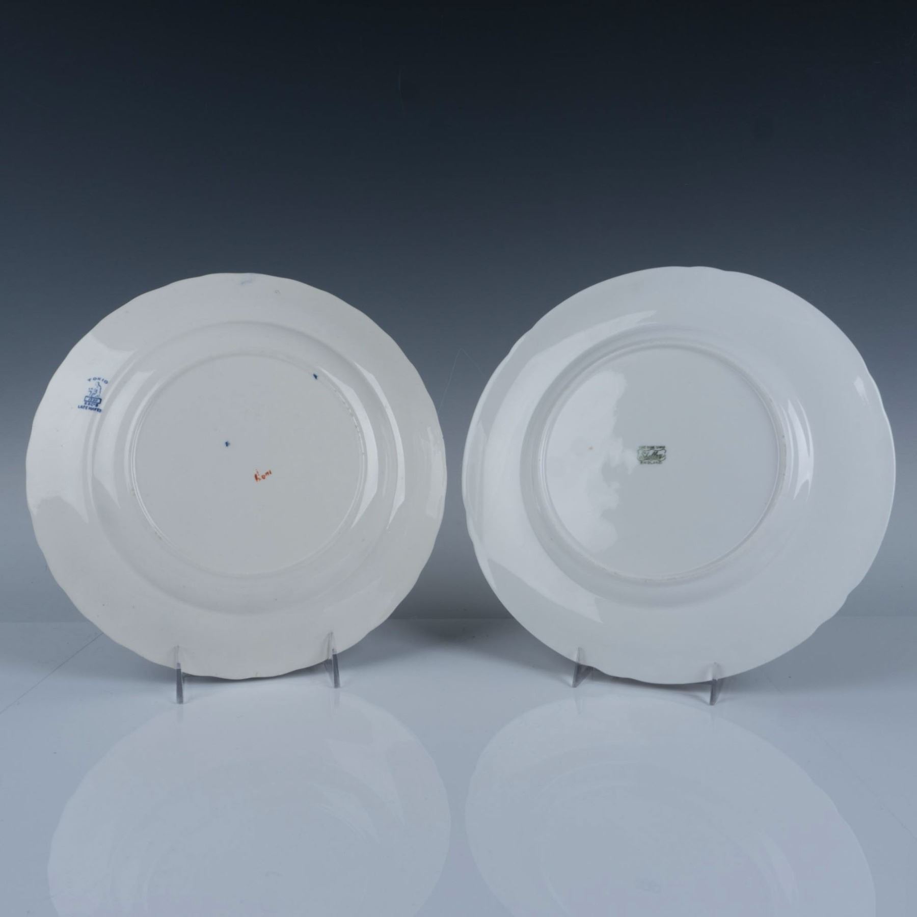 Fabulous duo of white plates with floral designs that includes a Shelley Spring Bouquet dinner plate with a Shelley Fine Bone China backstamp 10.75" dia., and a Keeling and Co Tokio Blue dinner plate with a Tokio backstamp 10.5" dia.