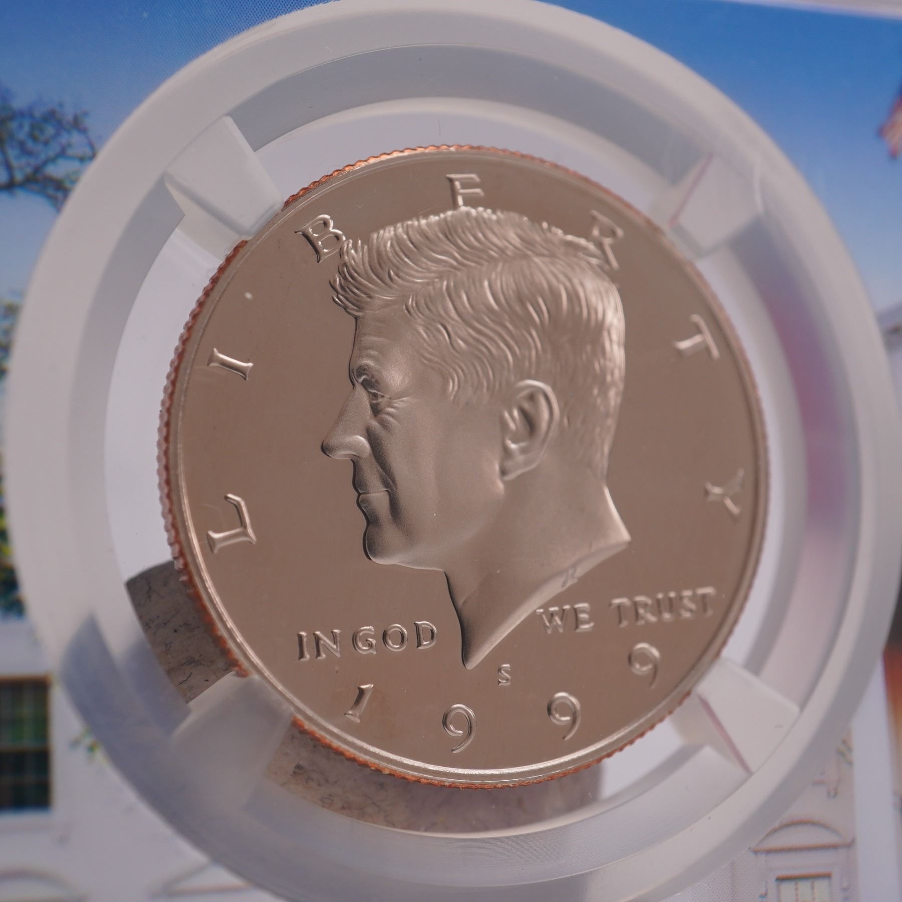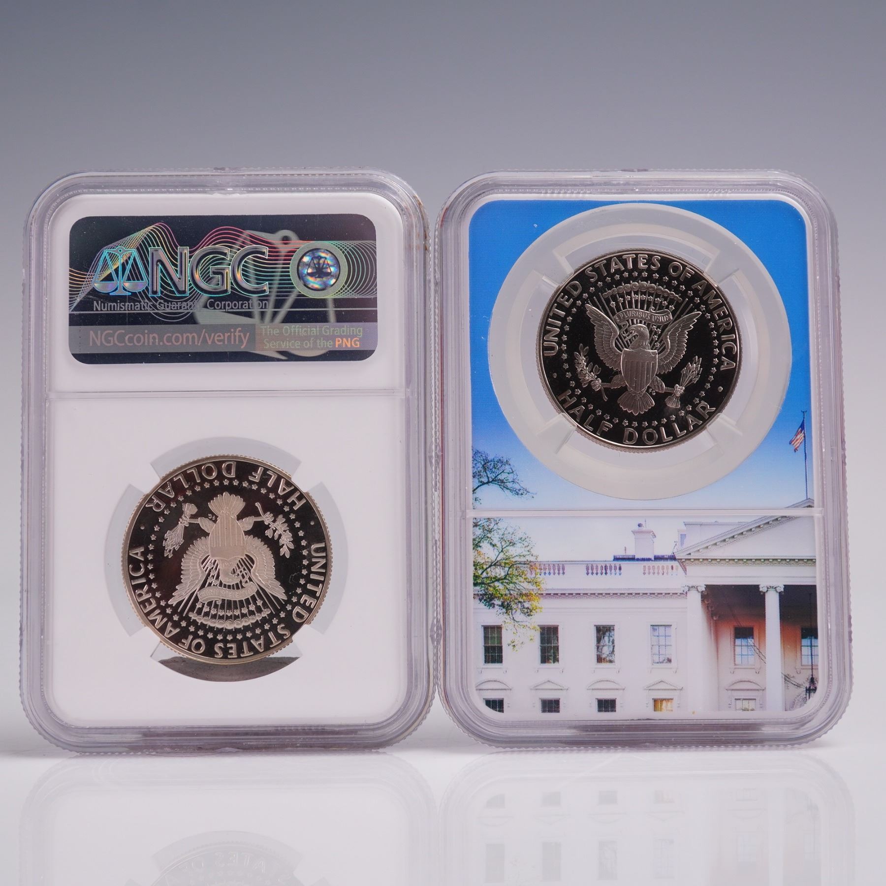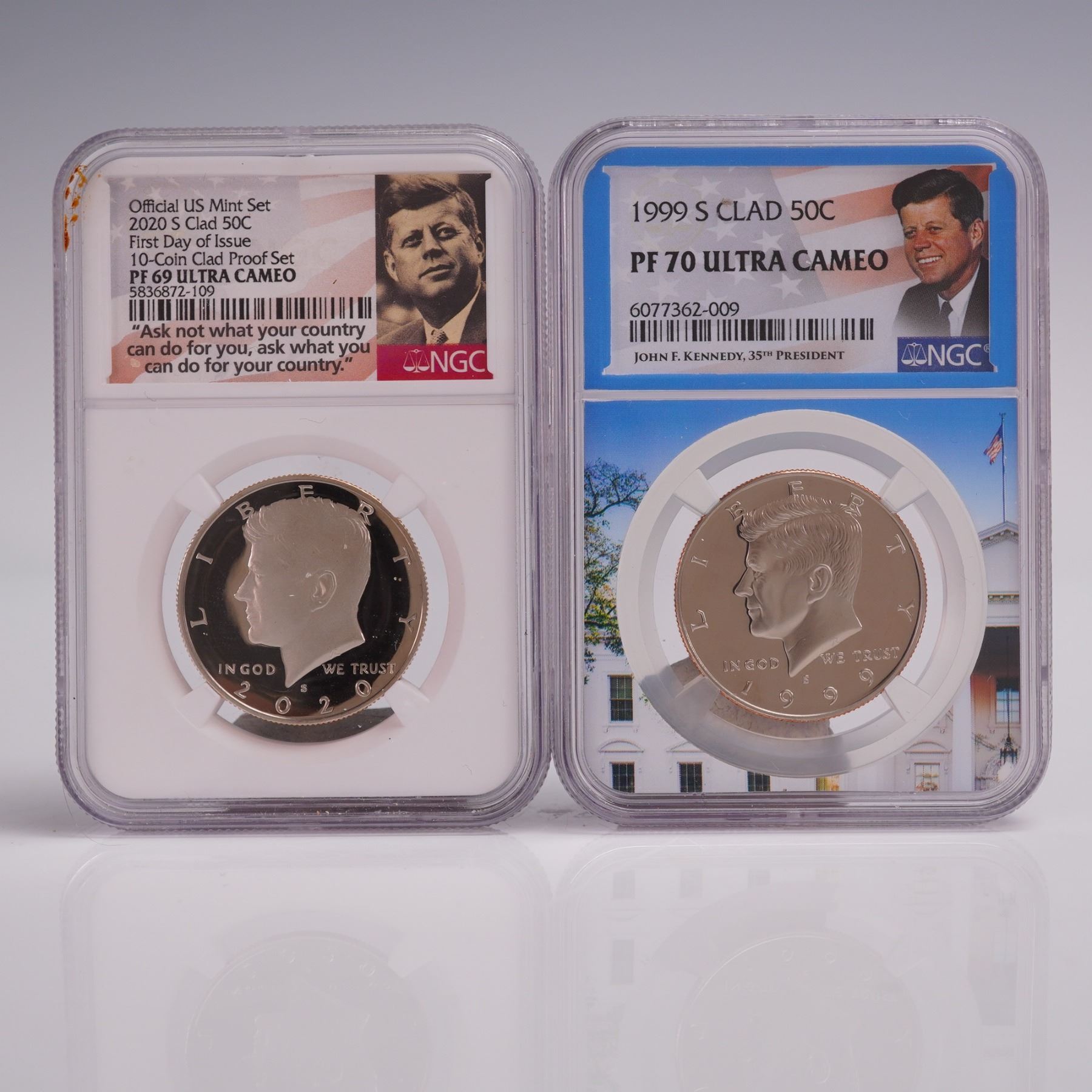 This two-coin lot features a pair of NGC-certified Silver Kennedy Half Dollars from 1999 and 2020, each struck to proof standards with exceptional detail and contrast. The first coin is a 1999-S Silver Kennedy Half Dollar graded PF 70 Ultra Cameo by NGC. Composed of Silver (.900), this flawless proof displays a deeply mirrored field and sharply frosted design elements. The obverse shows the bust of President John F. Kennedy with inscriptions LIBERTY, IN GOD WE TRUST, S, and the date 1999, engraved by Gilroy Roberts. The reverse features the American Presidential Coat of Arms with a heraldic eagle holding an olive branch and arrows, and a scroll inscribed with E PLURIBUS UNUM. Surrounding the eagle are the inscriptions UNITED STATES OF AMERICA and HALF DOLLAR. The reverse was engraved by Frank Gasparro. The second coin is a 2020-S Silver Kennedy Half Dollar graded PF 69 Ultra Cameo by NGC. Struck in Silver (.999), it was issued as part of the 10-Coin Silver Proof Set and labeled First Day of Issue. The obverse depicts a left-facing portrait of John F. Kennedy, with inscriptions LIBERTY, GR, IN GOD WE TRUST, S, and the date 2020. Like the earlier piece, it was designed and engraved by Gilroy Roberts. The reverse shows a modified presidential seal: a bald eagle with a shield on its chest, grasping an olive branch and a bundle of thirteen arrows, and a scroll with the Latin phrase E PLURIBUS UNUM in its beak. A ring of fifty stars surrounds the design. Lettering includes UNITED STATES OF AMERICA, E PLURIBUS UNUM, FG, and HALF DOLLAR. The reverse was designed and engraved by Frank Gasparro. Both coins are encapsulated in NGC holders with custom Kennedy-themed labels and display a high degree of visual appeal.